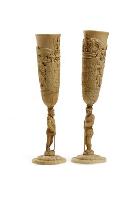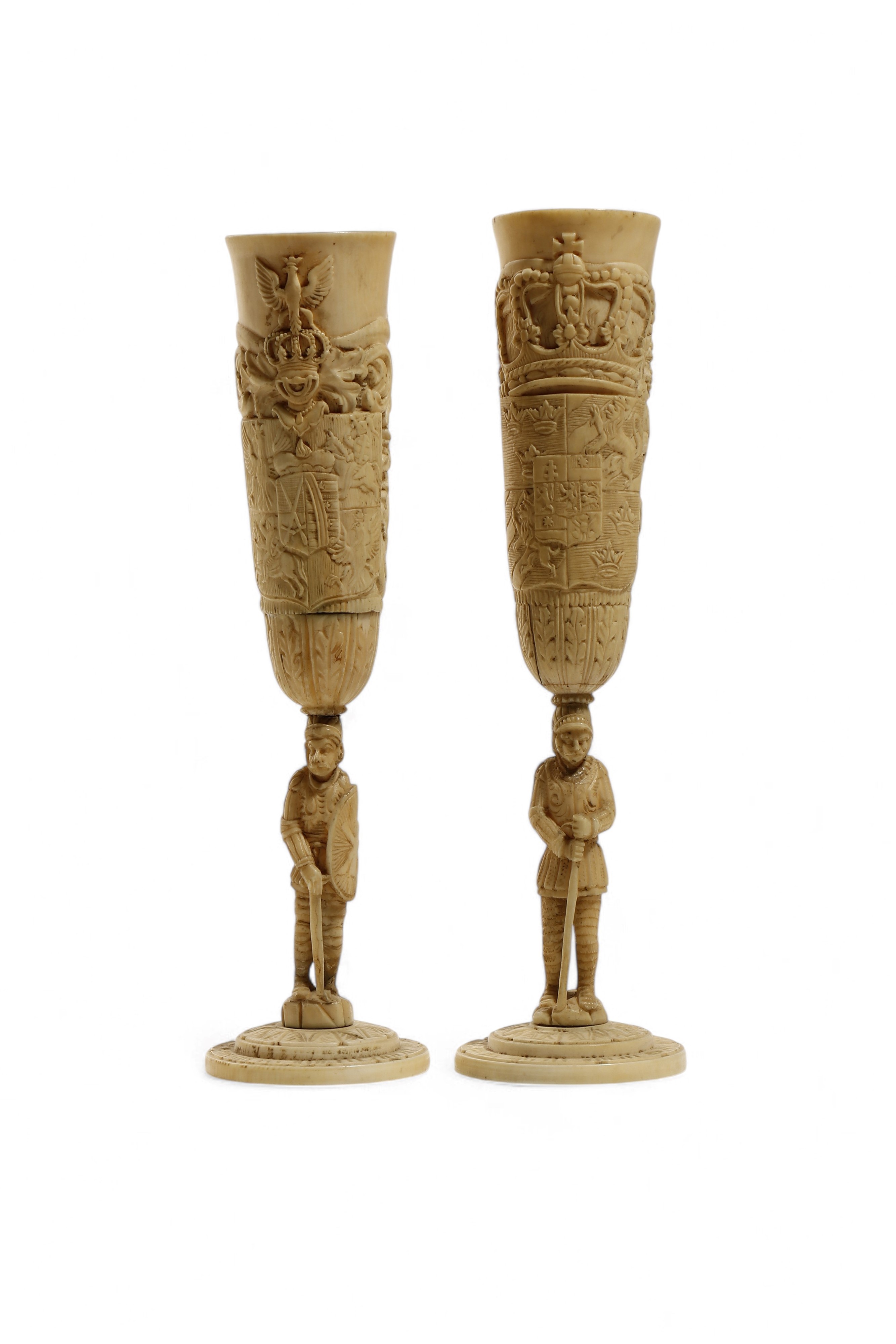 La resa araldica e la tipologia del manufatto fanno pensare a una produzione europea dell’Ottocento, periodo in cui era diffusa la lavorazione dell’avorio per coppe, bicchieri e oggetti da parata con elementi araldici e figure di guerrieri. Si tratta quindi di opere di gusto neo-rinascimentale o storicista, molto apprezzate nel XIX secolo nelle corti e nelle collezioni aristocratiche.