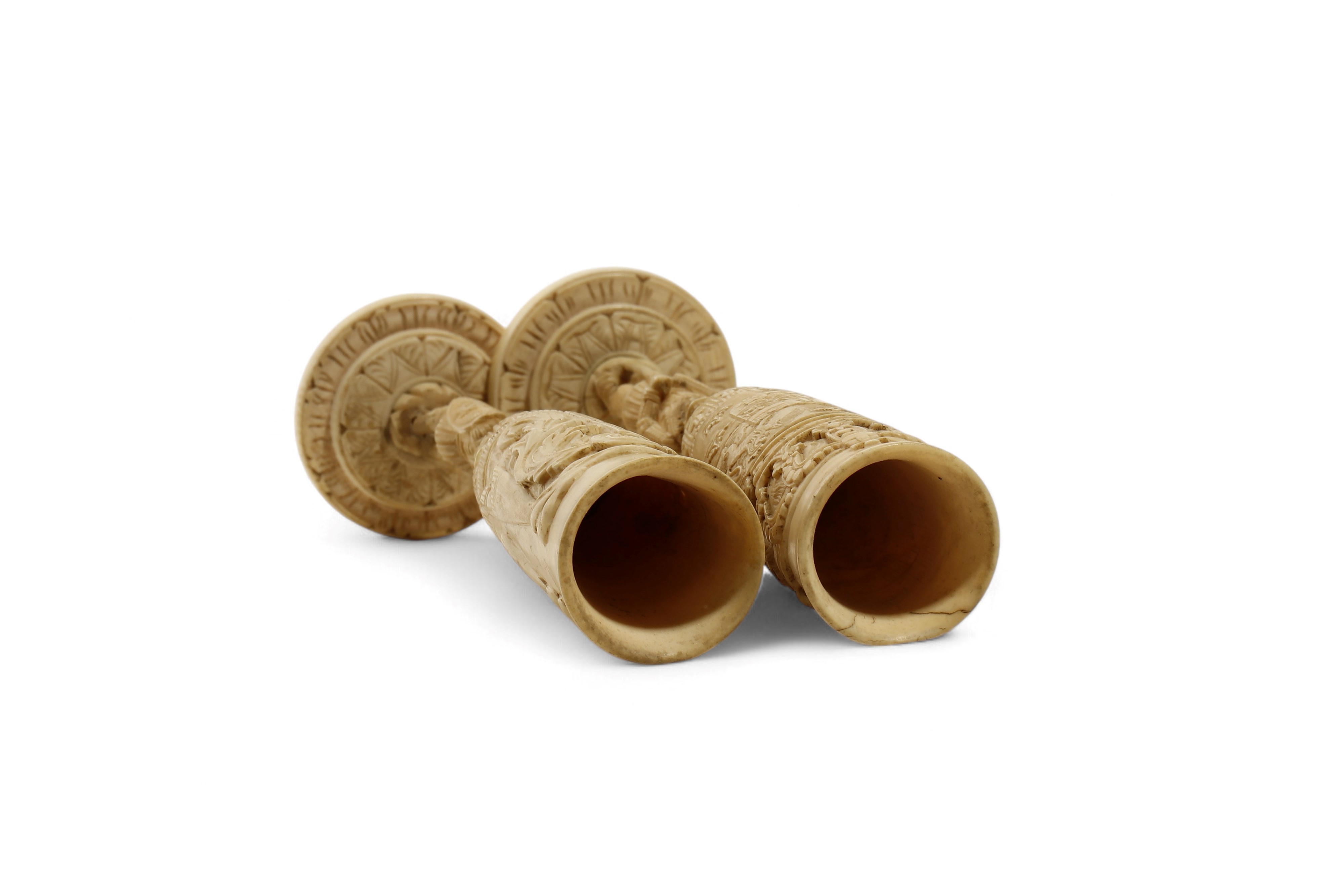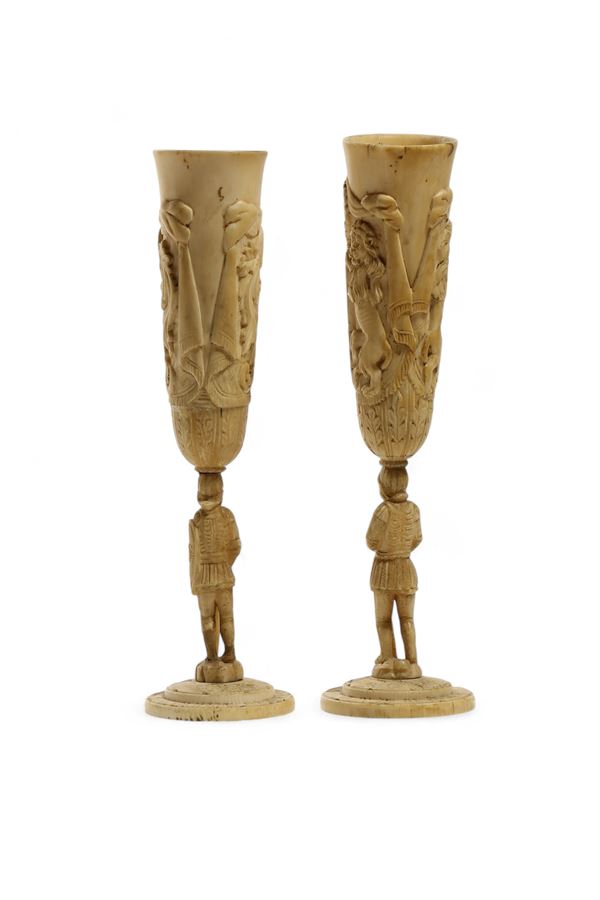 Antica coppia di calici torniti e scolpiti in avorio di elefante (Elephas maximus Linnaeus, 1758 or Loxodonta africana Blumenbach, 1797).