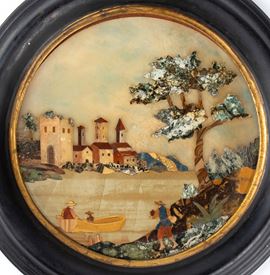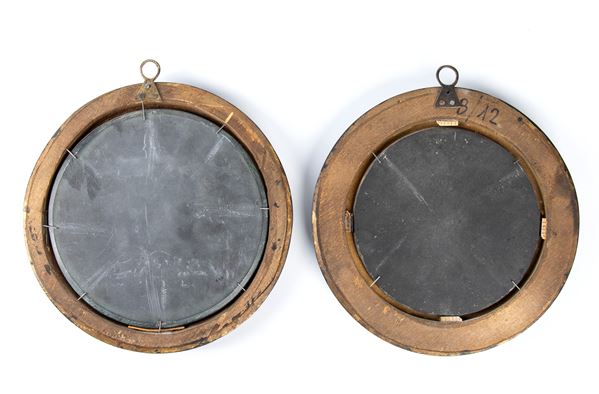 di forma ovale, realizzati con la tecnica del commesso in pietre dure, che combina ardesia, alabastro e altri pietre dure. Entrambe le opere sono incorniciate in ampie cornici ovali in legno nero, dal profilo bombato.