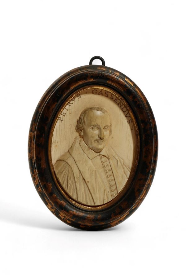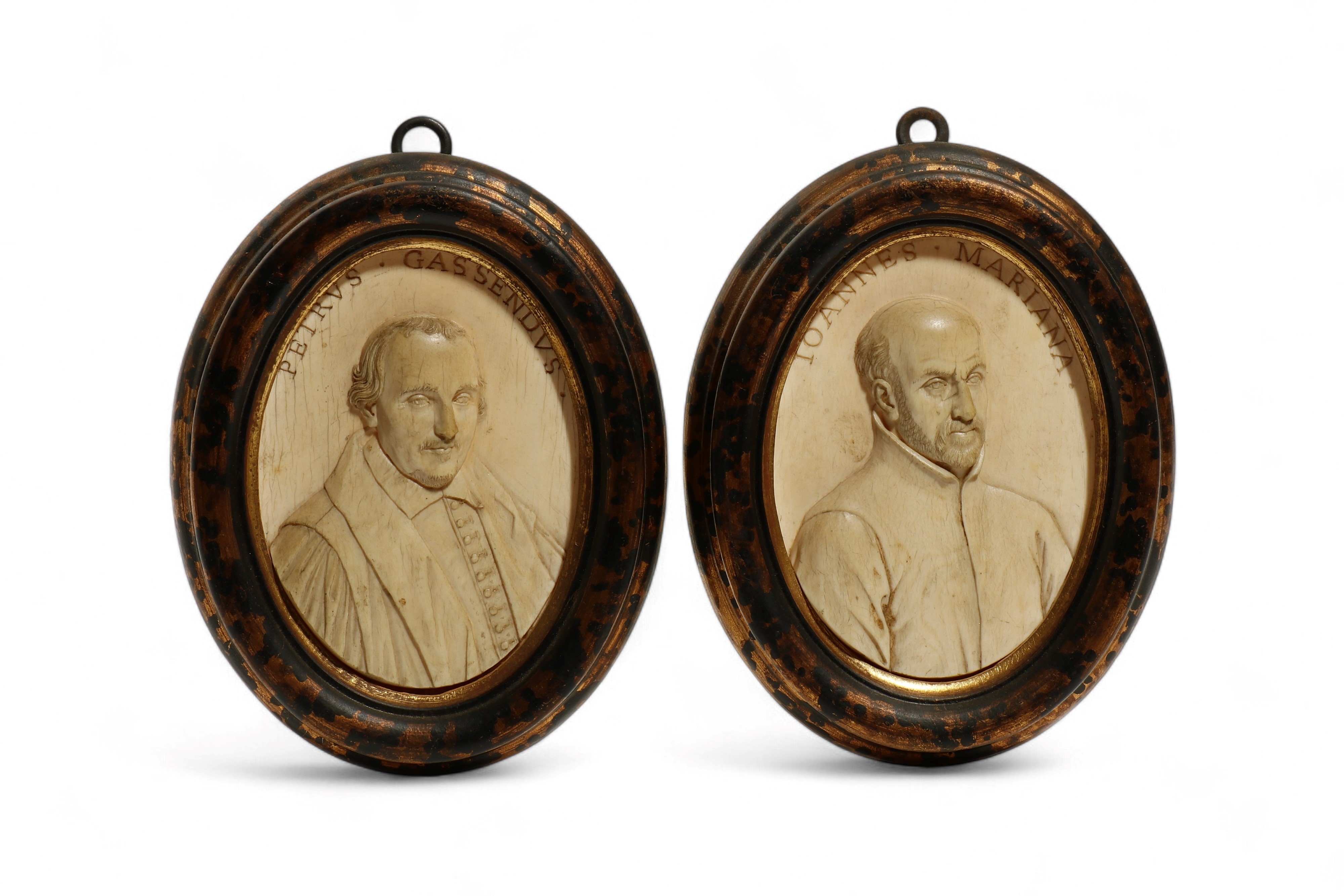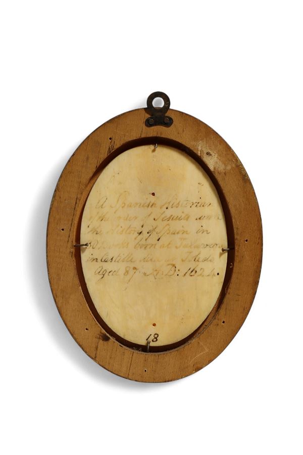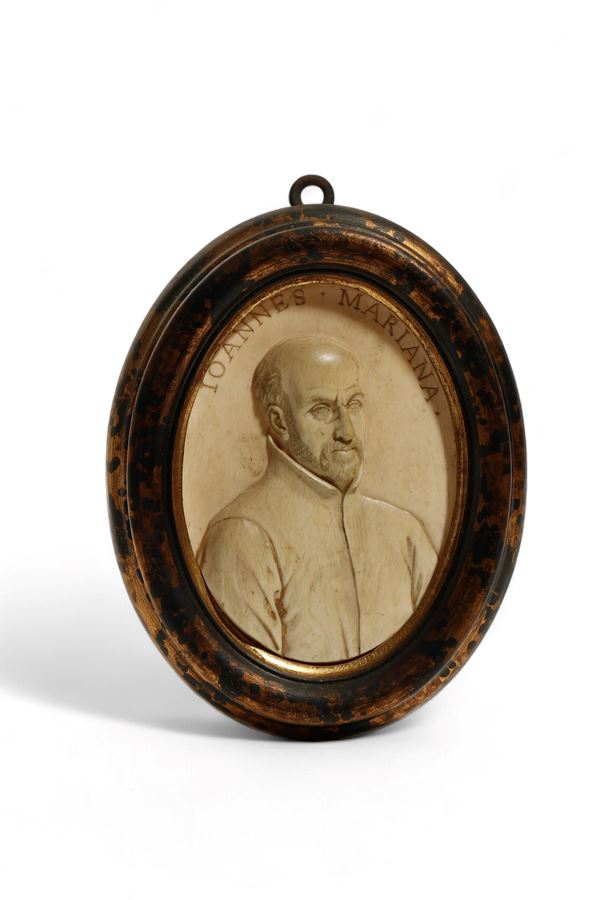 Antica coppia di placchette in avorio di elefante intagliato (Elephas maximus Linnaeus, 1758 or Loxodonta africana Blumenbach, 1797) raffiguranti al recto un busto maschile a rilievo accompagnato da iscrizioni identificative e al verso annotazioni biografiche, entro cornici dipinte in finta tartaruga.