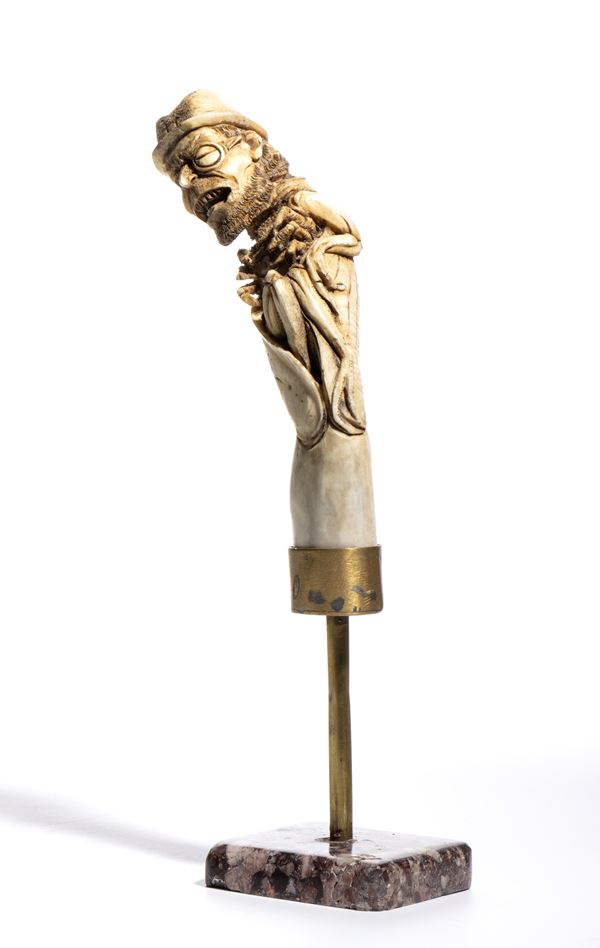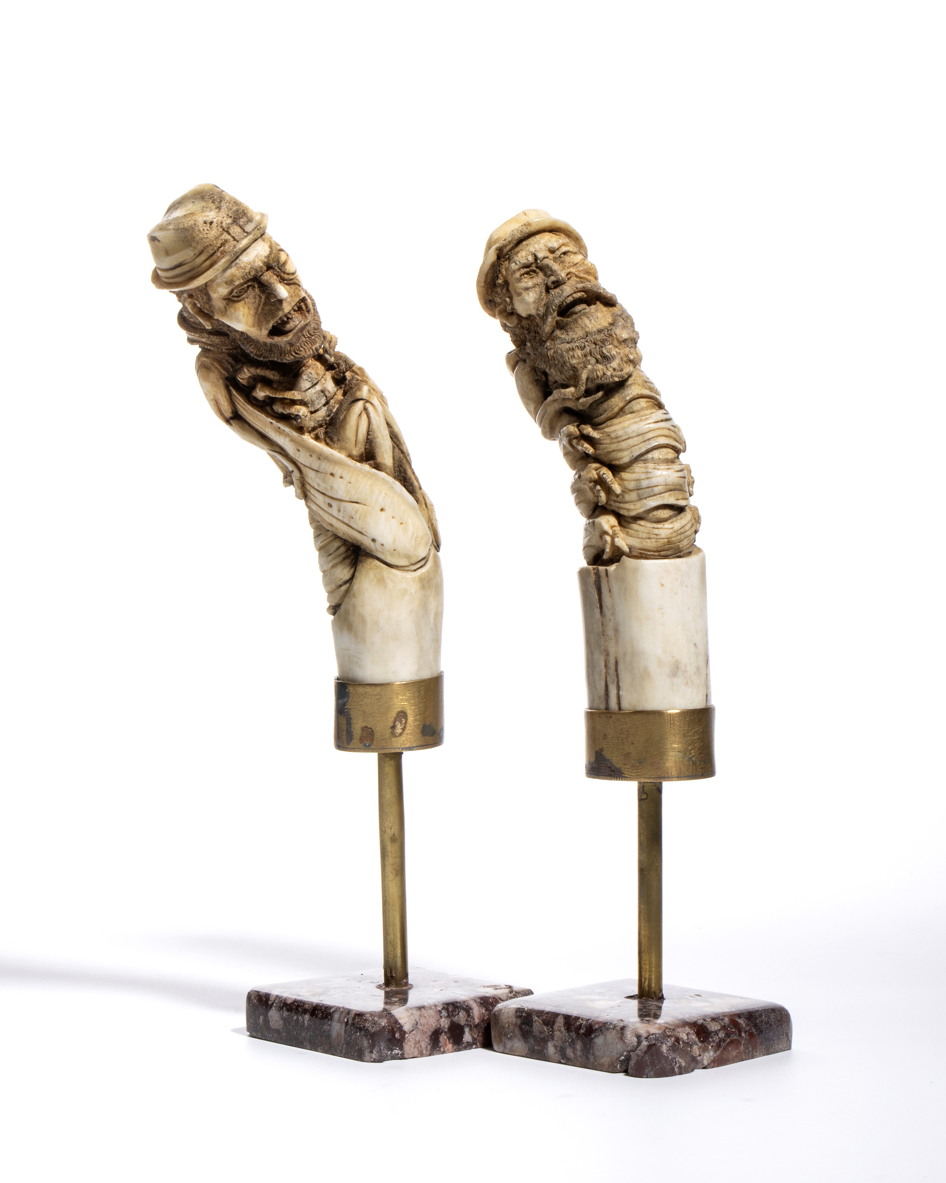 in corna di cervo, montate su basi tornite in ottone con plinti in pietra marmorea. Le due sculture rappresentano personaggi caricaturali, raffigurati con volti fortemente espressivi, barbe folte, sopracciglia marcate e bocche aperte in atteggiamenti vivaci e teatrali. I copricapi rustici e gli abiti dalle pieghe profonde contribuiscono a intensificare l’effetto satirico e popolare delle figure, volutamente inclinate per suggerire un dialogo ironico tra i due soggetti.