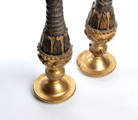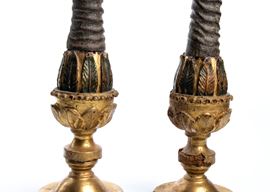 Le basi presentano nella parte superiore una raffinata decorazione a motivi fogliacei, ripetuta anche attorno all’attacco delle corna, quasi a incorniciare l’elemento naturale con un apparato decorativo che lo integra armoniosamente nell’insieme. L’effetto complessivo è quello di un oggetto da collezione o da Wunderkammer, in cui la natura viene nobilitata attraverso l’intervento artistico e la montatura preziosa.