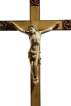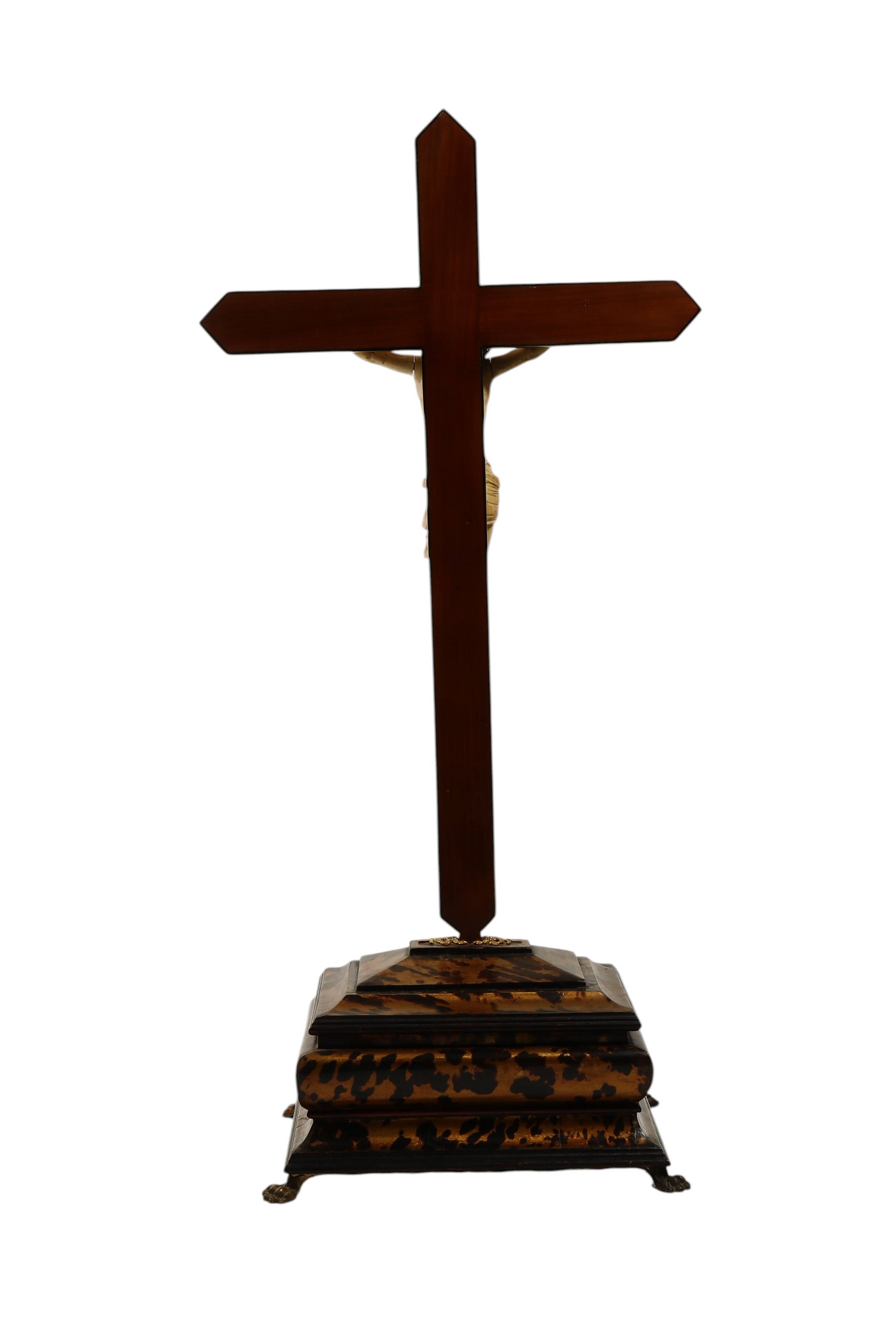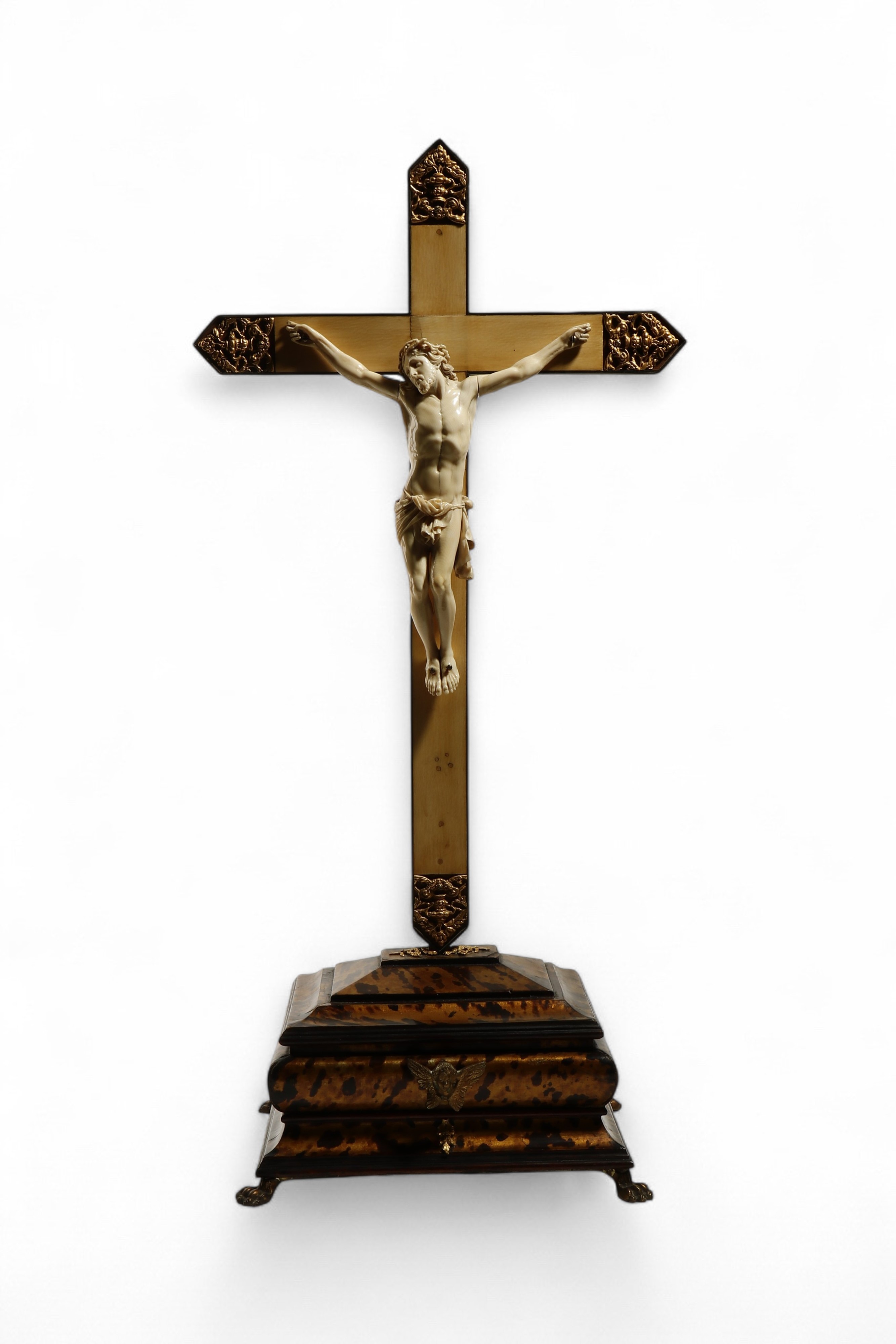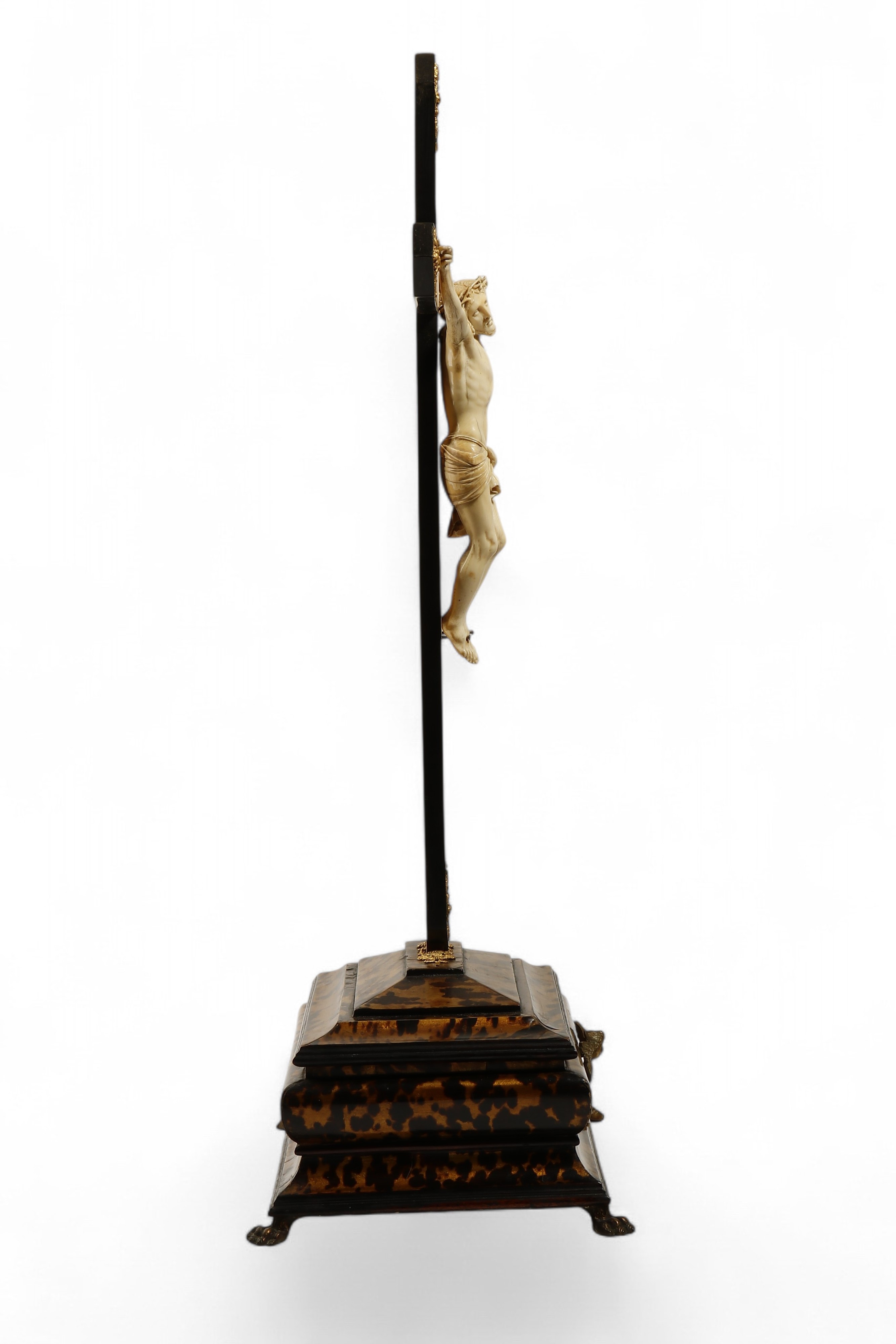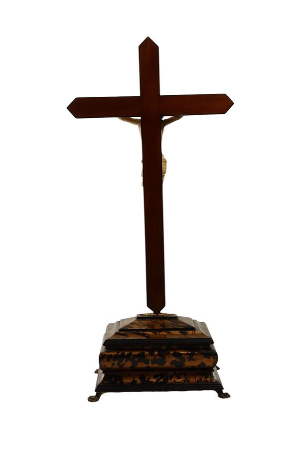L’eleganza della scultura in avorio, la raffinatezza della resa anatomica e la compostezza espressiva denotano un’opera di alta qualità, destinata a una committenza colta e devota. La figura del Cristo può essere ascritta alla produzione italiana del XVIII secolo, mentre la croce lignea e il basamento dipinto in finta tartaruga, arricchiti da inserti in metallo dorato ed elementi ebanizzati, risultano di epoca successiva, verosimilmente della fine del XIX secolo, aggiunti per esaltare e valorizzare la scultura originaria.