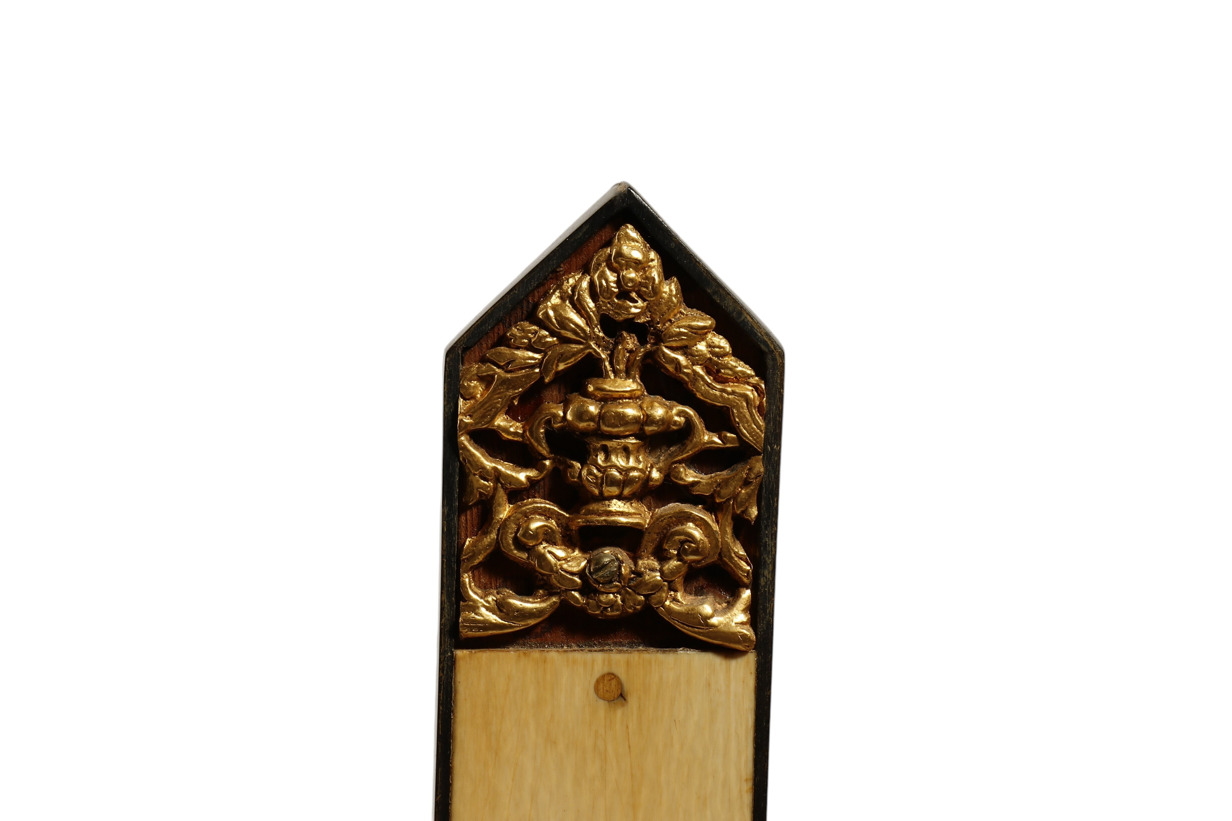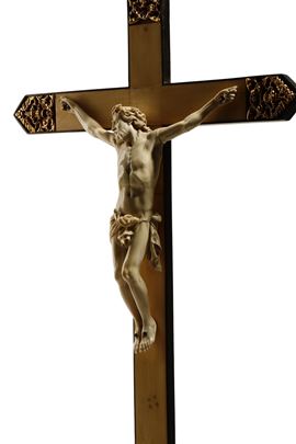 Antico crocifisso in avorio di elefante (Elephas maximus Linnaeus, 1758 o Loxodonta africana Blumenbach, 1797), finemente scolpito a tutto tondo posto su una croce in legno di ciliegio con fronte in avorio e parti laterali lastronate in ebano (Diospyros spp).