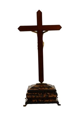 La croce, è montata su una base rettangolare a gradini, poggiante su piedi leonini, dipinta in finta tartaruga e decorata con bordi in legno ebanizzato; completano l’opera alcuni elementi decorativi in metallo dorato e legno.