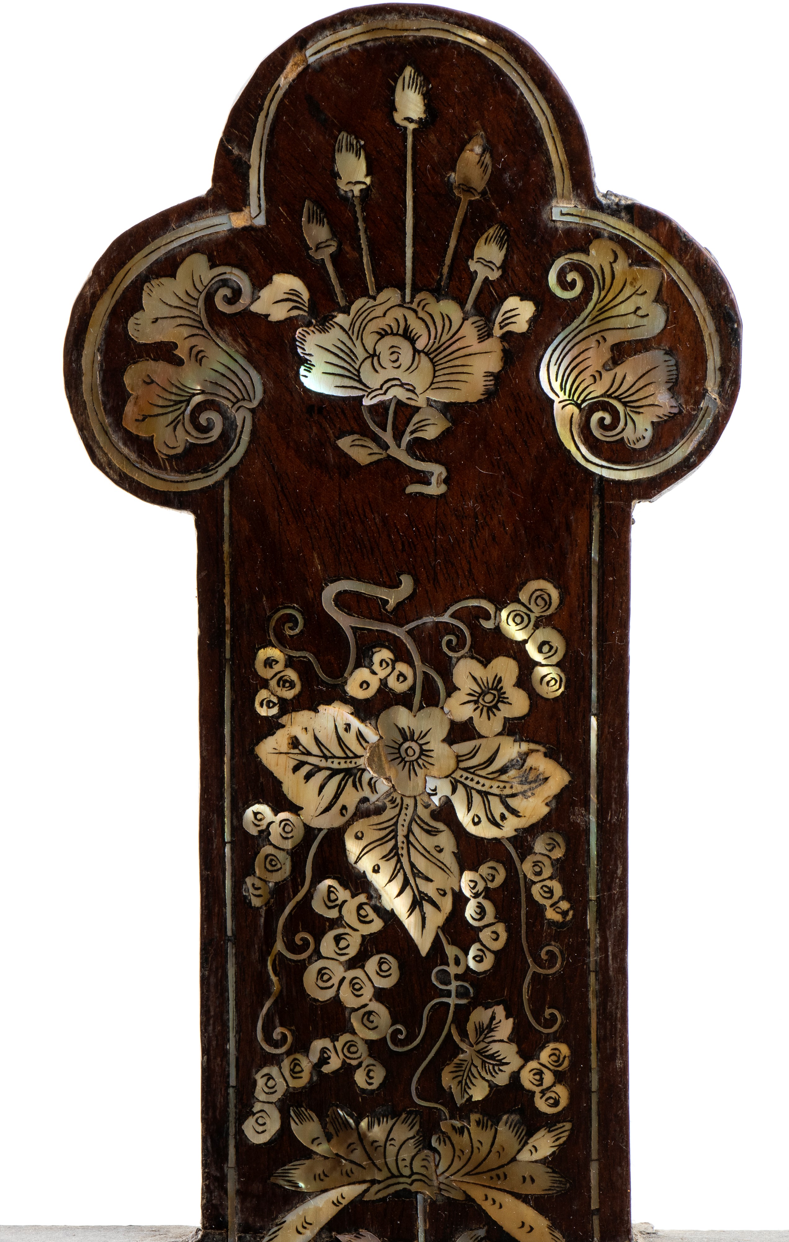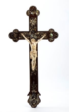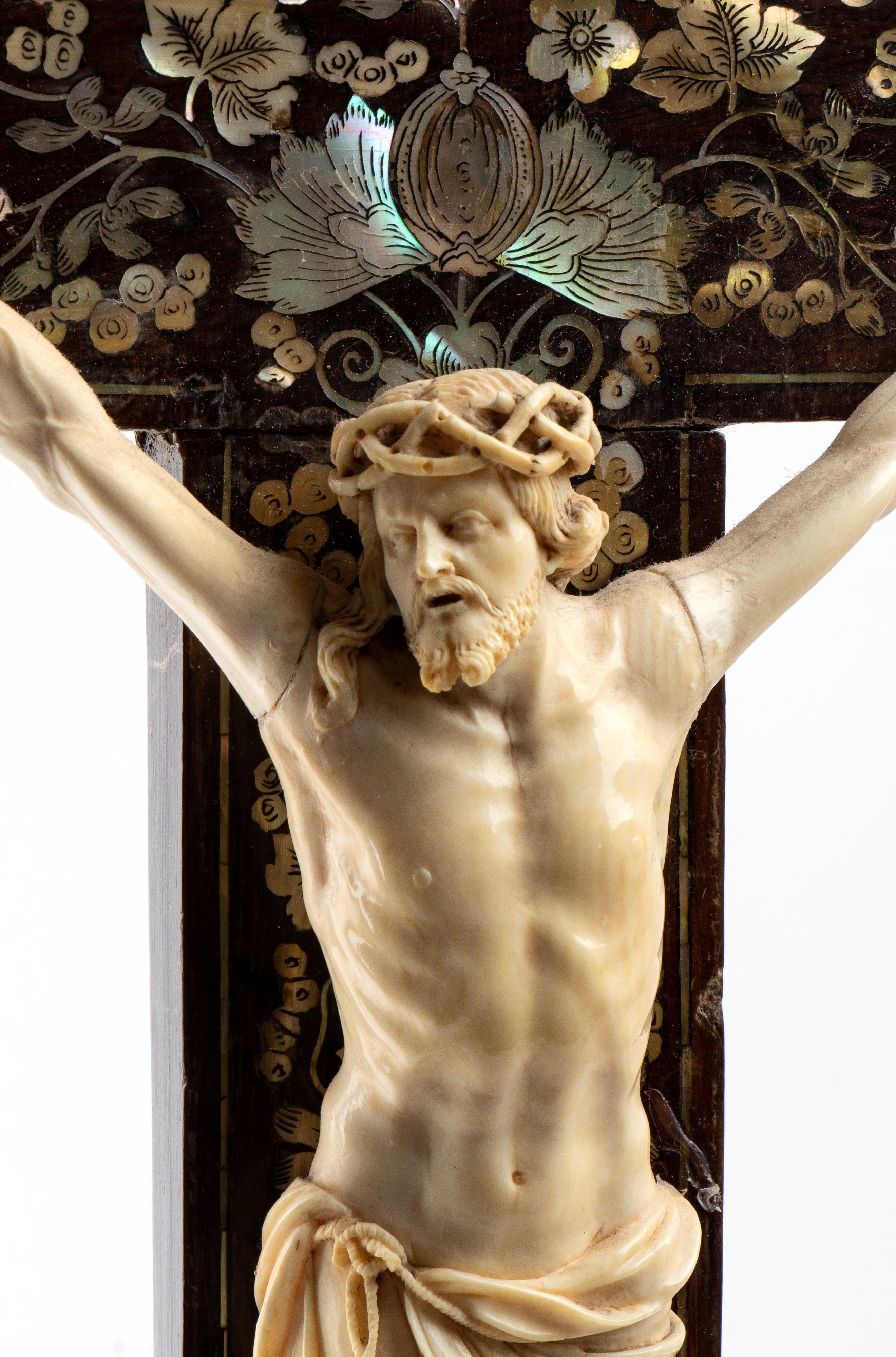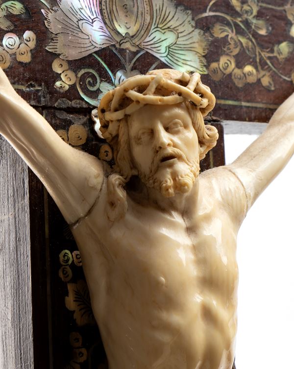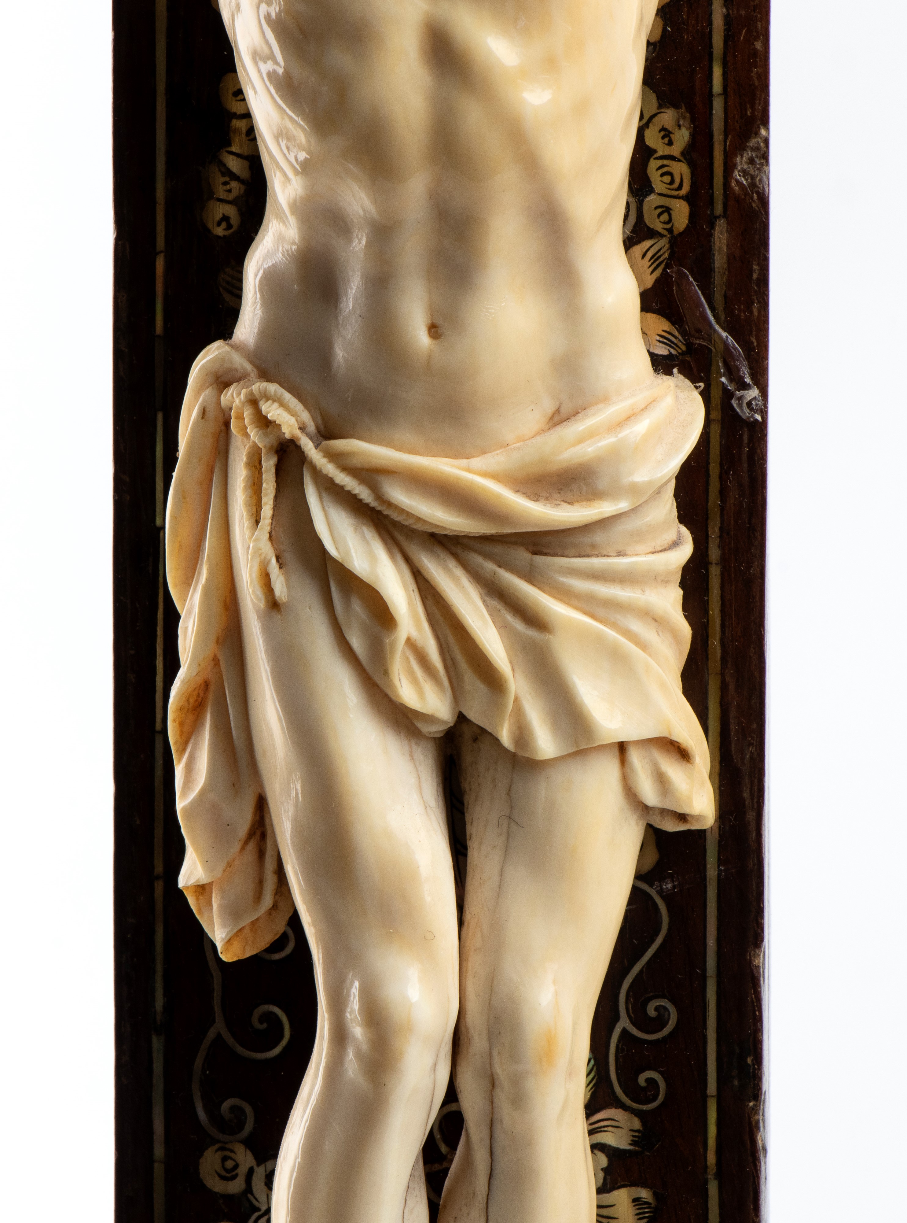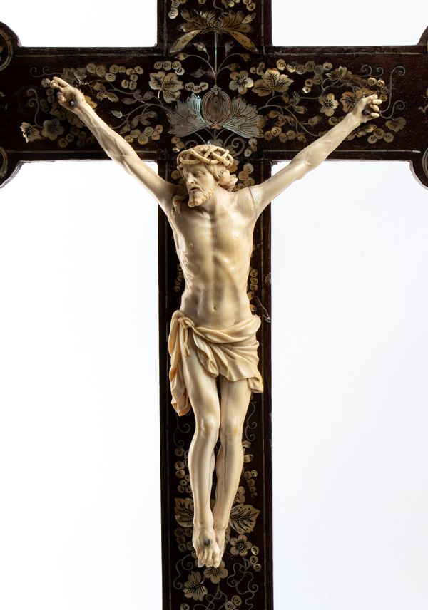 La figura del Cristo scolpita in avorio di elefante, finemente scolpito a tutto tondo e composto da tre parti unite tra loro, il corpo con il perizoma e le braccia. La figura è caratterizzata da un modellato accurato, proporzioni armoniose e un realismo anatomico tipico della scultura devozionale di alta qualità. La croce, in palissandro, è impreziosita da ricchi intarsi in madreperla che formano motivi floreali e ornamentali distribuiti lungo tutta la superficie, culminando in terminali trilobati di gusto barocco.