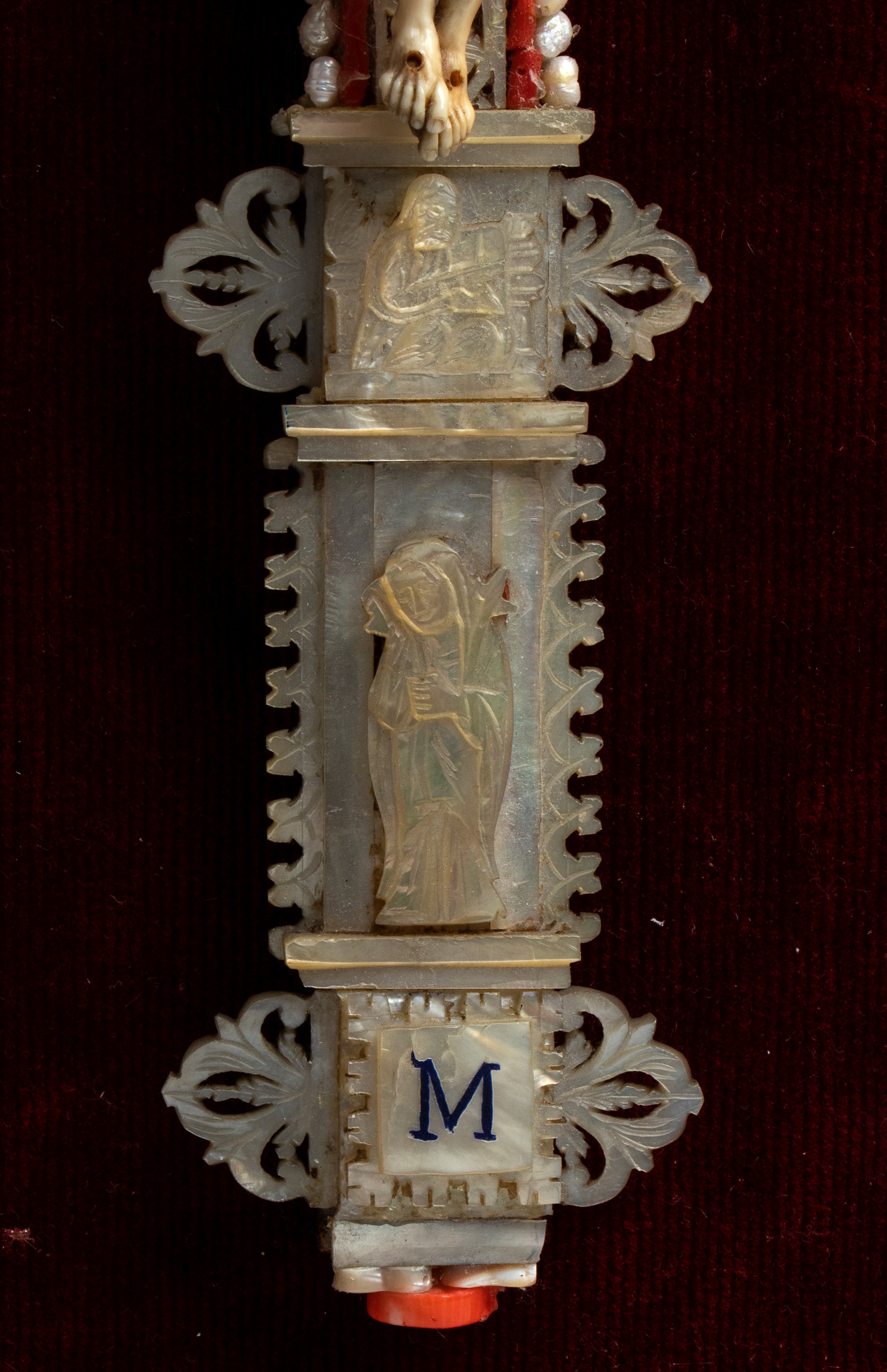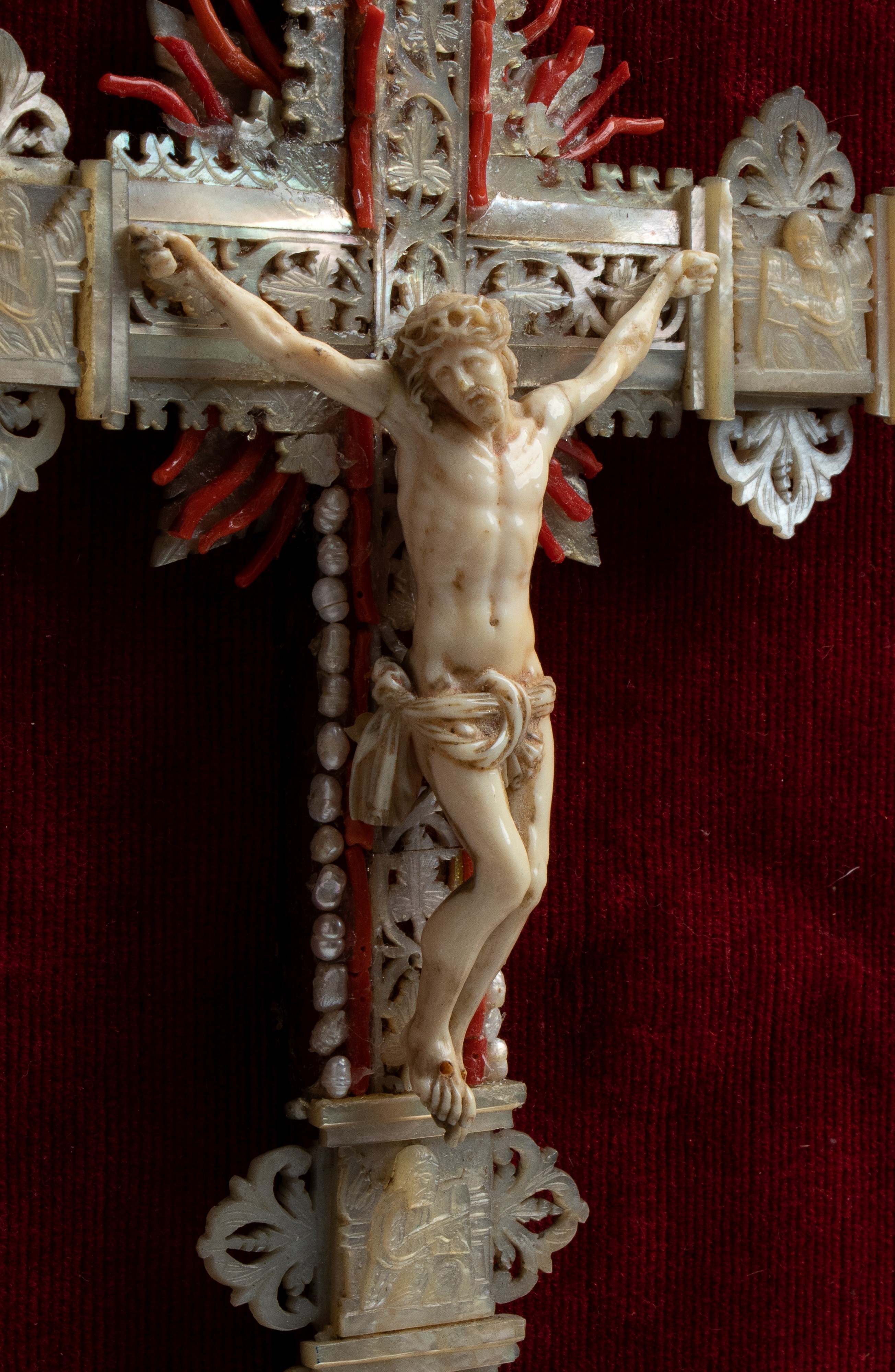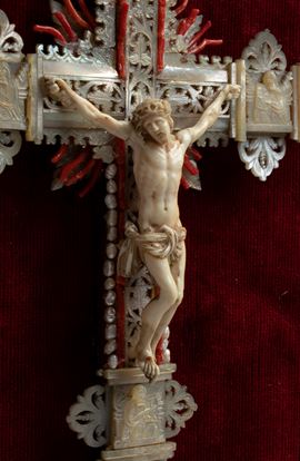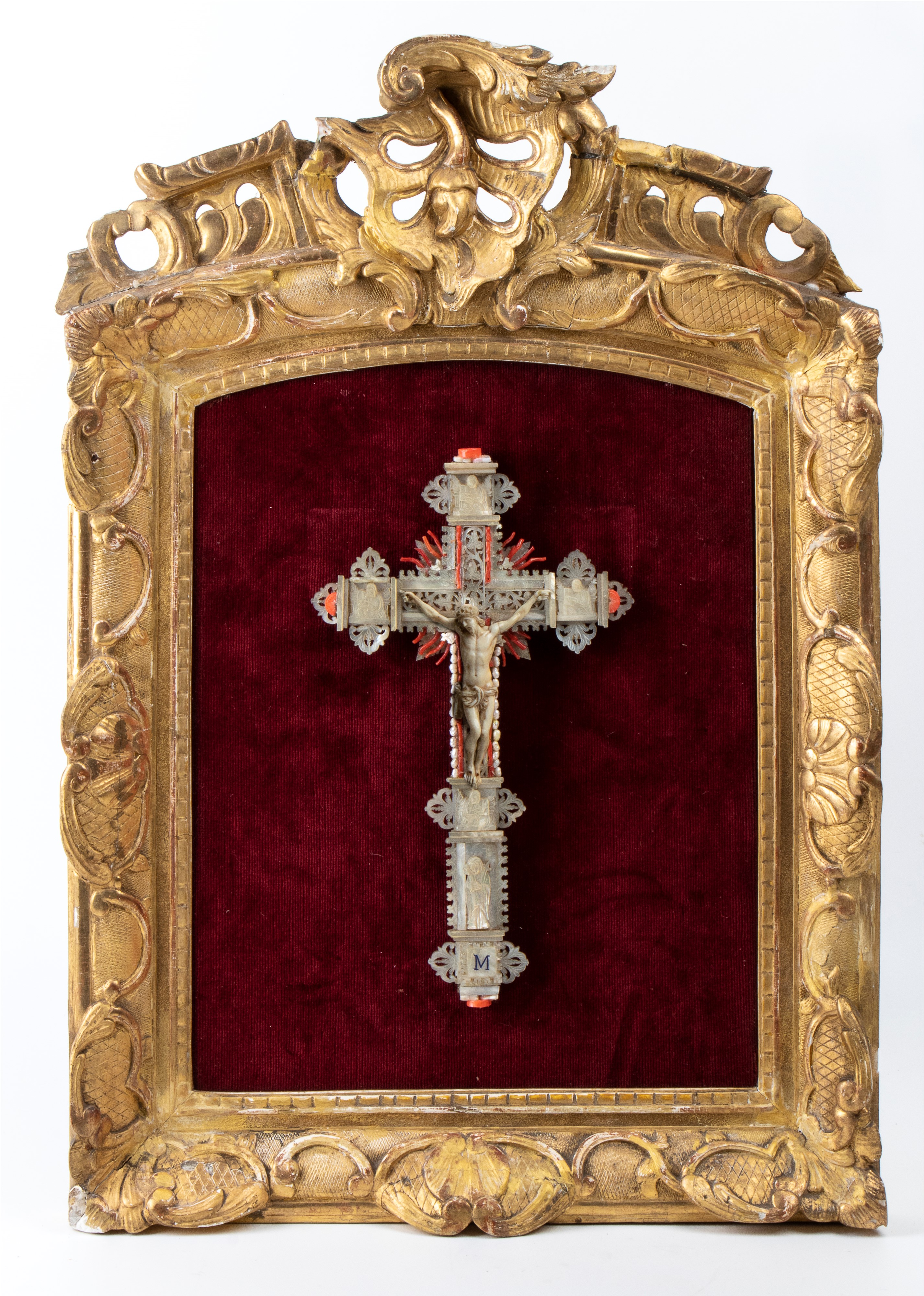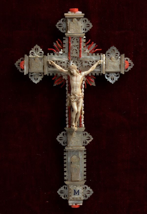 finemente scolpito. Le proporzioni armoniose, l’espressione sofferta ma composta e il panneggio del perizoma, reso con morbide pieghe, contribuiscono a un insieme raffinato. La croce su cui è montata la scultura è interamente rivestita in madreperla, lavorata a traforo e intarsiata con motivi ornamentali tipici degli oggetti devozionali di lusso. Ai terminali e nei punti di raccordo tra i bracci sono inseriti piccoli elementi di corallo rosso. Il crocifisso è inserito in una importante cornice dorata, riccamente lavorata con volute, fogliami e motivi a conchiglia che rimandano a un gusto barocco o rococò. Il fondo in velluto rosso intensifica ulteriormente il contrasto con la croce.