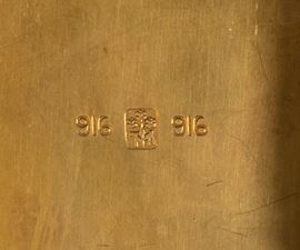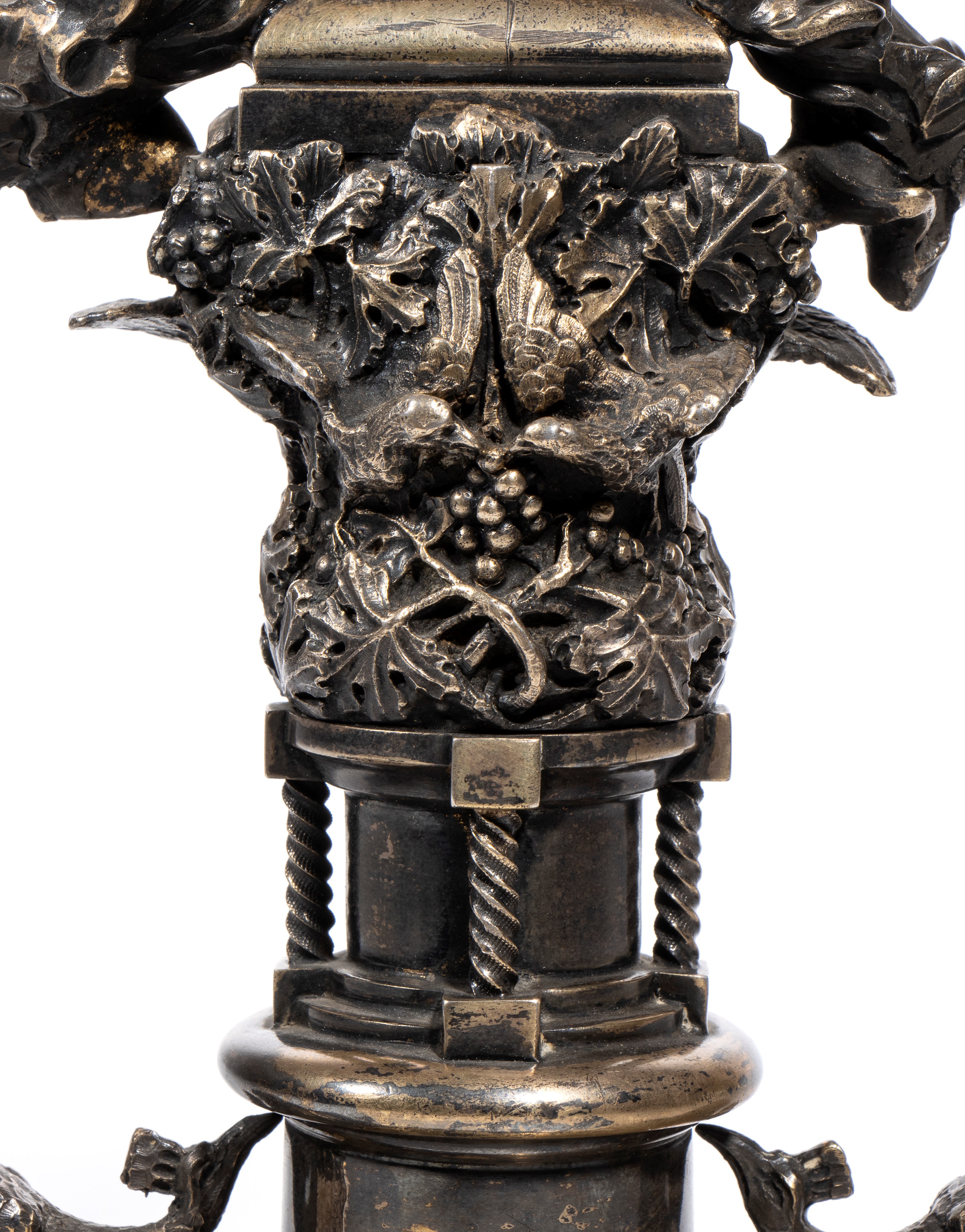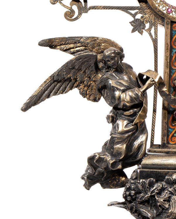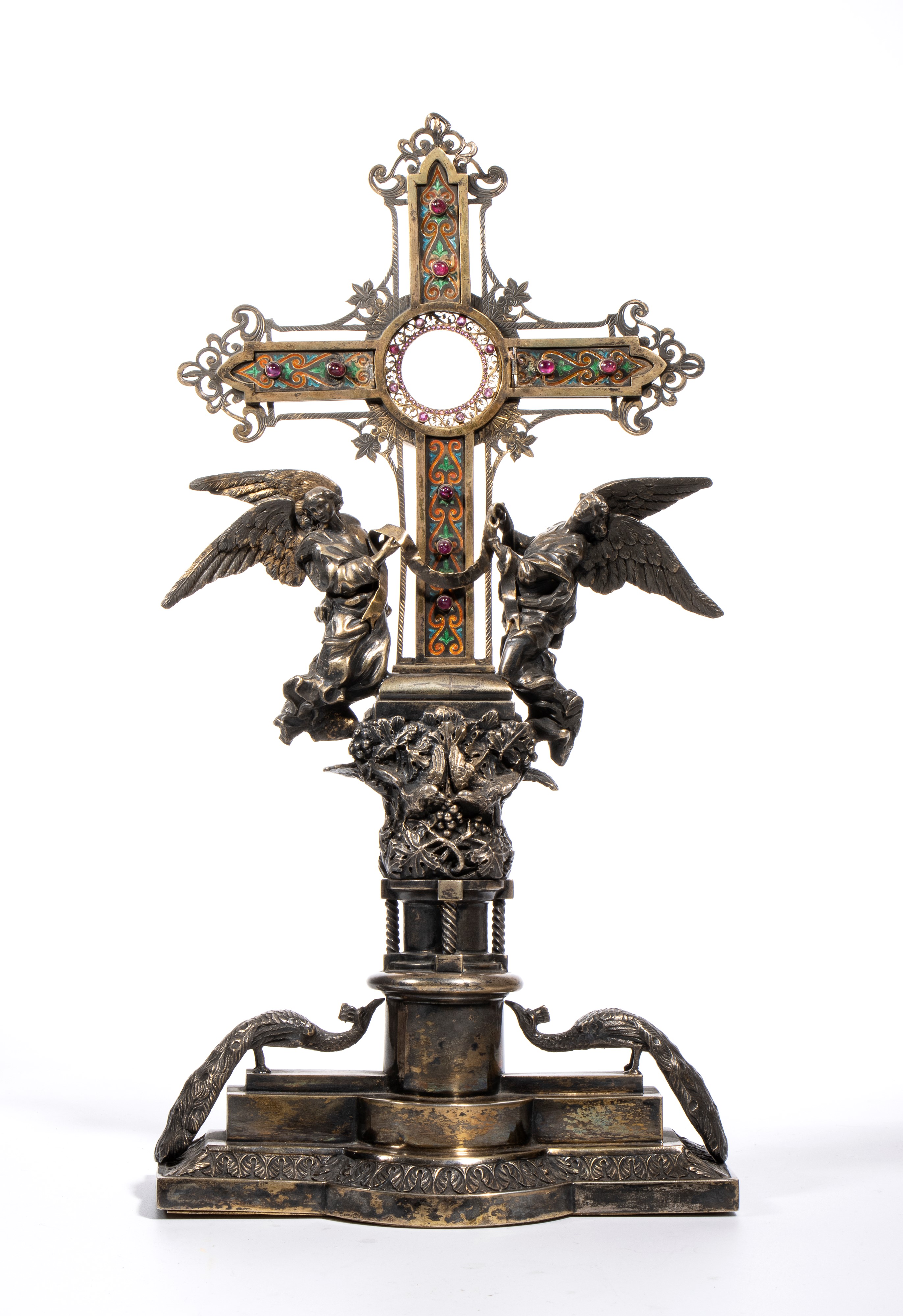 e smalti policromi. La croce superiore presenta un elemento circolare destinato a contenere una reliquia. I bracci sono ornati con smalti policromi e impreziositi da piccole pietre cabochon incastonate. La croce è sorretta da una complessa base: due figure di angeli alati, scolpiti a tutto tondo con panneggi fluidi, si librano al di sotto della crociera, poggiando su una colonna centrale. La base inferiore presenta figure di pavoni, poggianti su una base polilobata con decorazione fogliata lungo il bordo.