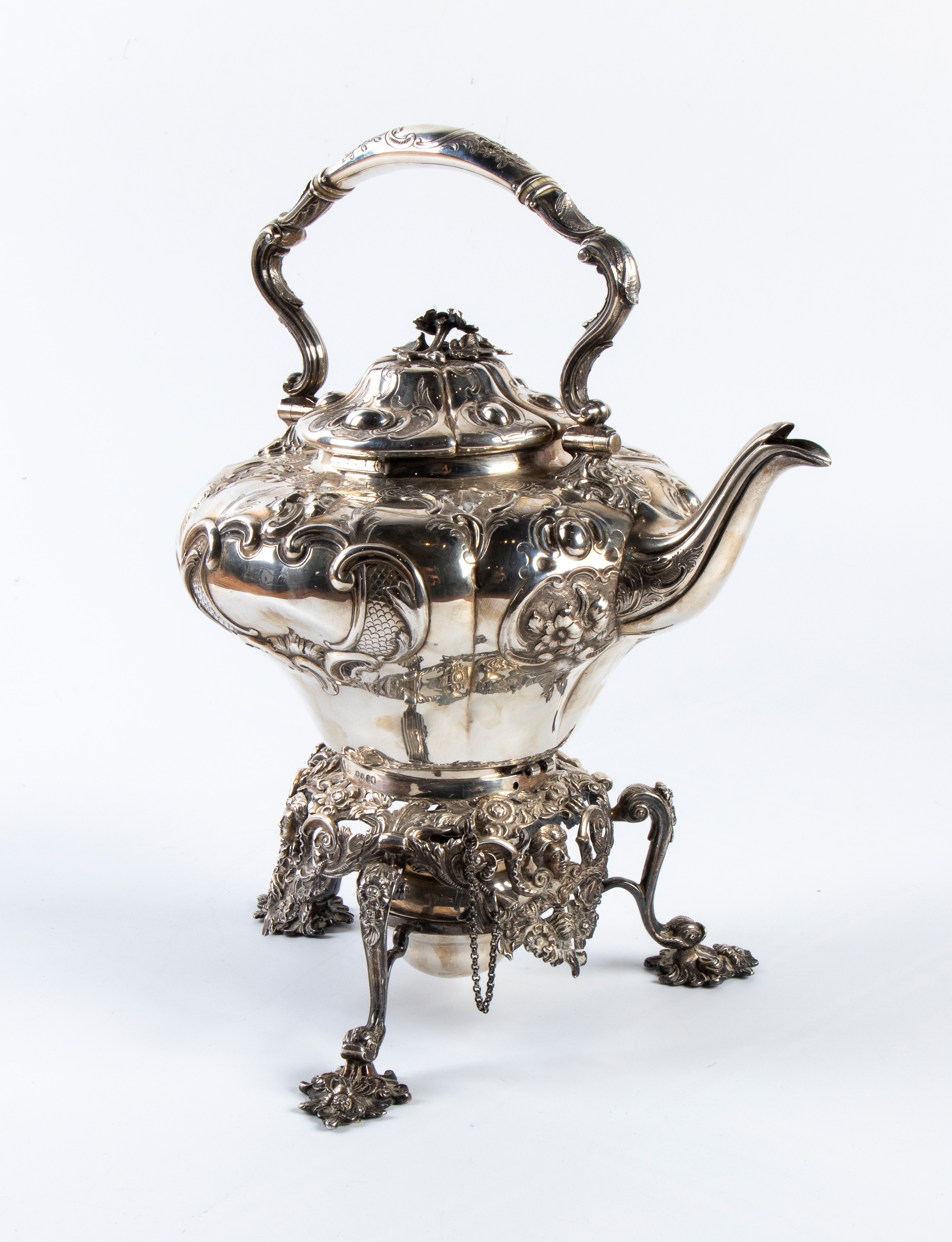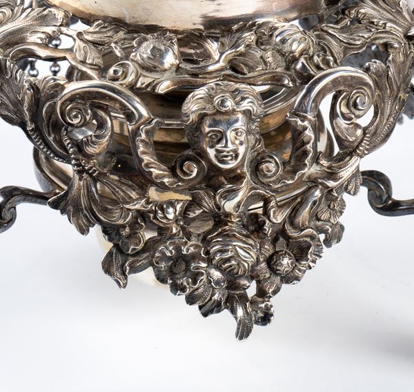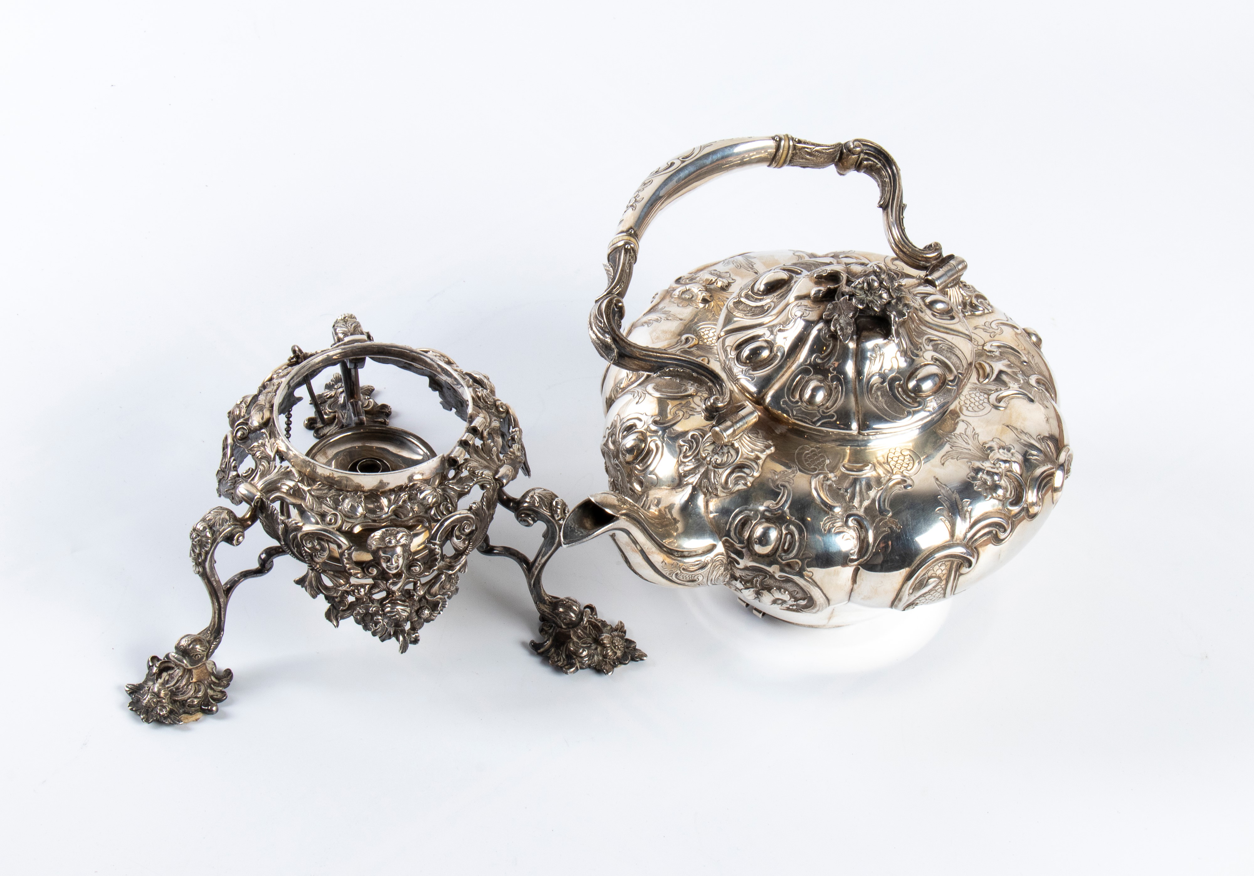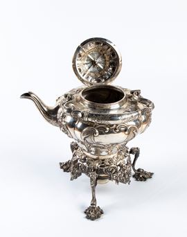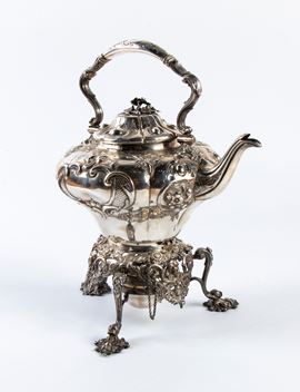 completo di supporto con fornello. L’insieme poggia su una base trilobata riccamente decorata con motivi fogliati e floreali, sorretta da tre piedi lavorati en suite. Al centro della struttura è alloggiato un fornello ad alcol, spirit burner, destinato al mantenimento del calore dell’acqua. Su questa base poggia la bollitrice, dal corpo riccamente ornato con motivi a volute e fogliami, dotata di manico e di versatoio. La parte superiore è chiusa da un coperchio, decorato e culminante con presa a motivo floreale.