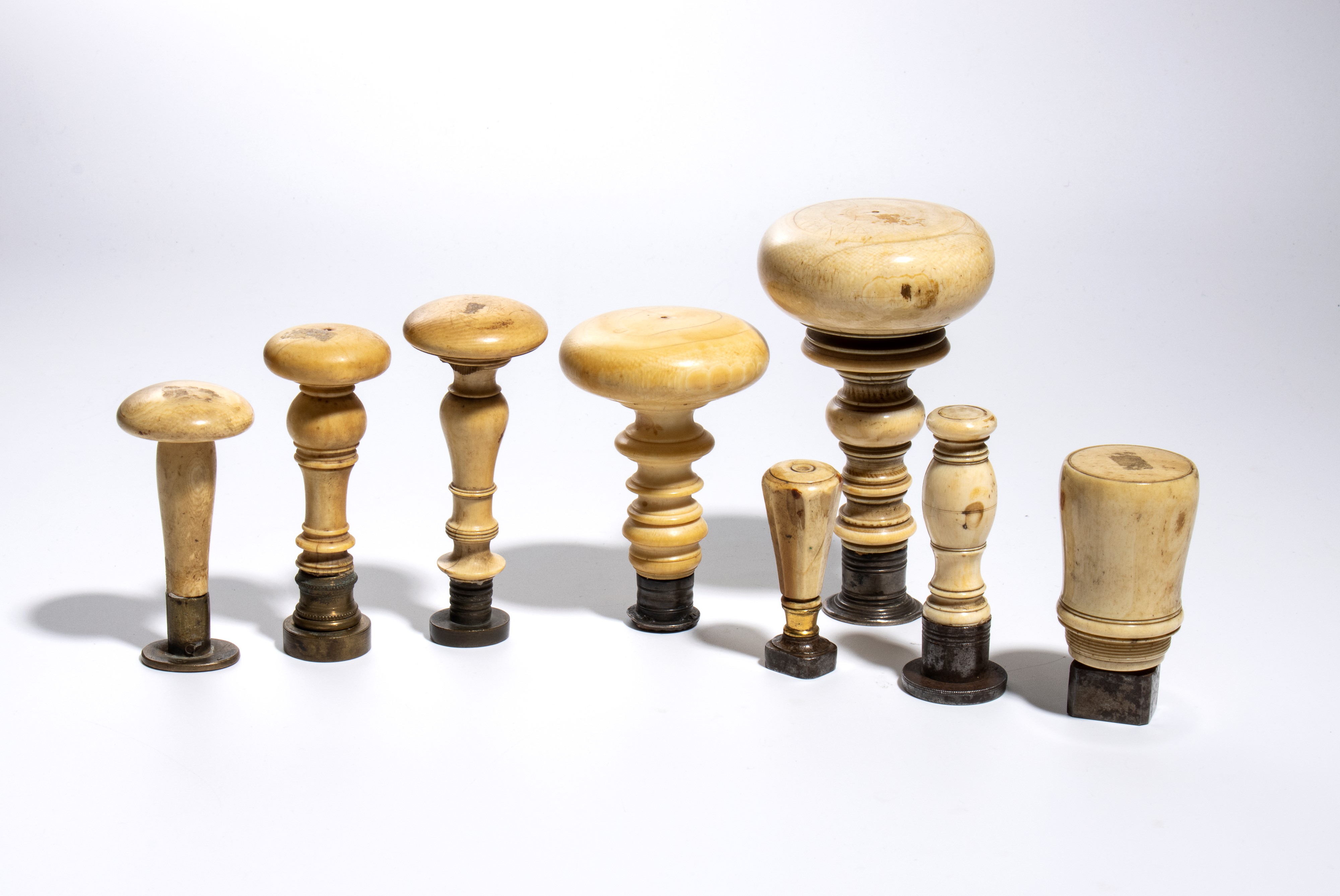 gruppo di otto sigilli per ceralacca, impugnatura in avorio, Francia, XIX secolo