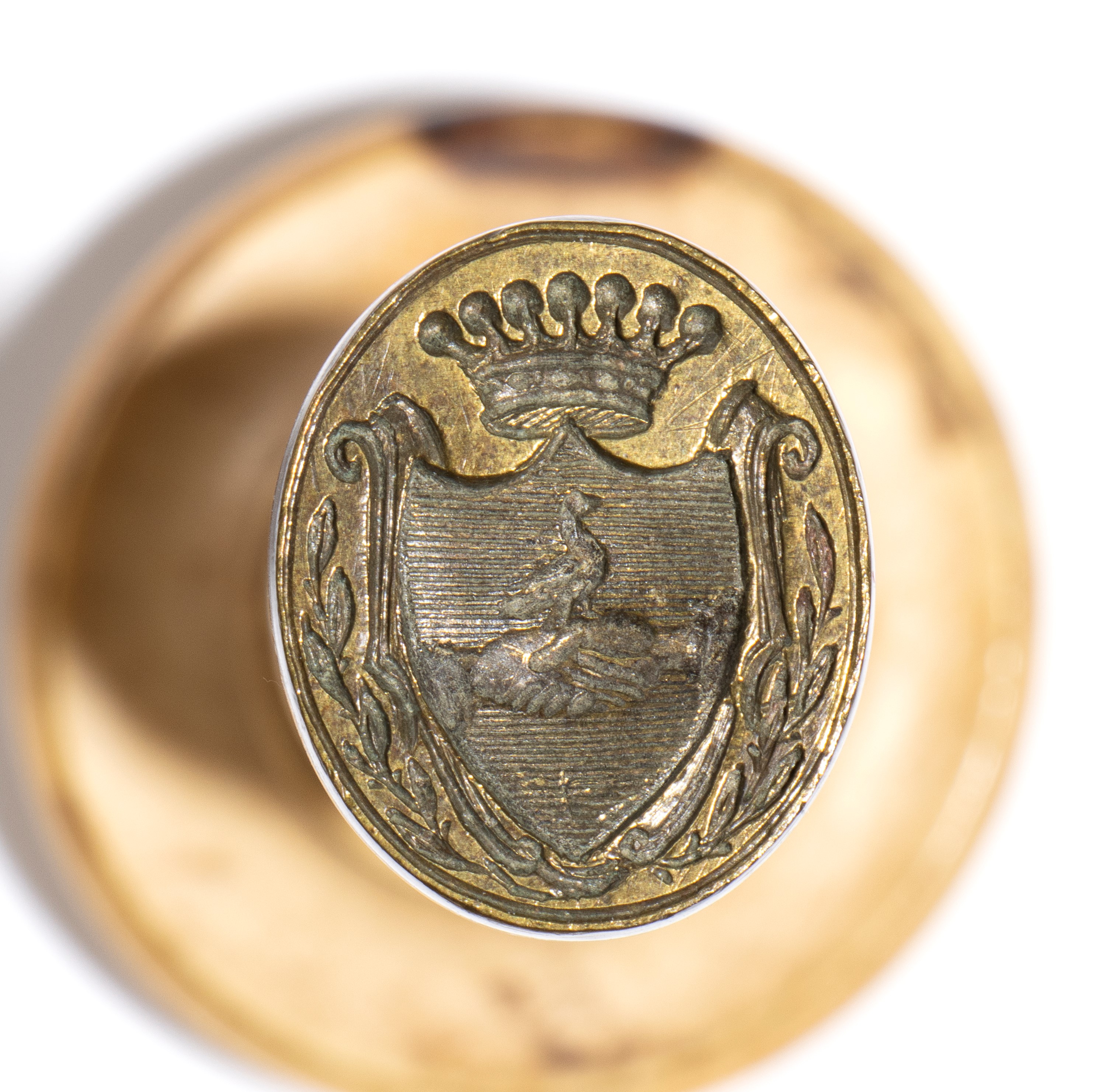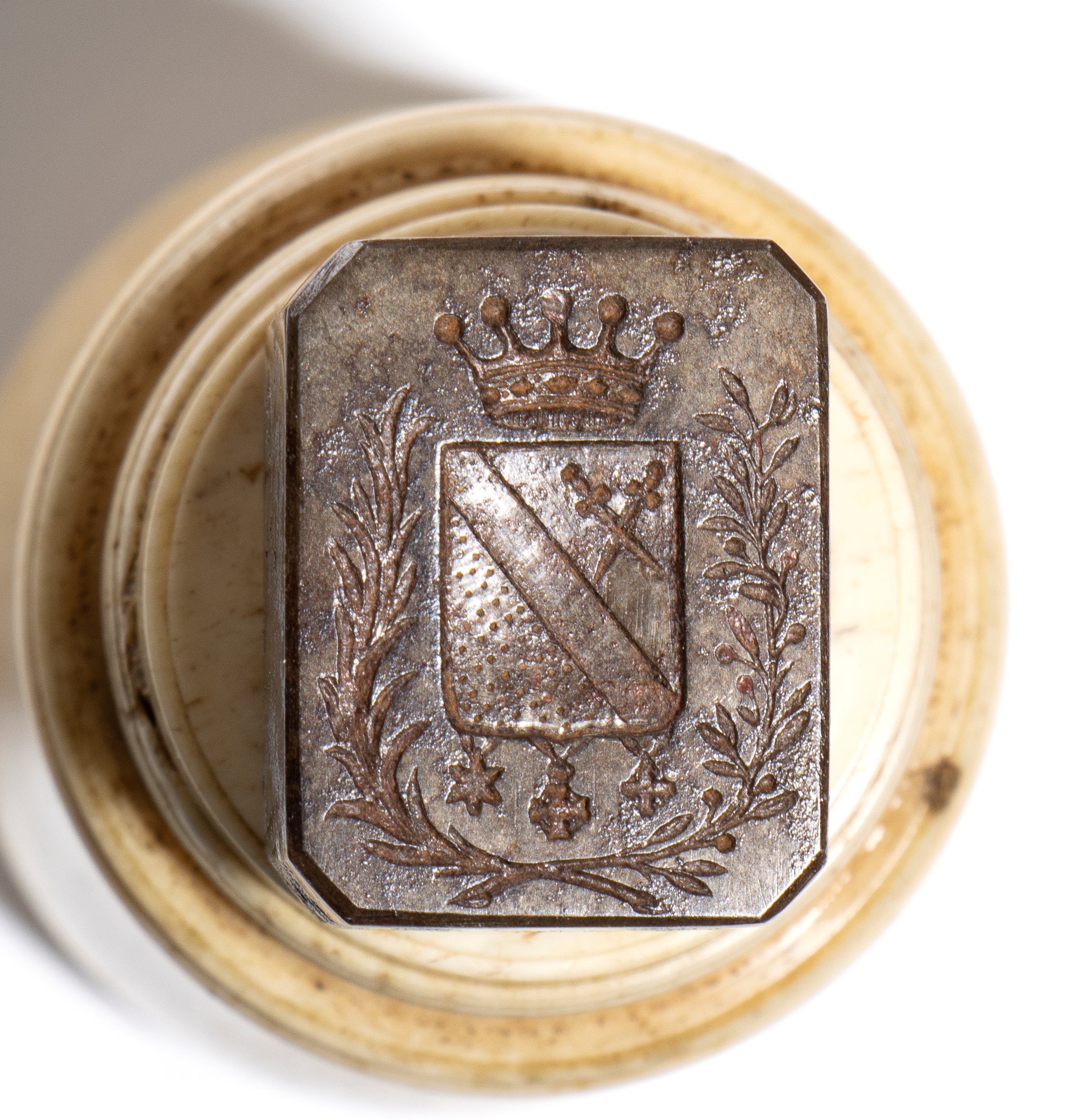 realizzati in Francia nel XIX secolo, tutti accomunati da una raffinata lavorazione artigianale e da uno stile omogeneo, pur presentando leggere variazioni nelle forme. Le impugnature sono tutte caratterizzate da un’elegante linea affusolata, prevalentemente tornita in forma circolare, semplice ed essenziale, mentre la parte inferiore è decorata da cerchi concentrici, che arricchiscono e slanciano la struttura con ritmo e armonia. Pur mantenendo una coerenza stilistica, ogni sigillo si distingue per leggere differenze nella proporzione e nella sagomatura, testimoniando una produzione artigianale attenta ai dettagli e alla varietà. I sigilli recano incisi stemmi araldici differenti, ciascuno con proprie peculiarità iconografiche, suggerendo la destinazione a diverse famiglie nobiliari o personalità di rilievo dell'epoca.