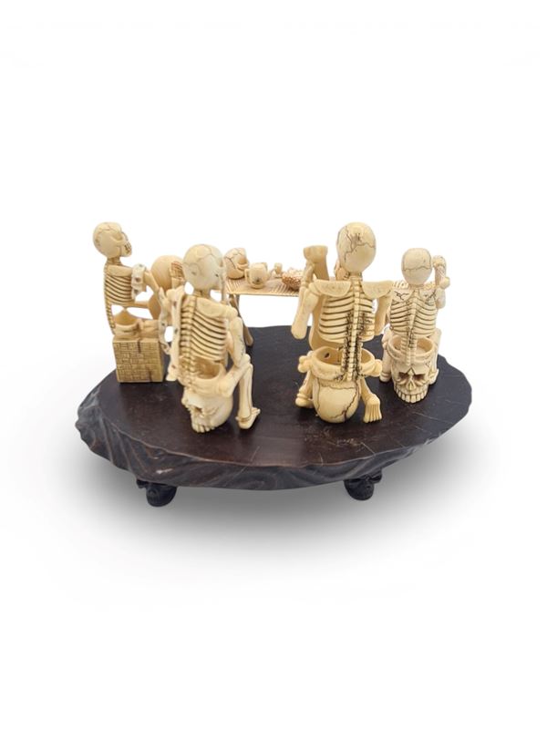 Antico gruppo scultoreo in avorio di elefante (Elephas maximus Linnaeus, 1758 o Loxodonta africana Blumenbach, 1797), realizzato in Giappone con grande maestria artistica durante il periodo Meiji (1868-1912).