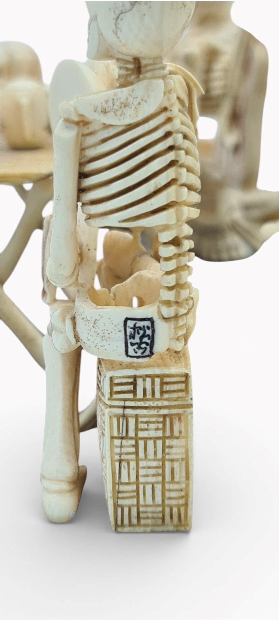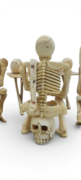 Rappresenta una scena vivace e simbolica in cui quattro scheletri sono intenti a suonare strumenti musicali e a condividere un momento conviviale attorno a un tavolo. L'opera, caratterizzata da una finissima lavorazione, esemplifica la maestria artigianale dell'epoca e il gusto per la rappresentazione di scene animate e dettagliate. Gli scheletri presentano espressioni e posture dinamiche, che conferiscono alla composizione un senso di movimento e realismo. Ogni figura è impegnata in un'azione distinta: uno suona un tamburo decorato con motivi fiammeggianti, un altro pizzica le corde di uno strumento a corda simile a un liuto, mentre gli altri due tengono strumenti a percussione e a fiato. Al centro della scena si trova un tavolo ornato con dettagli minuziosi, sopra il quale sono disposti ciotole con frutta, una teiera e teschi.