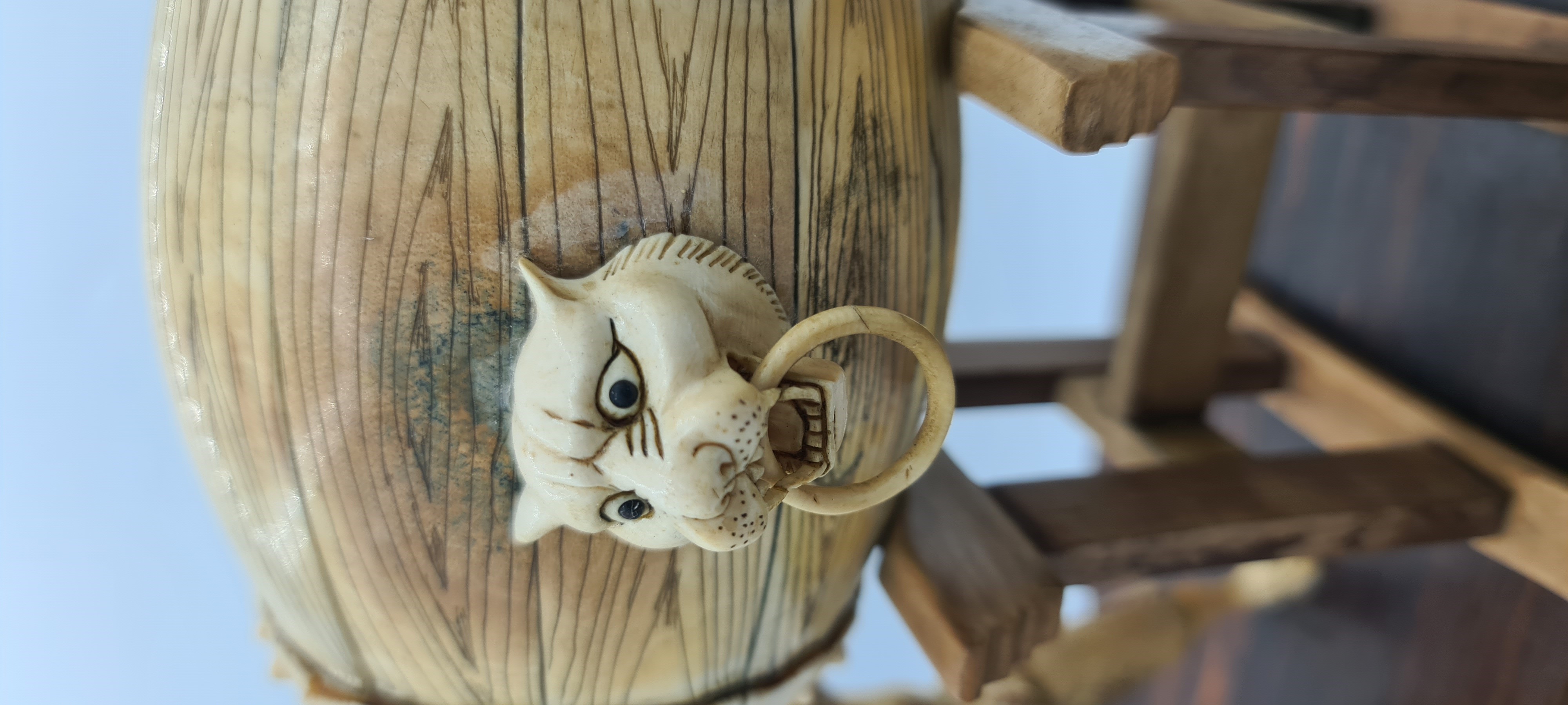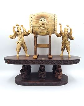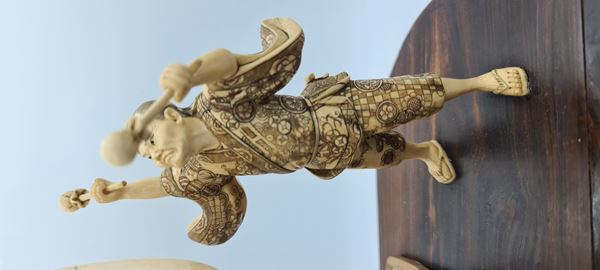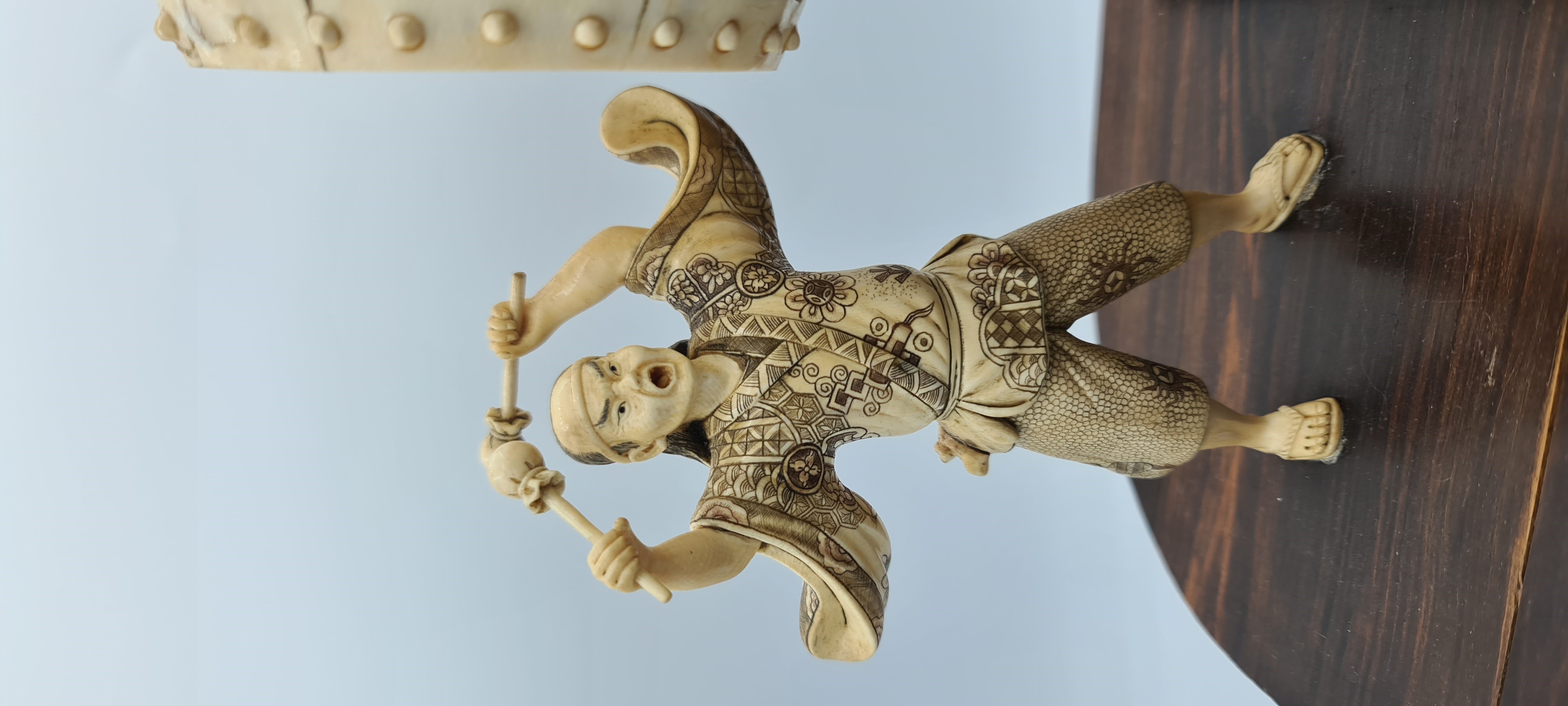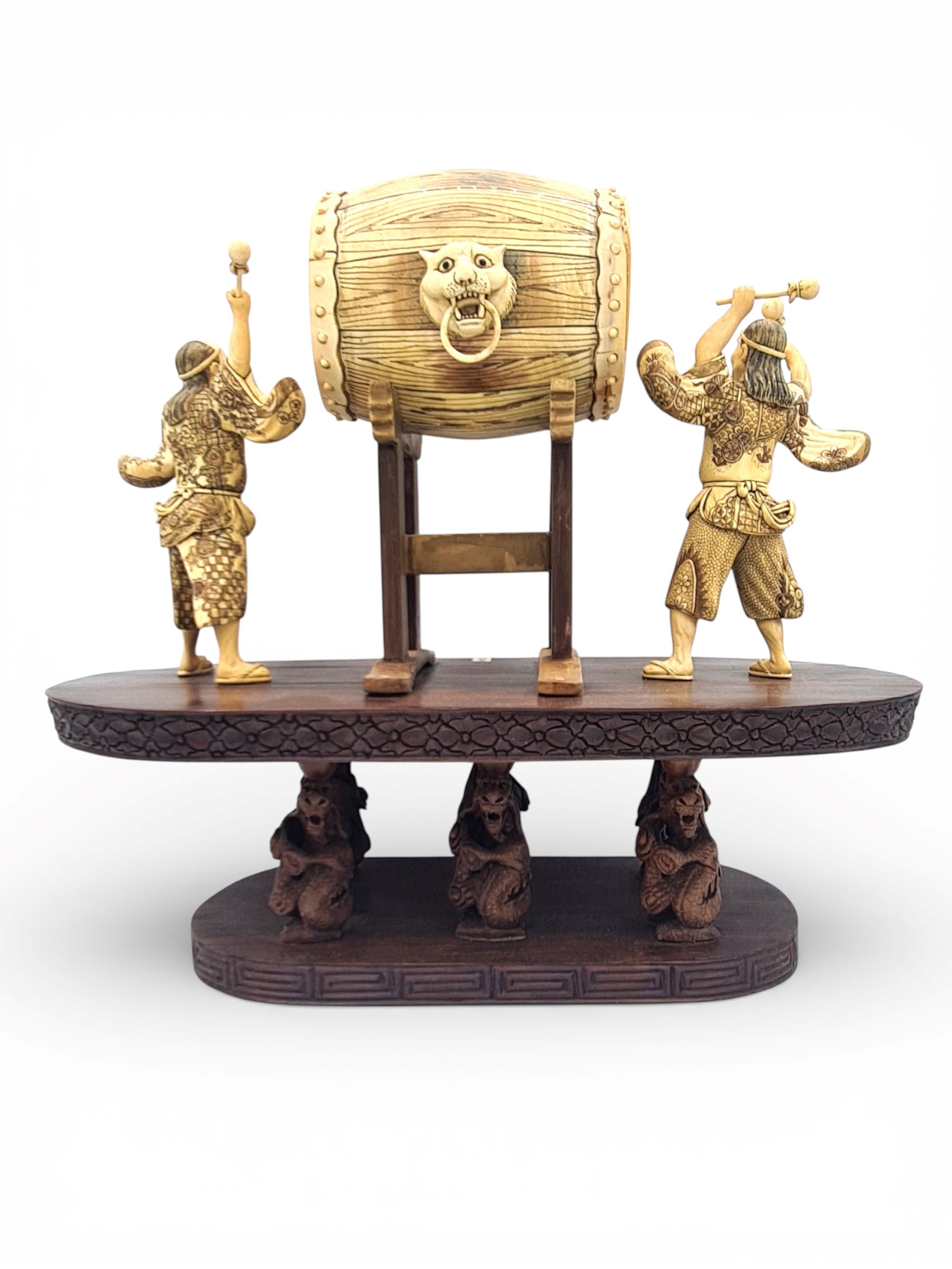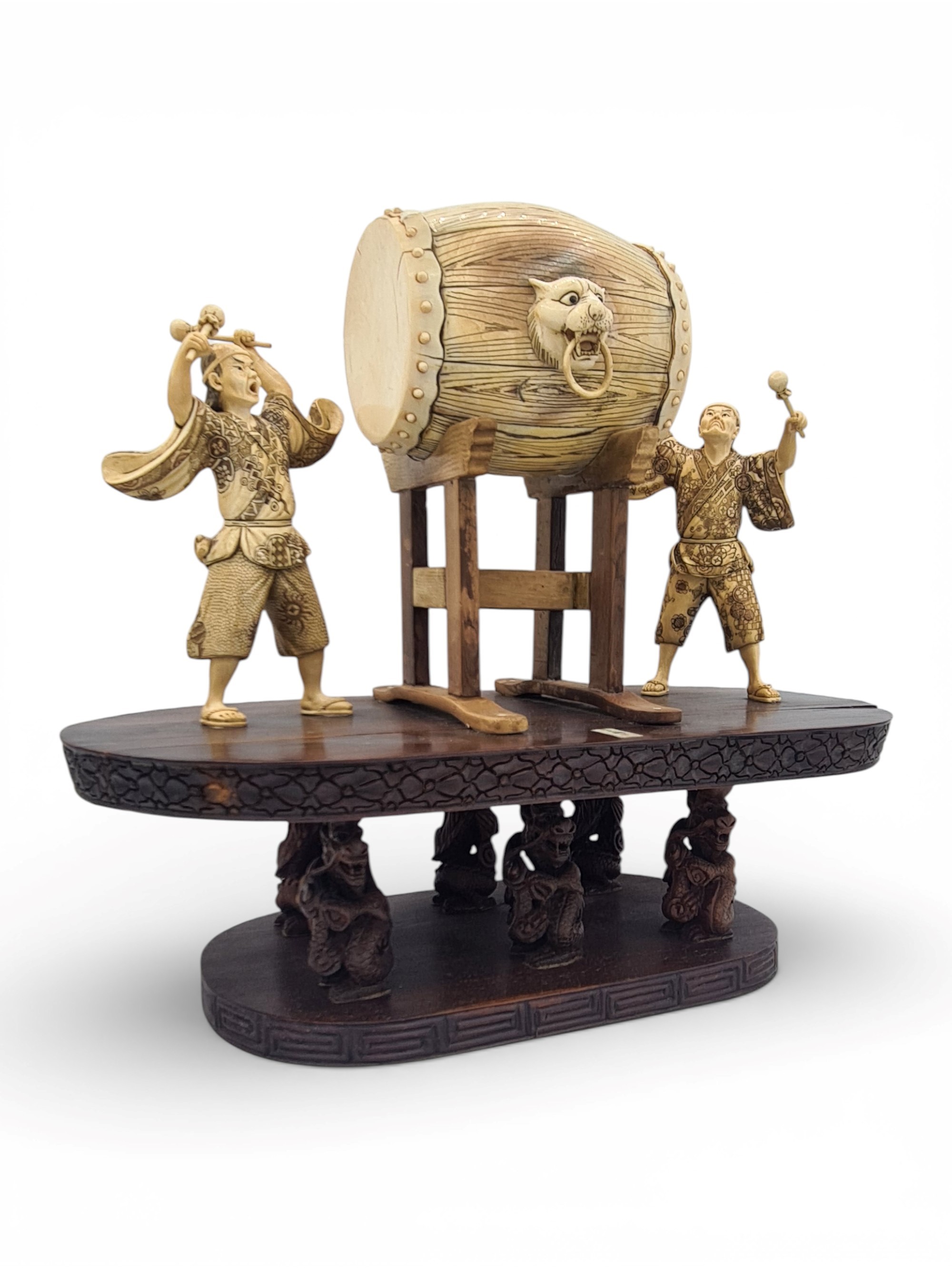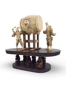 Antico gruppo scultoreo in avorio di mammut (Mammuthus primigenius Blumenbach, 1799) raffigurante due suonatori di tamburo poggianti su una base ovale in palissandro (Dalbergia spp). La tipologia e la qualità esecutiva dell’intaglio presentano delle forti analogie con altri rilievi realizzati in Cina alla prima metà del XX secolo.