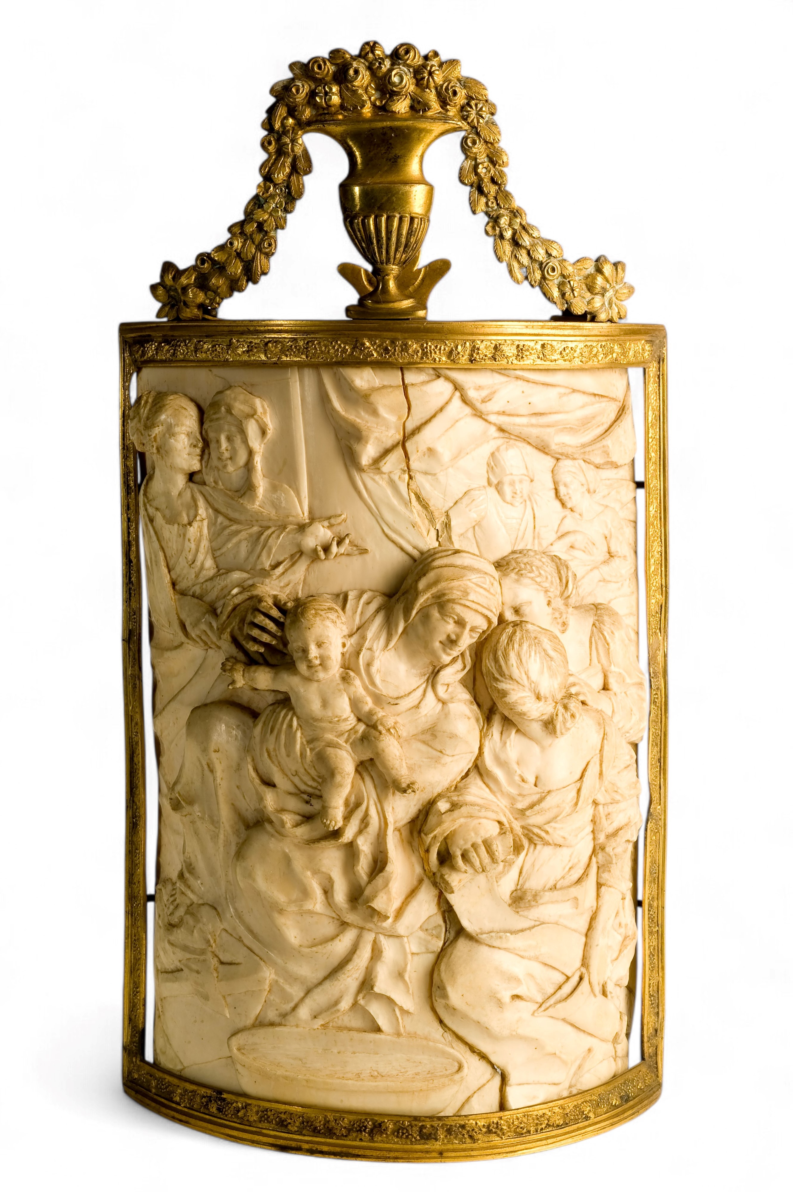 La placca è leggermente ricurva, segue infatti la naturale curvatura della zanna, conferendo alla scena una particolare profondità e dinamicità. Maria, seduta al centro della composizione, sorregge teneramente il piccolo Gesù seminudo, rivolto verso lo spettatore, è intenta in una conversazione con una donna inginocchiata in primo piano in basso a destra. Le altre figure, disposte con naturalezza intorno alla Vergine, sembrano partecipare silenziosamente a questo momento creando una scena corale e armoniosa. Sullo sfondo si intravedono tende drappeggiate e volti in secondo piano che rafforzano l’impressione di uno spazio sacro e raccolto. L’intera composizione è racchiusa in una cornice in metallo dorato, decorata nella parte superiore da un vaso centrale da cui scendono ghirlande floreali, elemento tipico del gusto barocco.