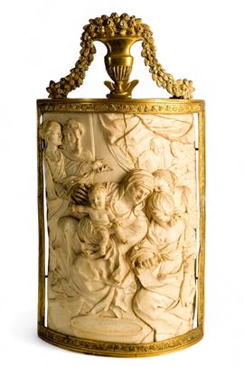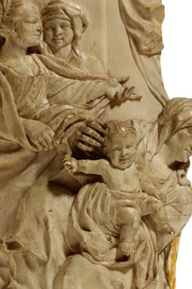 Antico intaglio in avorio di elefante (Elephas maximus Linnaeus, 1758 or Loxodonta africana Blumenbach, 1797) raffigurante la Madonna con il Bambino, attorniata da diverse figure femminili in un contesto che richiama la tipica iconografia della Sacra Conversazione.