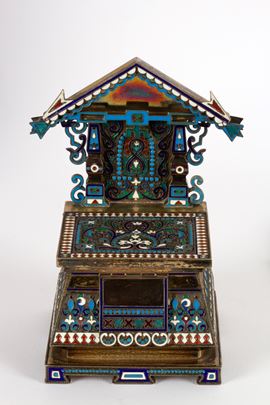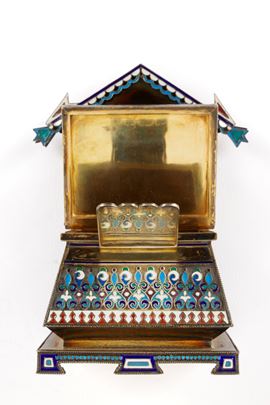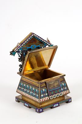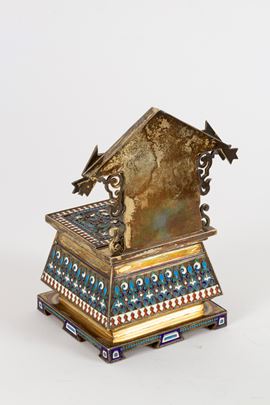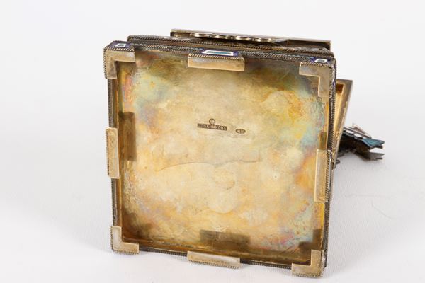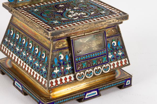 realizzato con la tecnica del cloisonné, finemente sbalzato e cesellato.