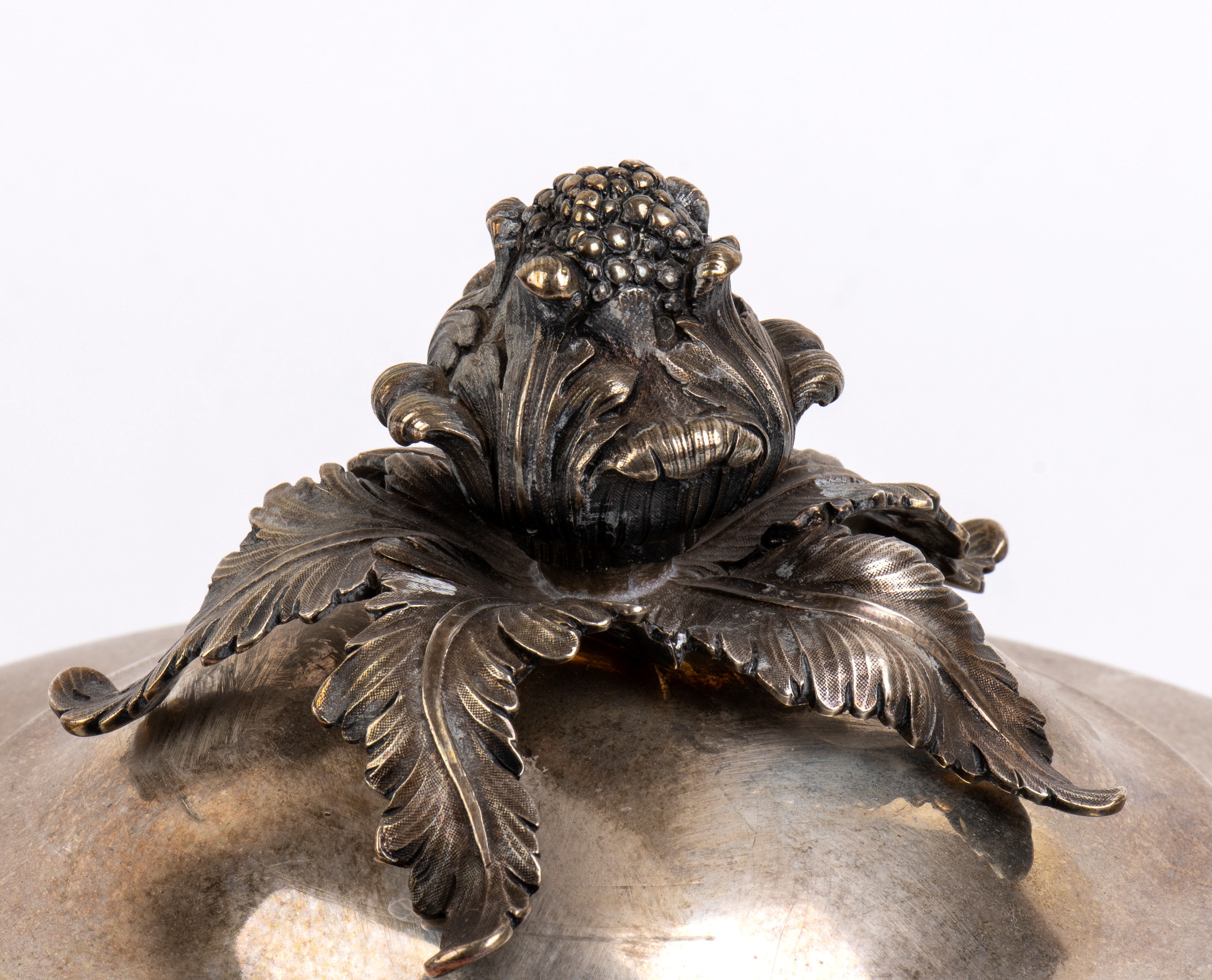 di forma circolare e bombata con coperchio ad innesto. Il coperchio presenta una presa decorativa, modellata per rappresentare un ricco grappolo di foglie che racchiudono e culminano in un bocciolo di fiore. Ai lati sono presenti due manici finemente cesellati, riccamente decorati con elementi a volute e fogliati.