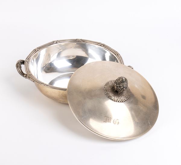 di forma circolare con coperchio ad innesto. Il coperchio presenta una presa rappresentare un ricco grappolo di foglie e un bocciolo di fiore. Ai lati sono presenti due manici riccamente decorati con elementi a voluta e foglie.