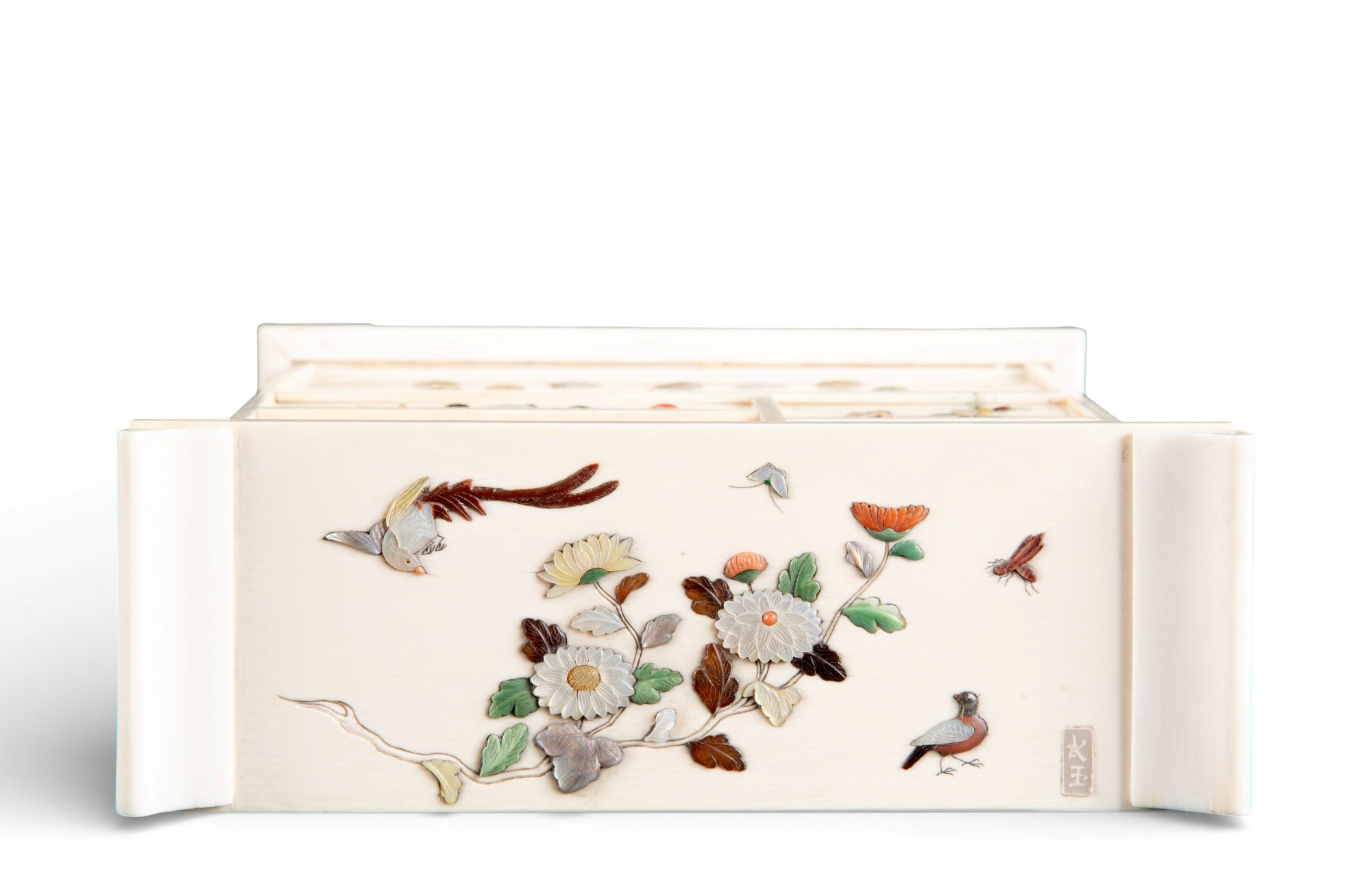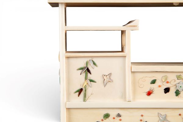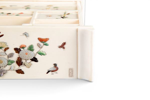 shibayama realizzato in avorio di elefante (Elephas maximus Linnaeus, 1758 o Loxodonta africana Blumenbach, 1797) e madreperla. L'oggetto è decorato con fiori e volatili.