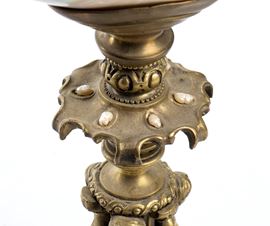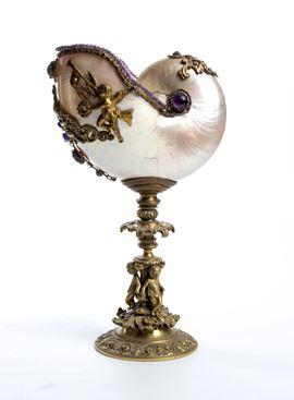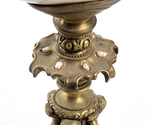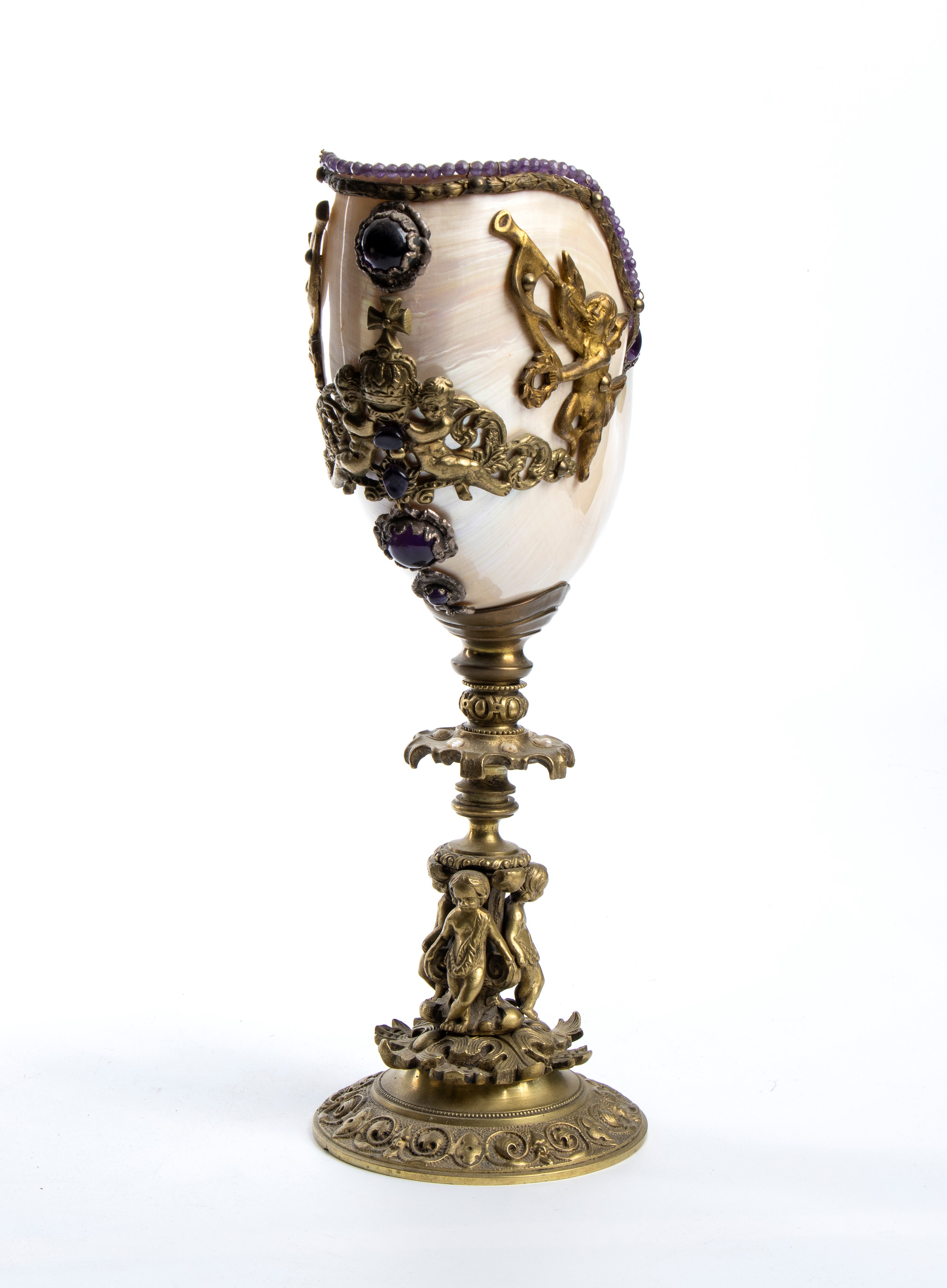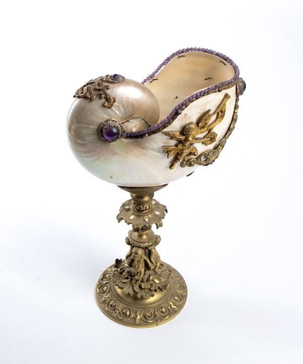 montata su una base in ottone di forma circolare ornata da una fascia decorata a motivi vegetali e regge un fusto cesellato, arricchito da piccole figure di putti poggianti su un basamento a volute. Il corpo della conchiglia è incastonato in una montatura decorativa in ottone con applicazioni fitomorfe e rocaille, impreziosite da pietre dure di ametiste alcune cabochon di dimensioni maggiori incastonate. Sulla parte frontale sono applicate le figure di cherubini alati, rappresentati nell’atto di suonare una tromba, simbolo di trionfo o annuncio, elemento decorativo tipico del gusto neobarocco e neorinascimentale. Un sottile bordo in ametiste incornicia la linea superiore della conchiglia.