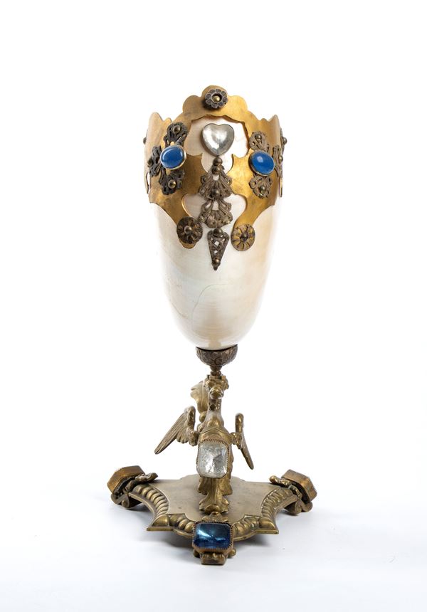 sagomata, impreziosita lateralmente da paste vitree incastonate. Sulla base si erge un animale alato, probabilmente un cigno, finemente modellato. Su questo è inserito un elemento circolare sul quale è incastonata la conchiglia. Lungo l'orlo del nautilus sono inseriti elementi decorativi in ottone traforato, arricchiti da ulteriori paste vitree, in continuità stilistica con la base.