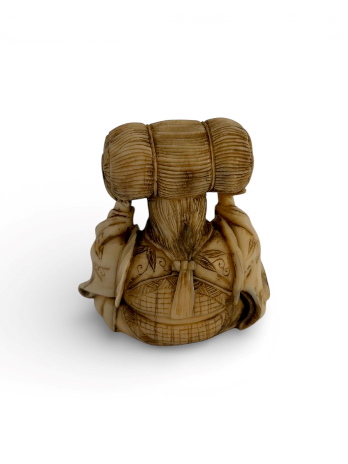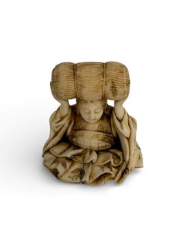 di elefante, raffigurante una figura seduta con una balla di riso sulla testa.