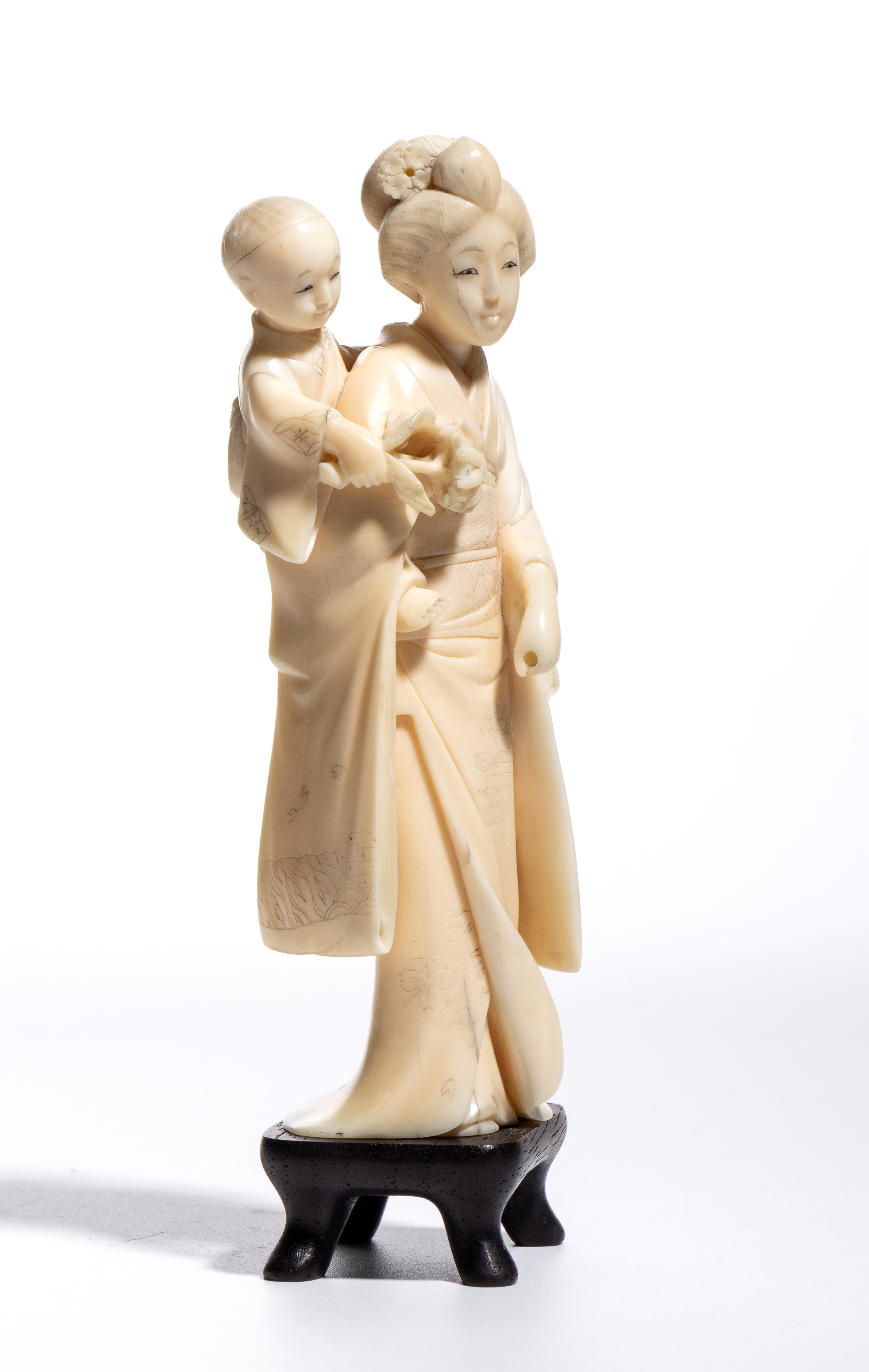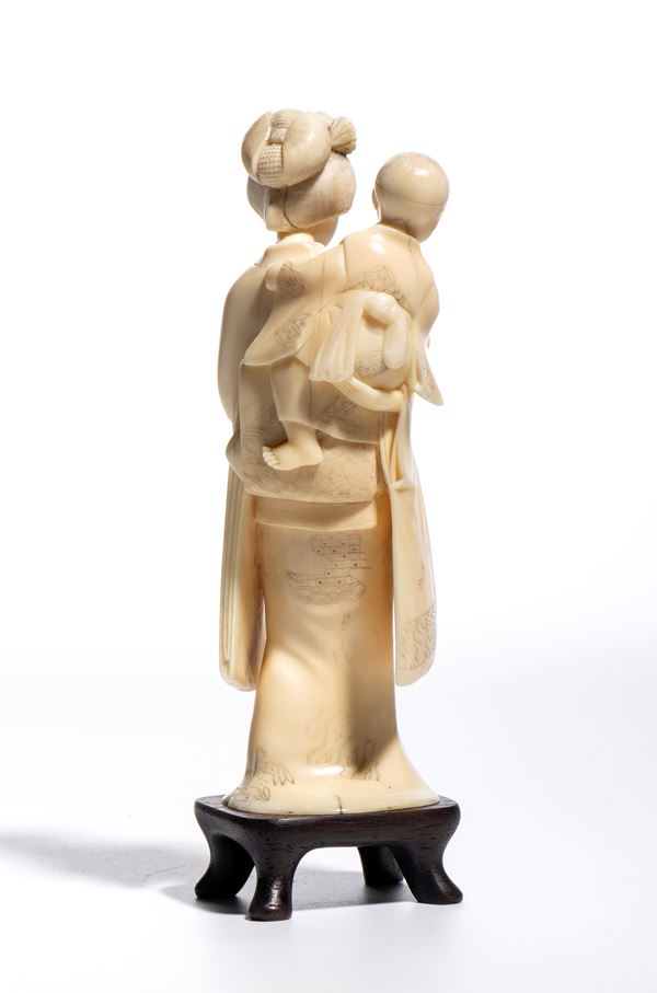 in avorio di ippopotamo, raffigura una figura femminile in abito tradizionale, probabilmente una geisha, che porta sulle spalle un bambino.