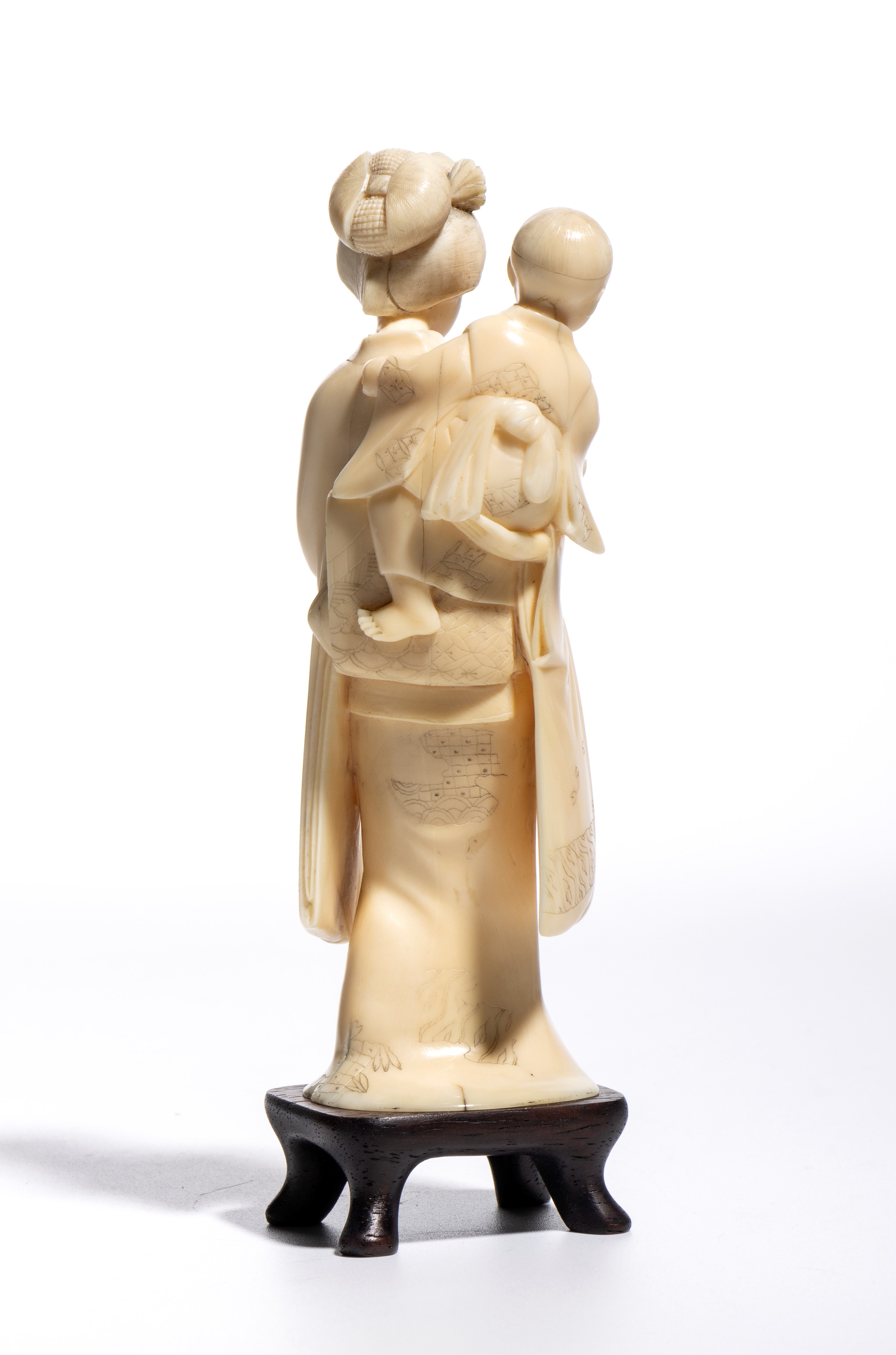 La donna ha i capelli raccolti in un’acconciatura elegante, mentre il kimono scivola in pieghe morbide impreziosite da sottili incisioni decorative; il bambino regge nella mano destra un fiore.Gli okimono erano oggetti ornamentali scolpiti a mano, realizzati in Giappone come espressione artistica. Il termine "okimono" significa letteralmente "oggetto da posare" e si riferisce a sculture di piccole o medie dimensioni concepite per essere esposte e spesso raffiguravano temi ispirati alla vita quotidiana, alla natura, alla mitologia e alla religione.