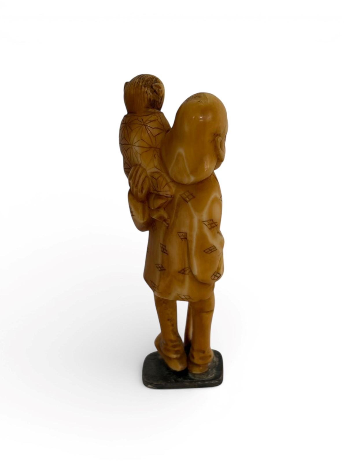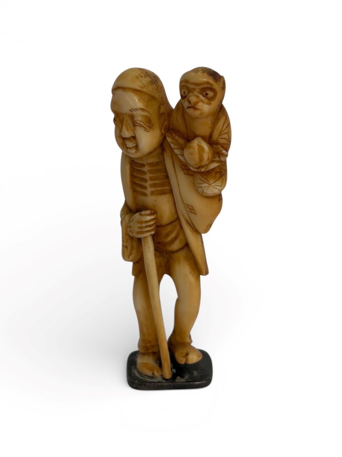 di elefante (Elephas maximus Linnaeus, 1758 o Loxodonta africana Blumenbach, 1797) intagliato e tinto raffigurante un personaggio che regge una scimmia.