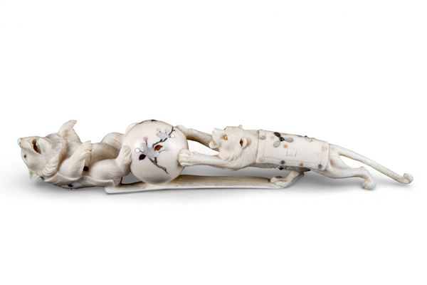 di elefante (Elephas maximus Linnaeus, 1758 o Loxodonta africana Blumenbach, 1797) e madreperla, raffigurante un orso con una tigre.