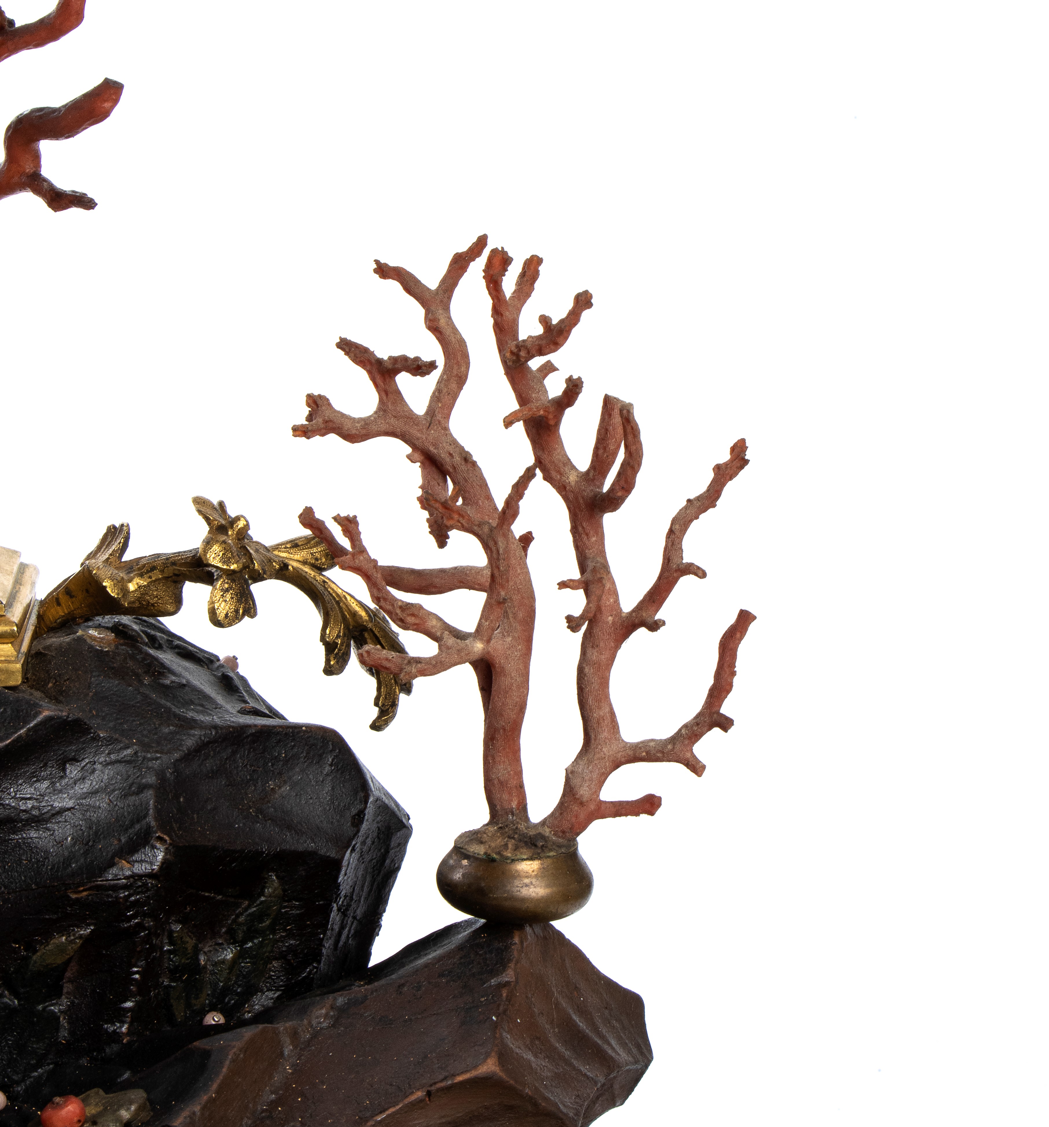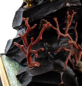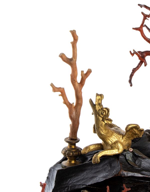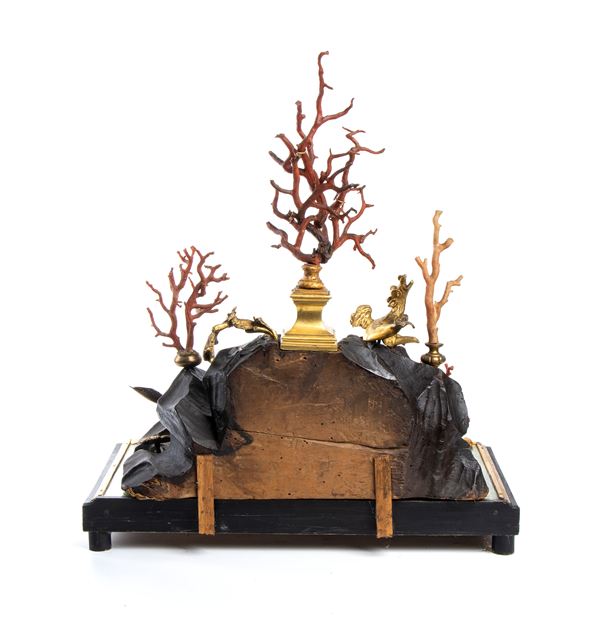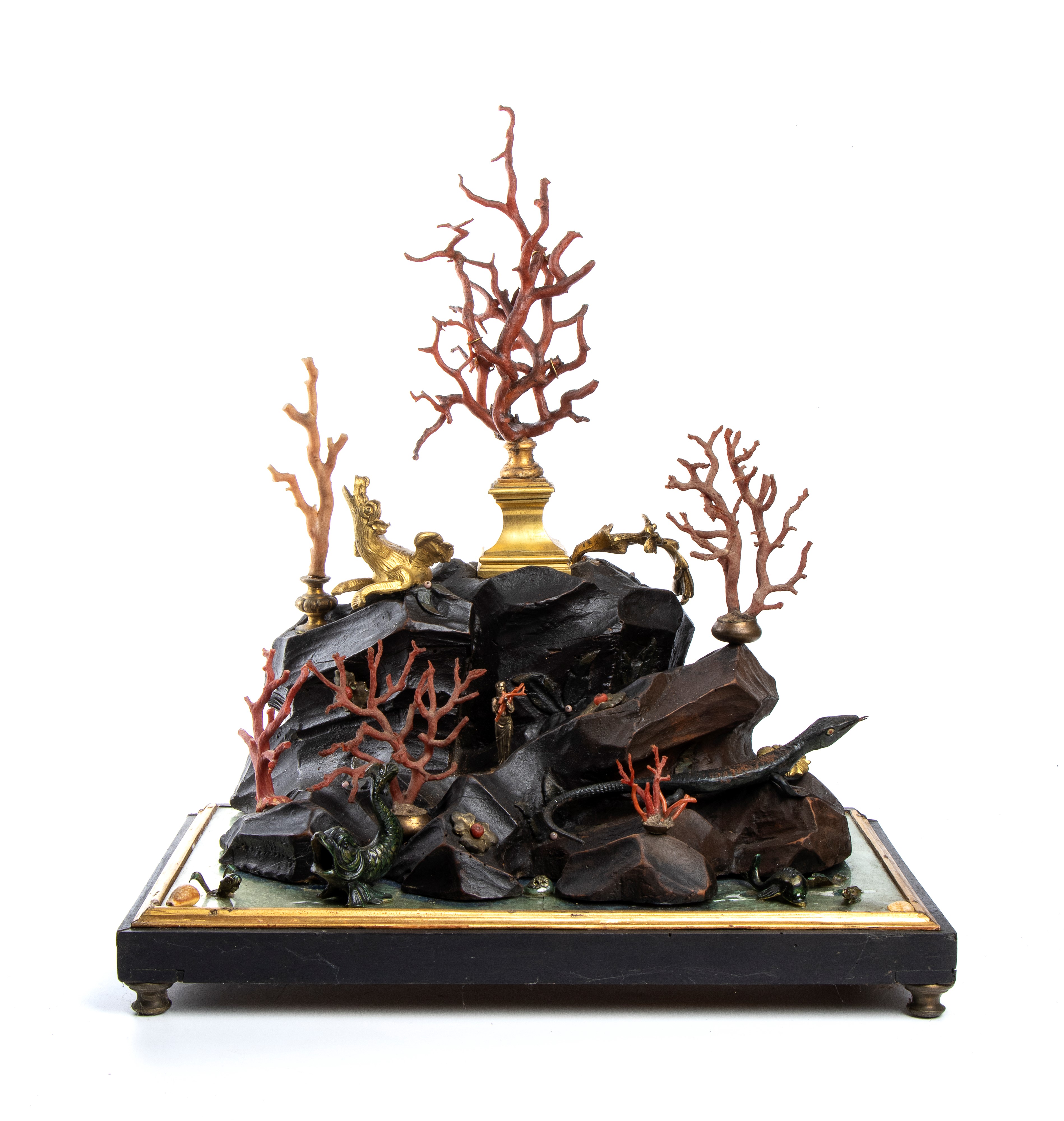 formata da elementi naturali e figure decorative disposte su una base che imita un affioramento roccioso, poggiante a sua volta su una base rettangolare con piedini circolari dorati. Il motivo dominante ricorrente è il corallo rosso del mediterraneo (Corallium rubrum), distribuiti su più livelli. Tra questi, al centro della scena, un esemplare di corallo rosso di maggiori dimensioni è montato su un elegante supporto tornito che ne enfatizza il valore ornamentale e lo eleva come fulcro della composizione. Alla base, sparsi tra gli anfratti, sono visibili vari animali ornamentali, come serpenti, lucertole e piccole figure, che riprendono l'iconografia naturalistica e simbolica tipica delle camere delle meraviglie del XVII secolo.