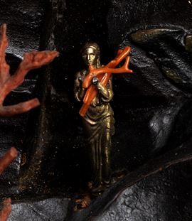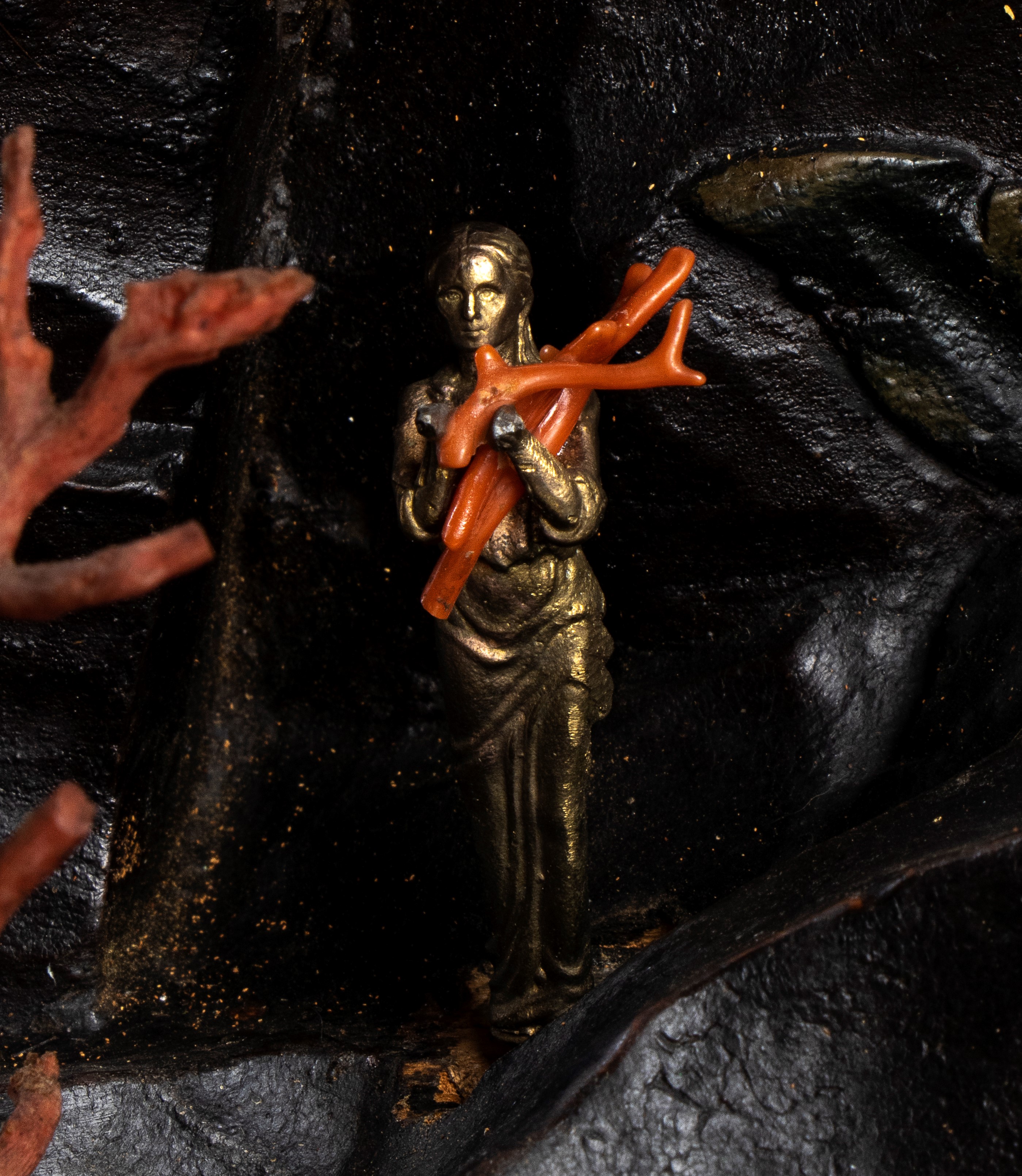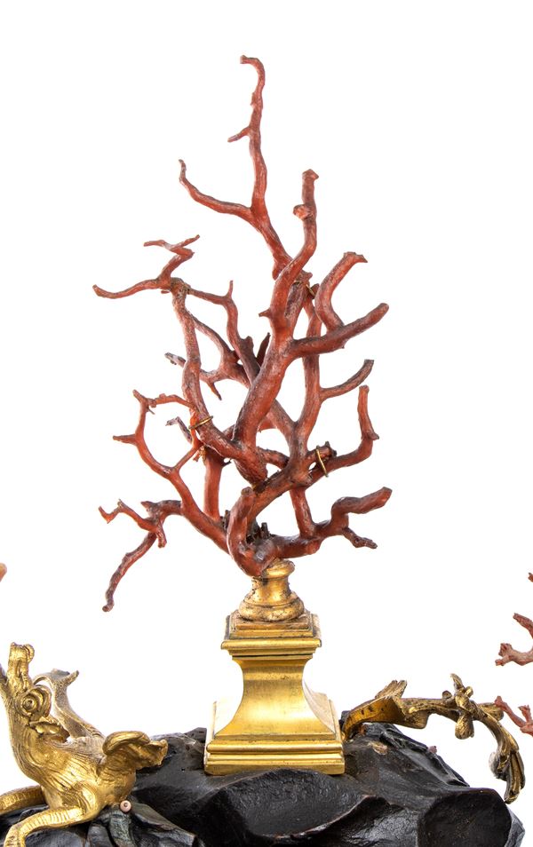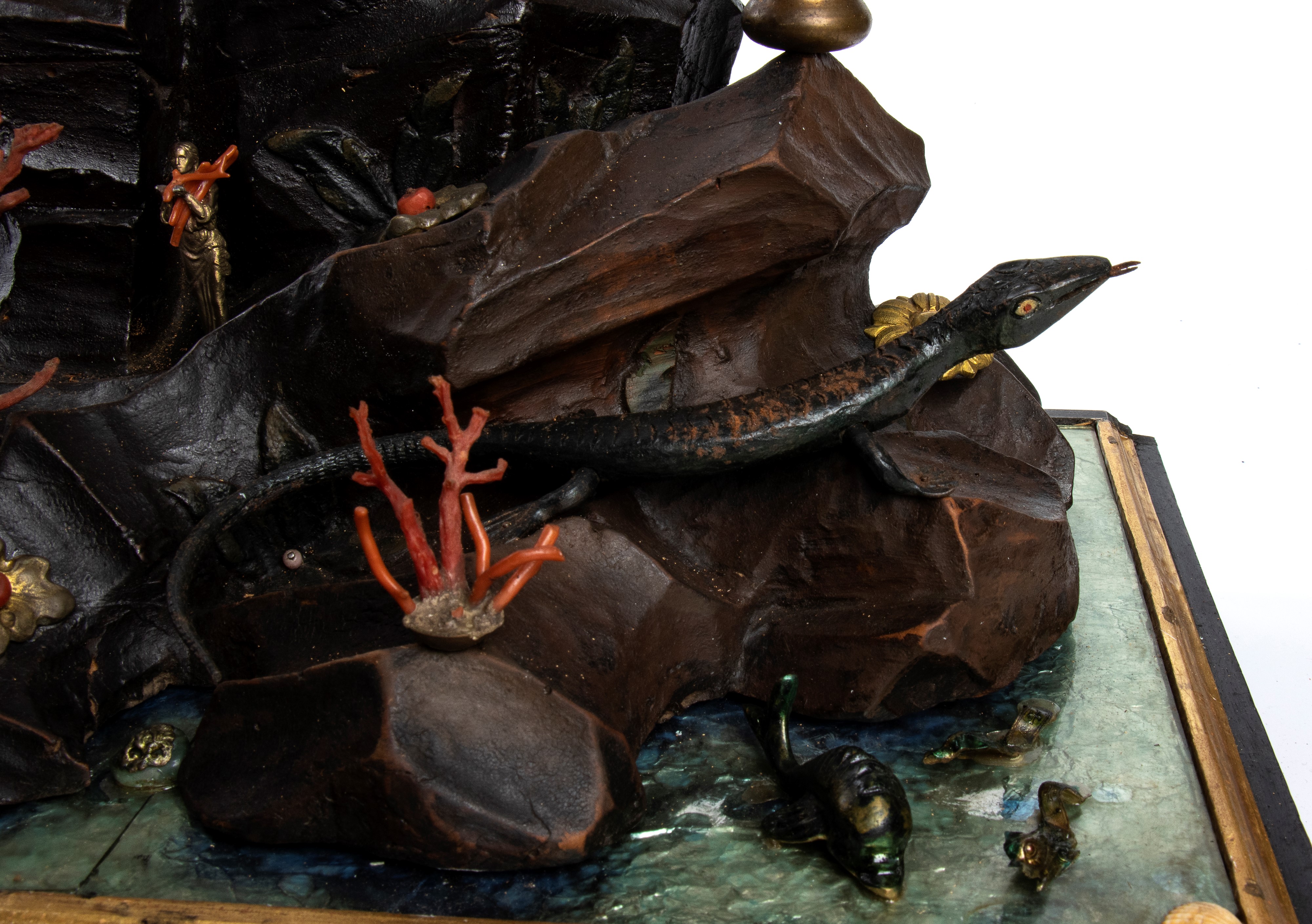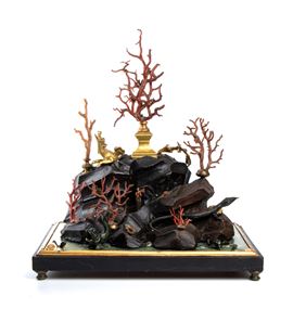 formata da elementi naturali e figure decorative disposte su una base che imita un affioramento roccioso, poggiante a sua volta su una base rettangolare con piedini circolari dorati. Il motivo dominante ricorrente è il corallo rosso del mediterraneo (Corallium rubrum), distribuiti su più livelli. Tra questi, al centro della scena, un esemplare di corallo rosso di maggiori dimensioni è montato su un elegante supporto tornito che ne enfatizza il valore ornamentale e lo eleva come fulcro della composizione. Alla base, sparsi tra gli anfratti, sono visibili vari animali ornamentali, come serpenti, lucertole e piccole figure, che riprendono l'iconografia naturalistica e simbolica tipica delle camere delle meraviglie del XVII secolo.