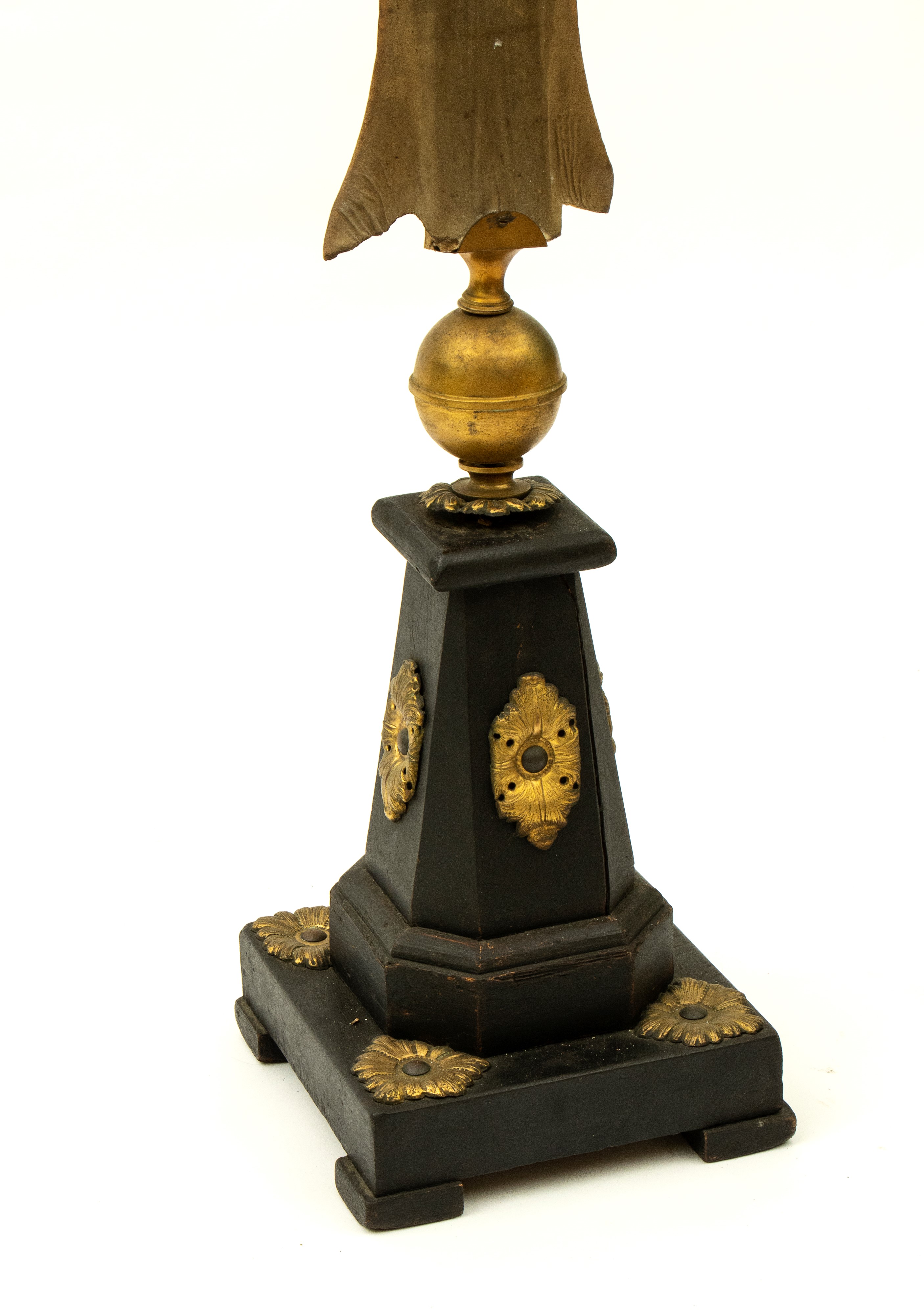 La base, realizzata in legno scuro e arricchita da applicazioni dorate, presenta una struttura piramidale culminante in un nodo sferico dal quale il rostro si innalza con solennità verticale.