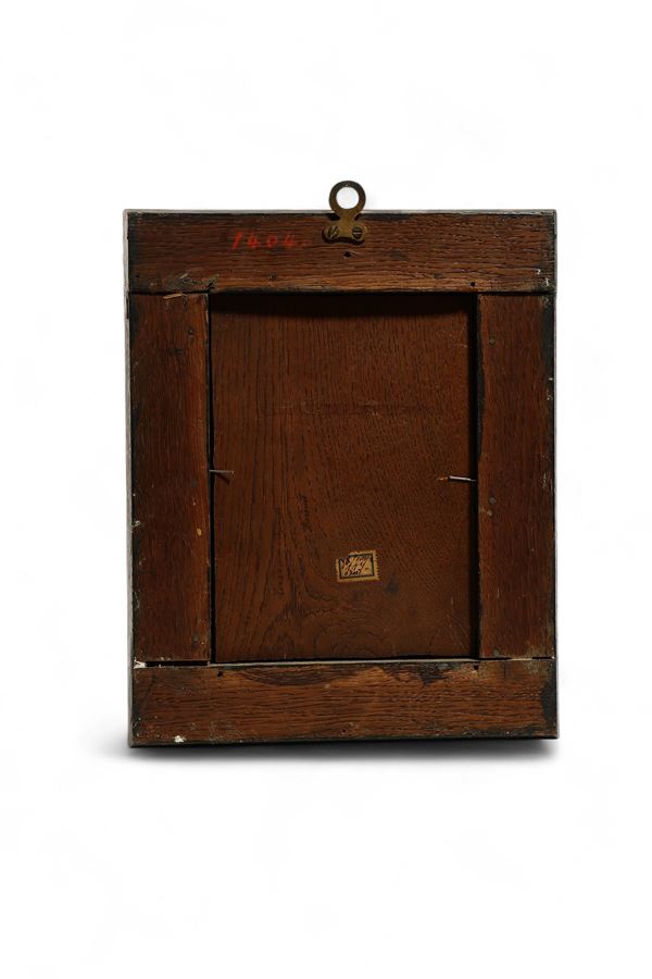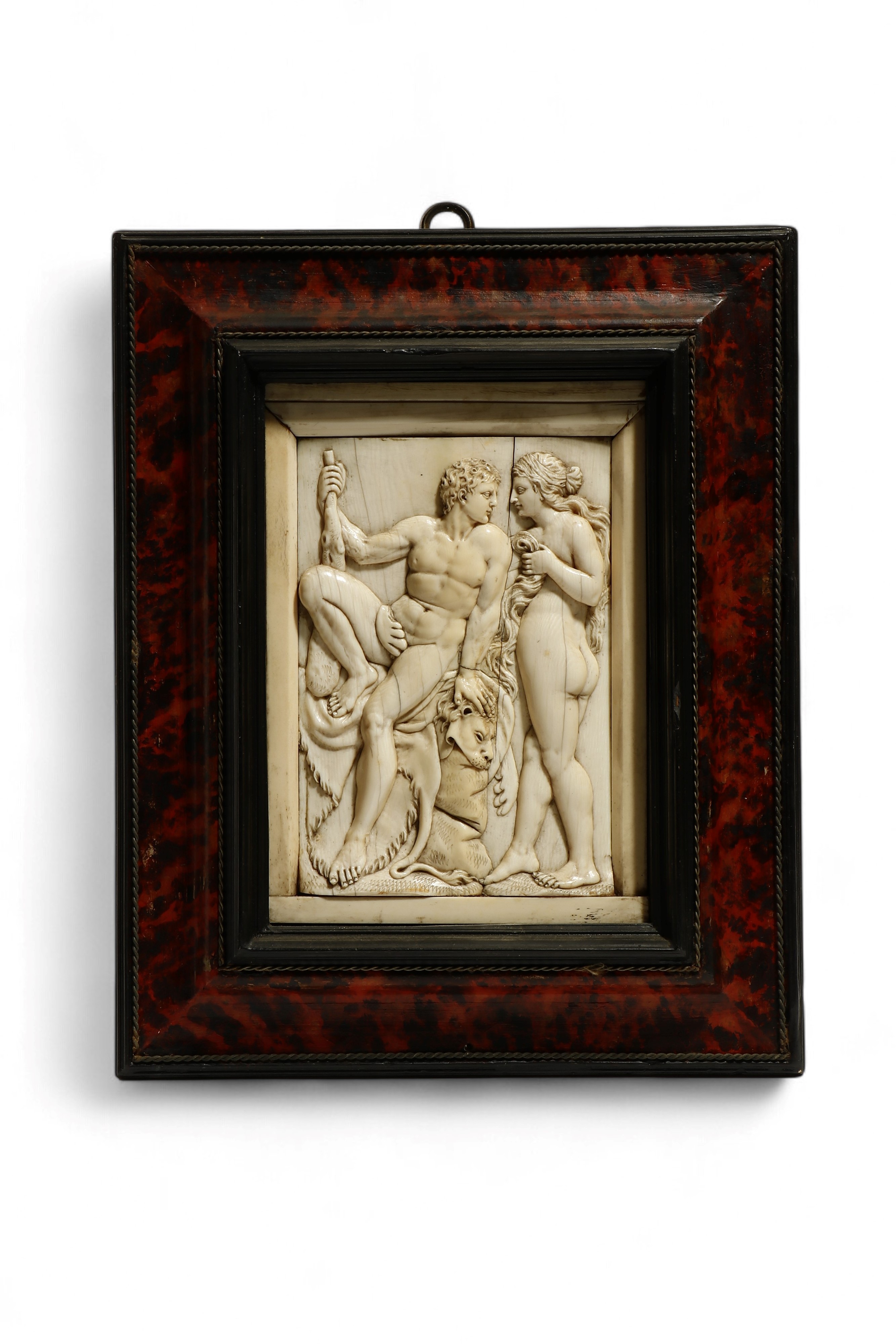 Antica placca in avorio di elefante intagliato (Elephas maximus Linnaeus, 1758 or Loxodonta africana Blumenbach, 1797) raffigurante molto probabilmente il tema di Ercole ed Onfale, entro cornice lignea dipinta ad imitare la tartaruga, con sottili elementi metallici a intreccio lungo i bordi.