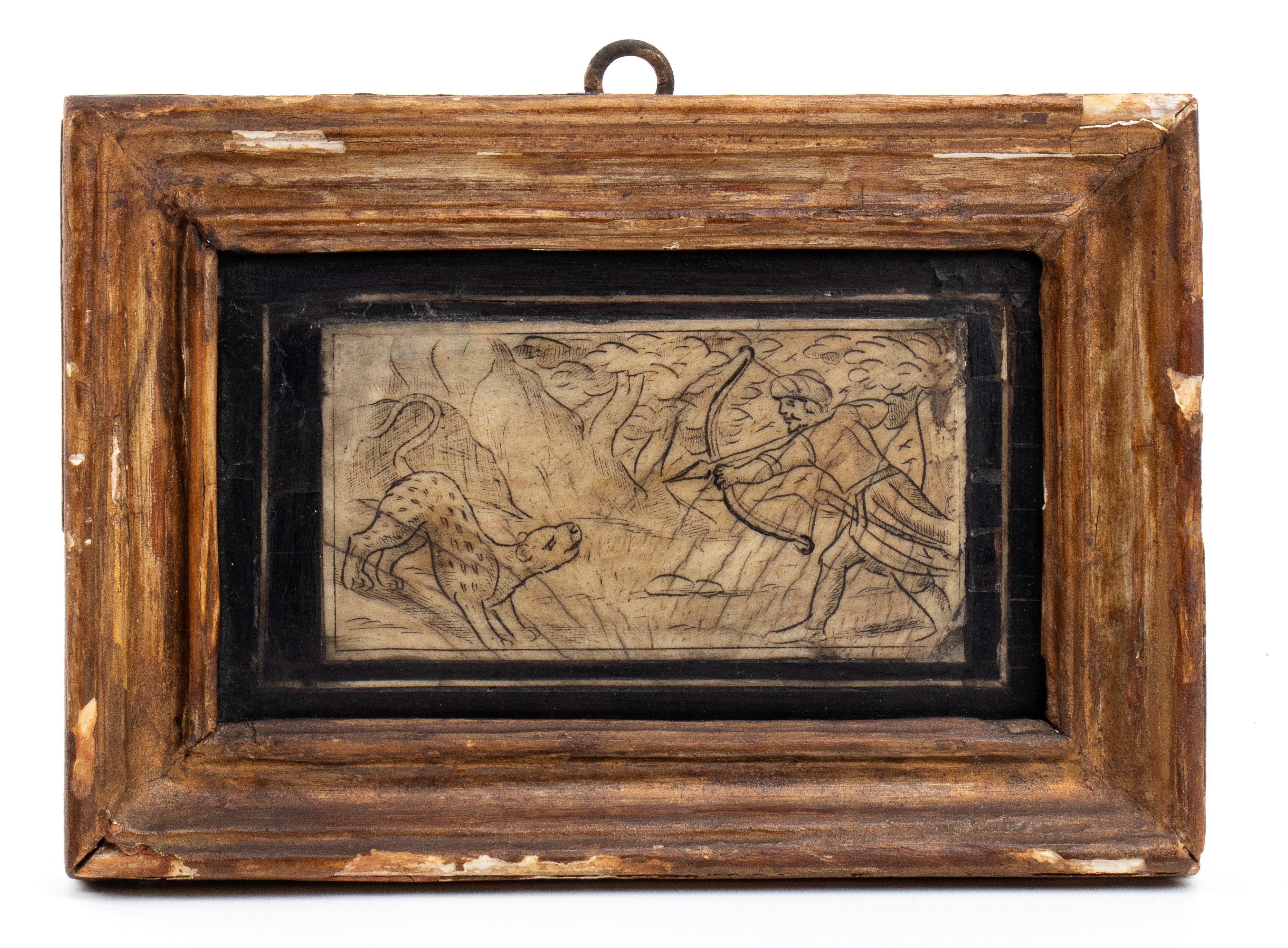 Rara placca in osso finemente incisa, raffigurante un cacciatore nell’atto di tendere l’arco di fronte a un felino in posizione di attacco. La composizione, delineata con tratto sottile e fitto tratteggio lineare, presenta stilemi tipici della produzione appenninica tra tardo Rinascimento e primo Seicento, con evidenti richiami alle coeve incisioni manieriste di soggetto venatorio. Il pannello conserva la propria cornice incisa e il bordo perimetrale annerito, indizio della sua originaria funzione come elemento applicato a cofanetto o piccolo mobile d’arredo.