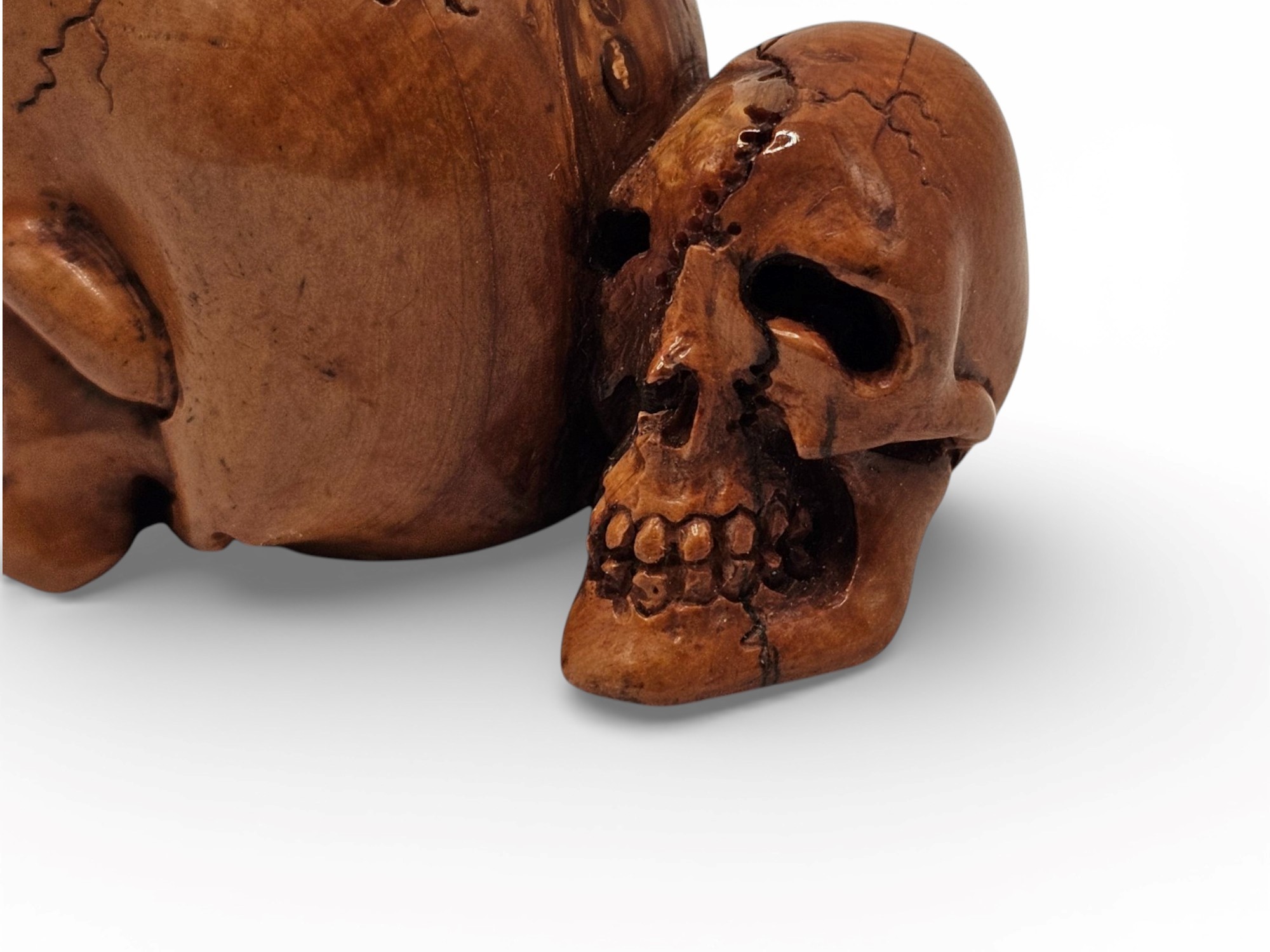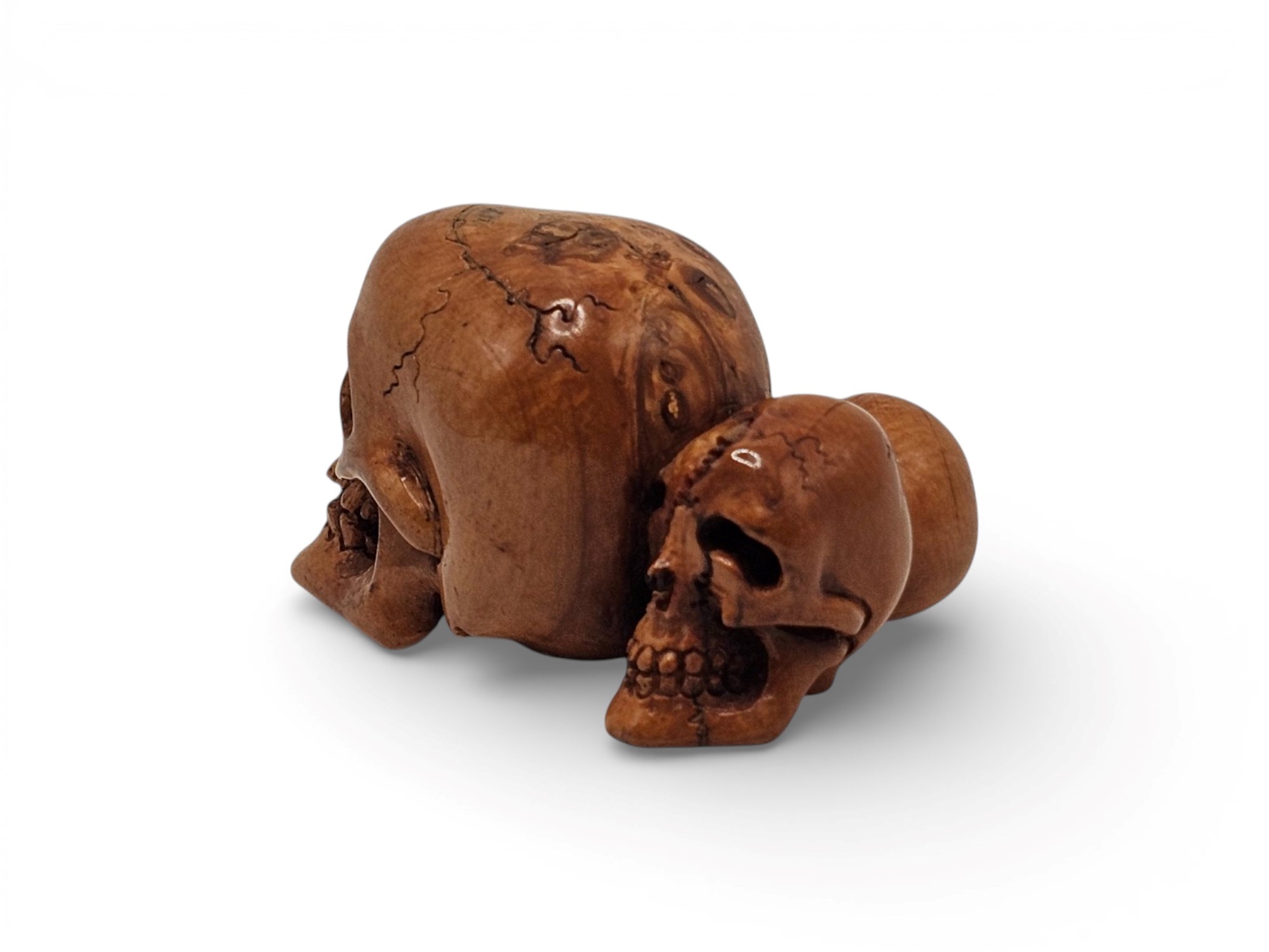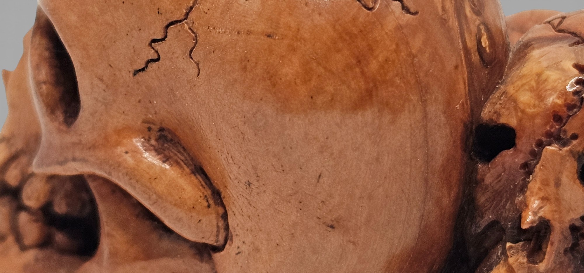 I tre crani mostrano superfici lisce, con pori e cavità rese con buon realismo. La resa naturalistica è accompagnata da un forte valore simbolico: in Giappone, il teschio è spesso associato alla transitorietà della vita, alla meditazione sul tempo e al ciclo naturale di nascita e morte, secondo una sensibilità vicina al pensiero buddhista.