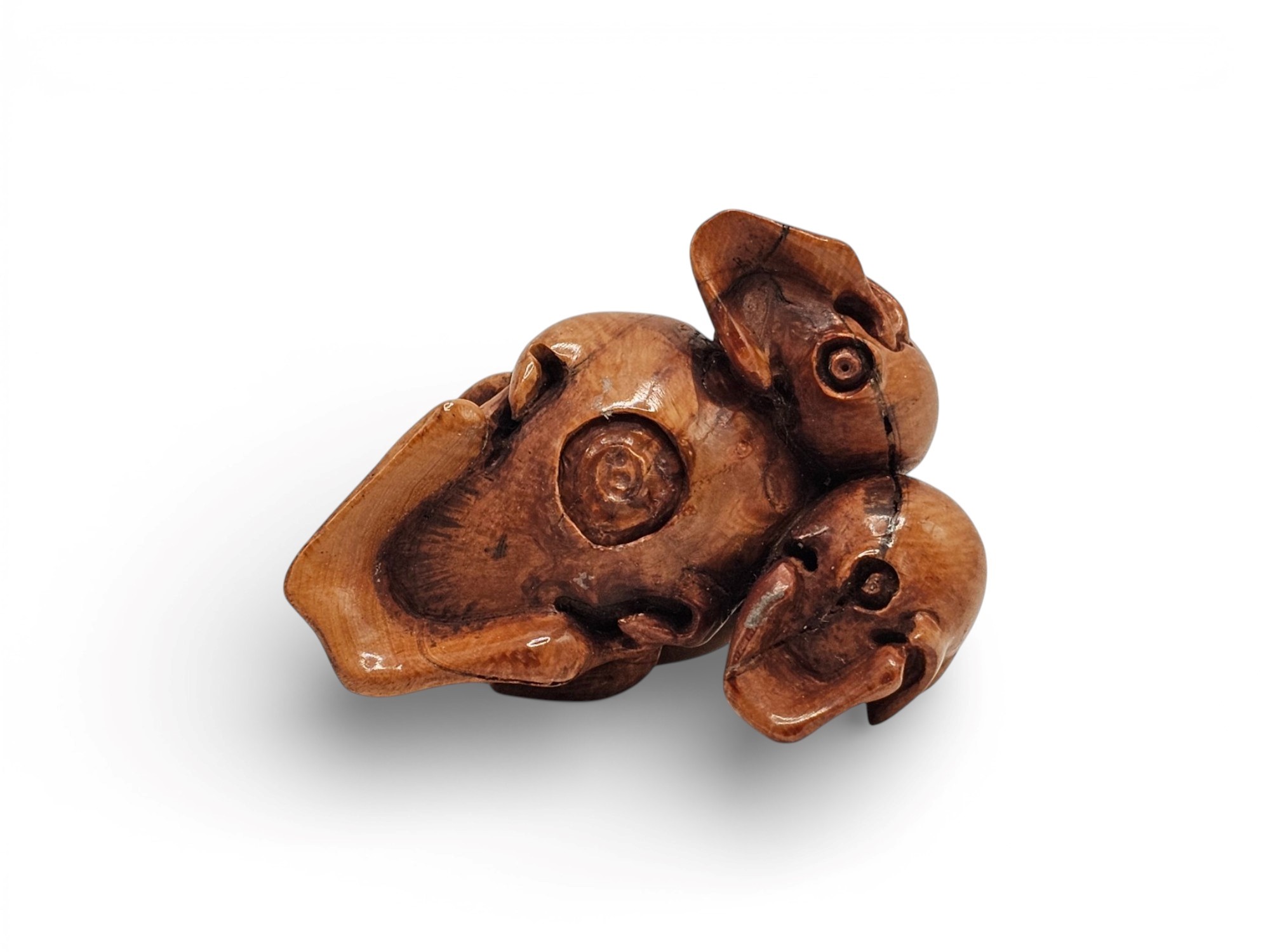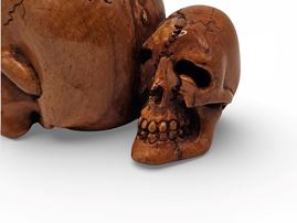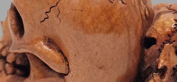 Antica scultura raffigurante tre teschi scolpiti in avorio di elefante (Elephas maximus Linnaeus, 1758 o Loxodonta africana Blumenbach, 1797), realizzati in Giappone con grande maestria artistica durante il periodo Meiji (1868-1912).