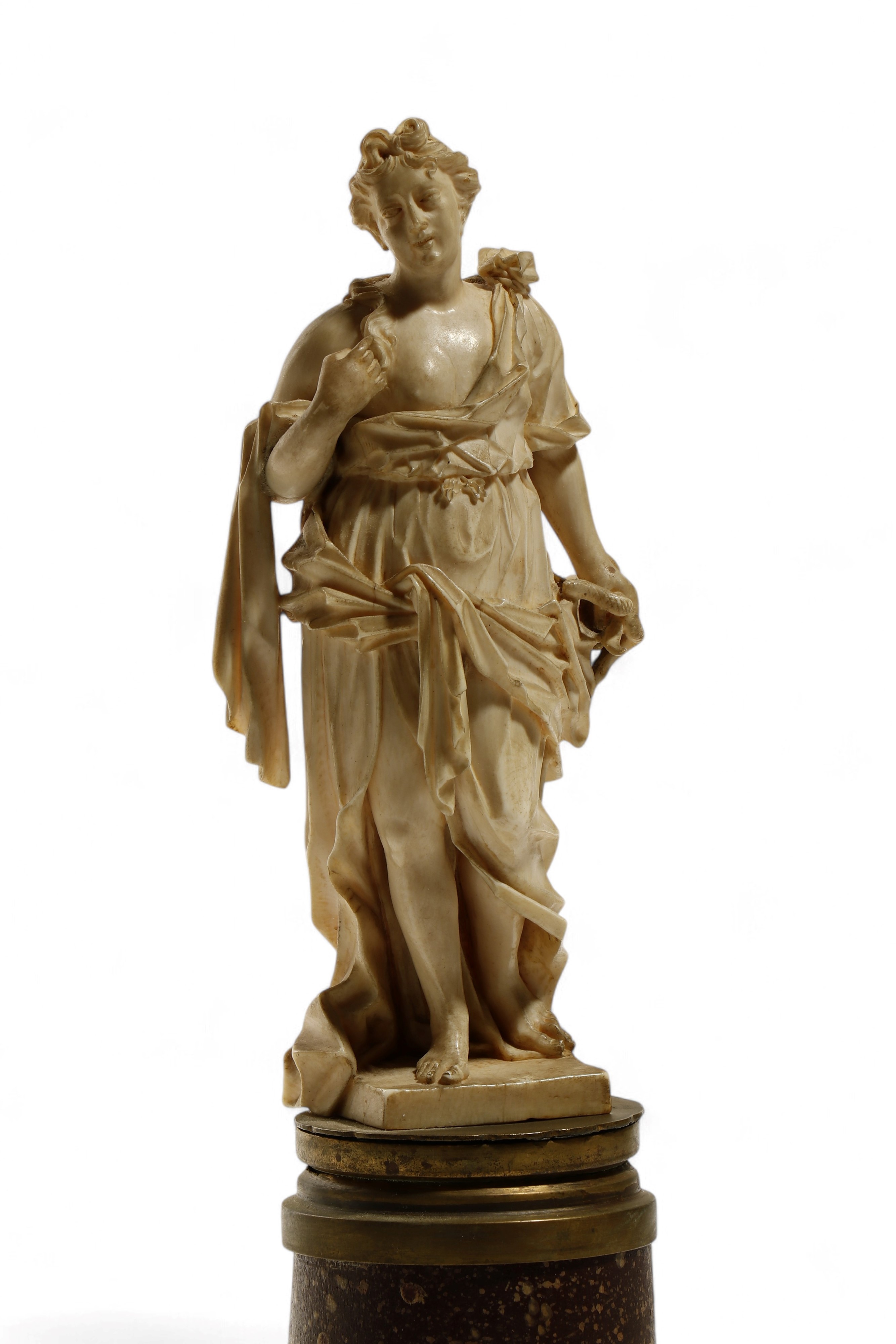 La donna è rappresentata in posizione leggermente contrapposta, con il volto inclinato e lo sguardo rivolto verso il basso, in un atteggiamento di composta eleganza. Indossa un abito drappeggiato che lascia scoperta parte del busto e crea un movimento fluido di pieghe e incroci, scolpiti per esaltare la morbidezza della materia e della figura. Nella mano sinistra regge un serpente, elemento iconografico significativo che orienta l’interpretazione del soggetto verso una figura allegorica. Il serpente, nella cultura simbolica occidentale, può rappresentare la conoscenza, la saggezza antica, oppure la prudenza intesa come virtù razionale. La figura potrebbe rappresentare un’allegoria della Sapienza o della Prudenza, due personificazioni femminili ricorrenti tra Barocco e Rococò. Il serpente simboleggia in entrambi i casi la conoscenza e il discernimento, secondo una simbologia classica ampiamente diffusa in ambito allegorico.