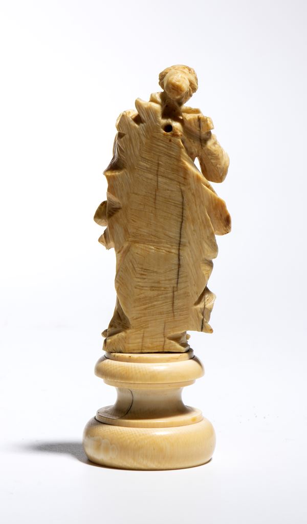 La scultura poggia su un basamento in avorio tornito che ne sottolinea il carattere di oggetto devozionale privato.
