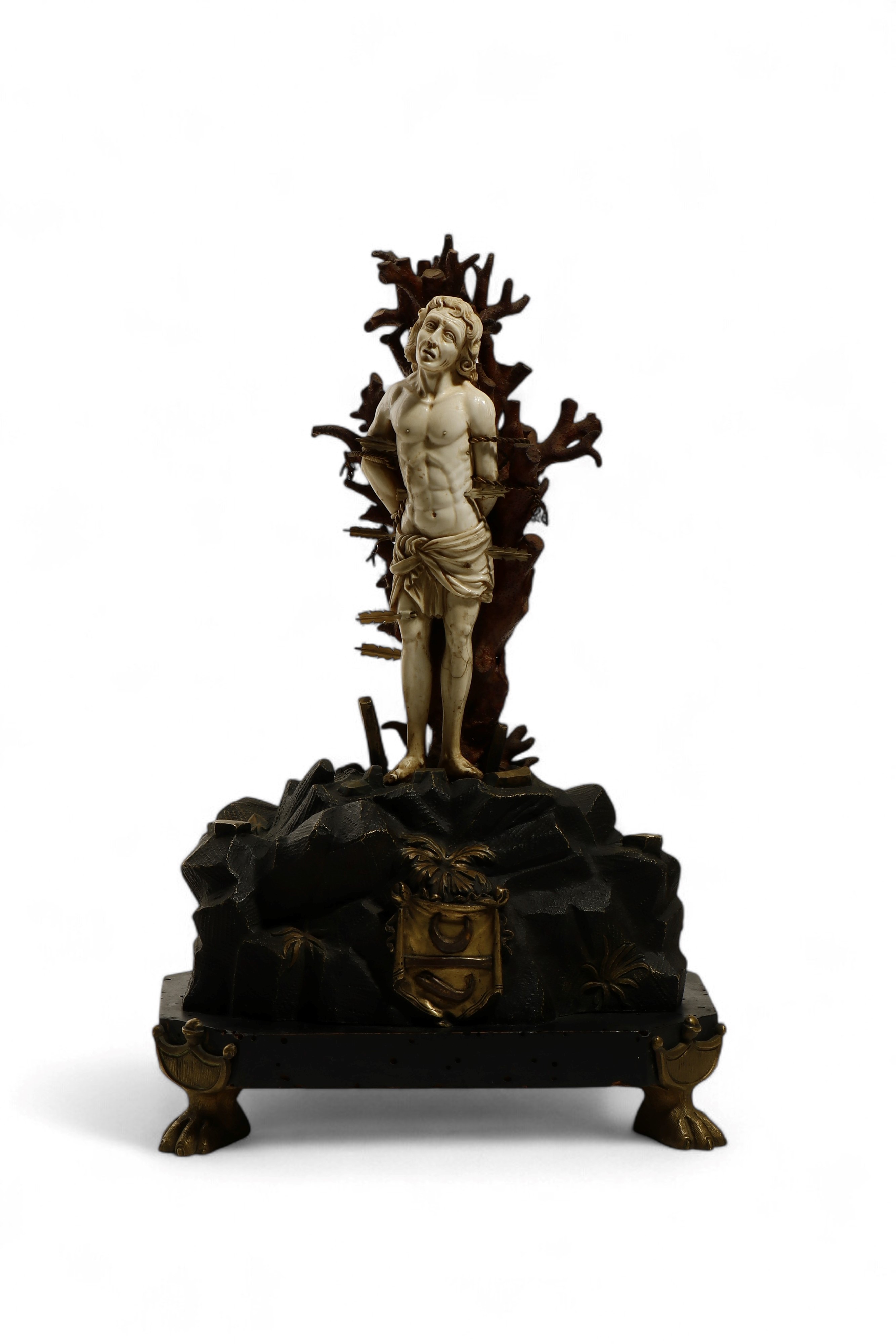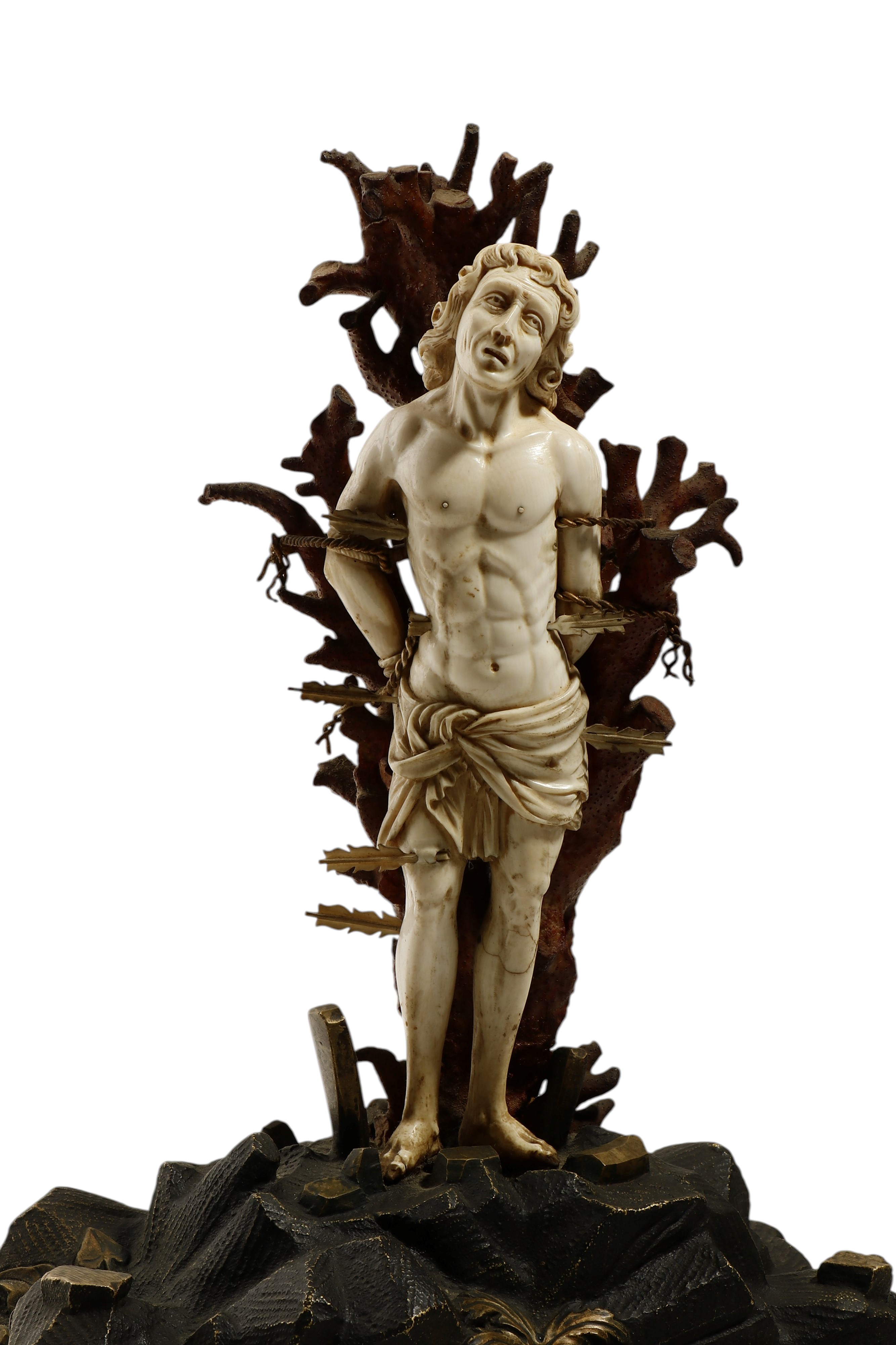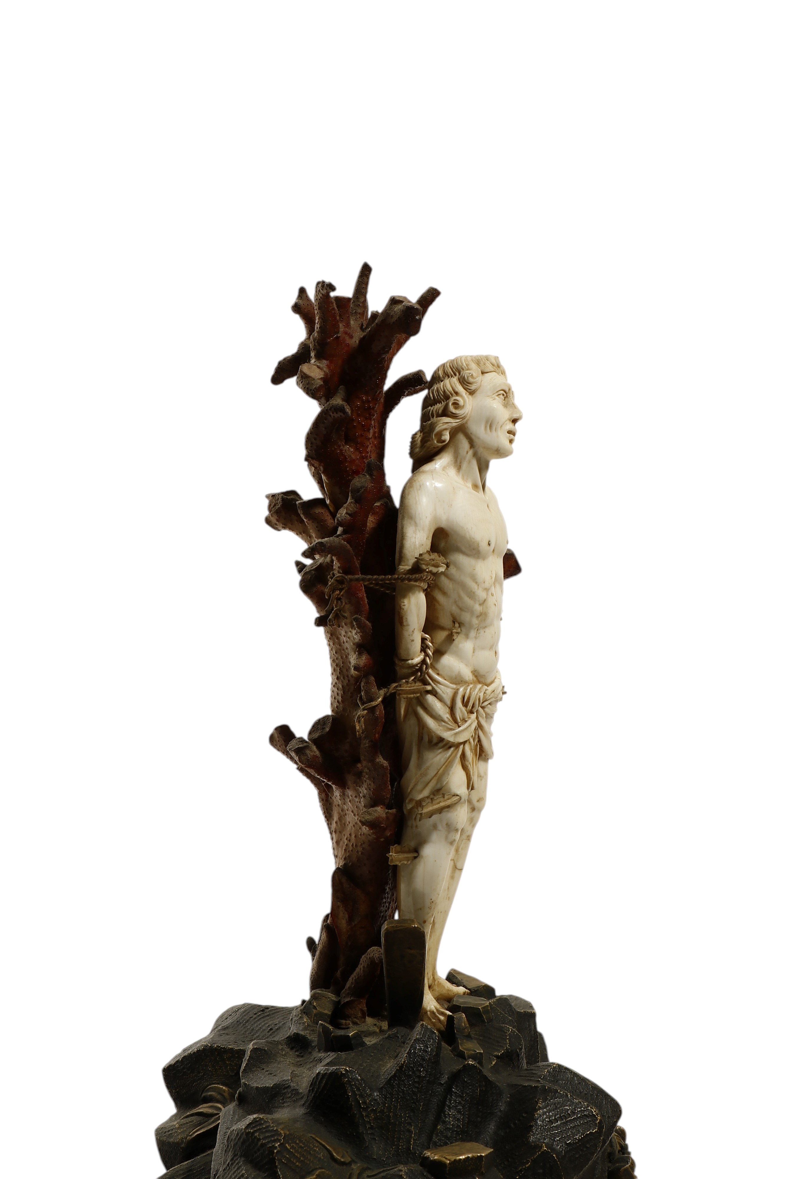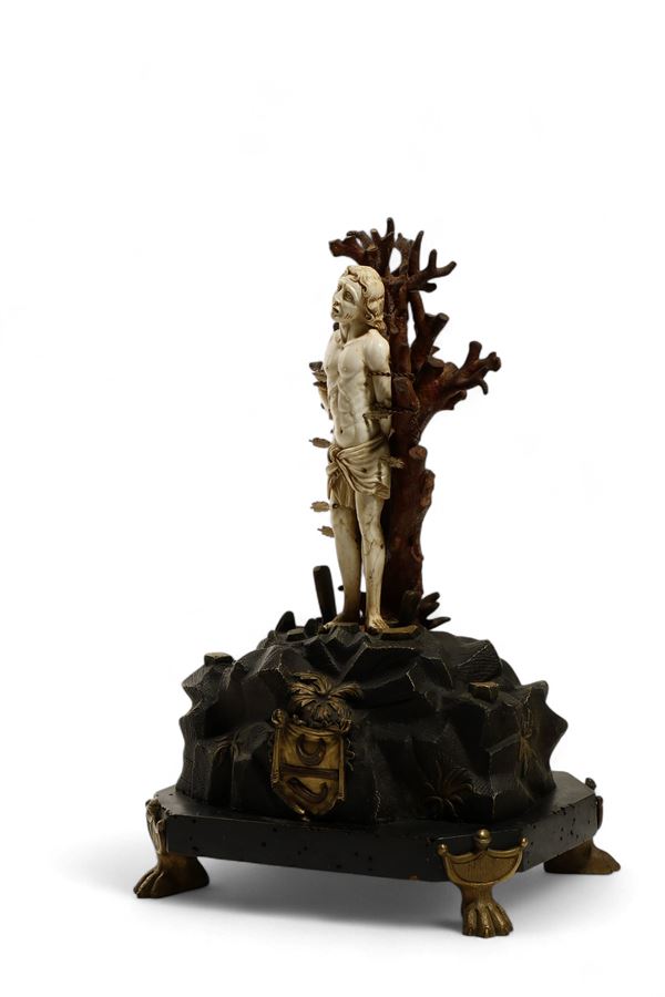 Antica scultura in avorio di elefante (Elephas maximus Linnaeus, 1758 or Loxodonta africana Blumenbach, 1797) finemente scolpita a tutto tondo raffigurante San Sebastiano legato ad una colonna di finto corallo.