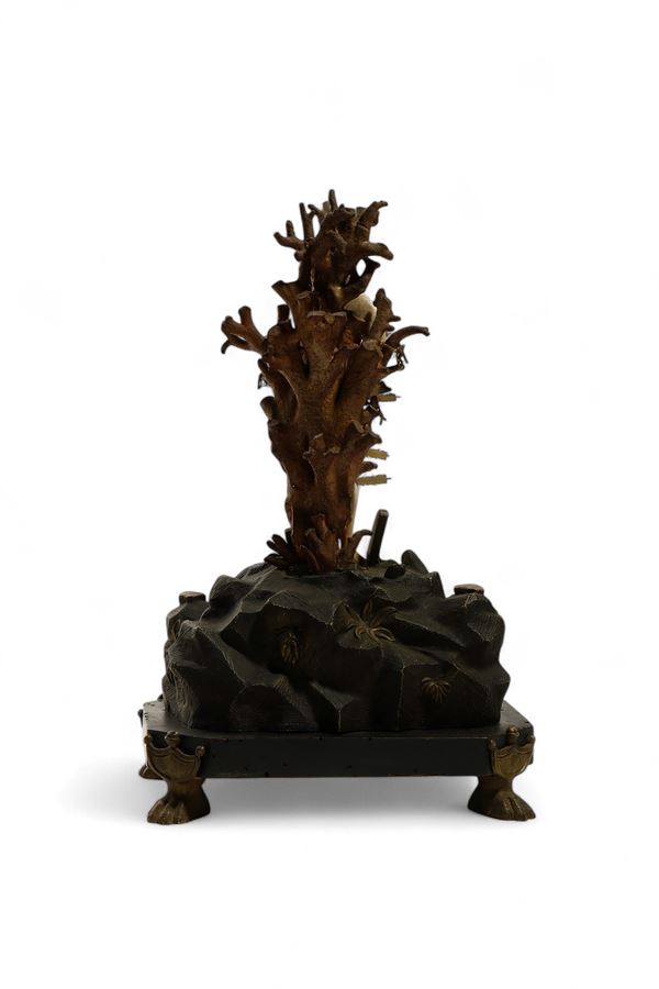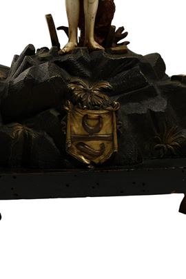 La base, in legno ebanizzato, presenta un paesaggio roccioso scolpito e applicazioni in metallo dorato: ai lati motivi vegetali e negli angoli piedi leonini. Frontalmente, al centro della base è presente uno scudo araldico non identificato con una mezzaluna crescente rivolta verso l’alto (in capo), una fascia orizzontale (al centro) e un pesce in posizione orizzontale nuotante, forse un delfino stilizzato o un luccio (in punta). E’ plausibile che lo scudo sia emblematico/decorativo (non un’arma registrata), composto con simboli devozionali: mezzaluna (mariana) e pesce (simbolo cristiano).