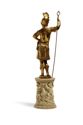 L’accostamento prezioso di metallo dorato e avorio indica una destinazione di lusso legata alle collezioni nobiliari o alle Wunderkammern; per stile e iconografia l’opera può essere collocata tra la fine del XVI e il XVII secolo e ricondotta alle botteghe dell’area germanica o austriaca, attive nella produzione di piccole sculture allegoriche e celebrative destinate al collezionismo aristocratico.