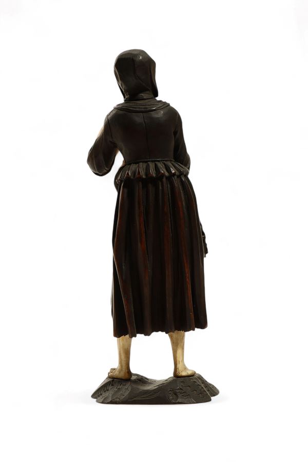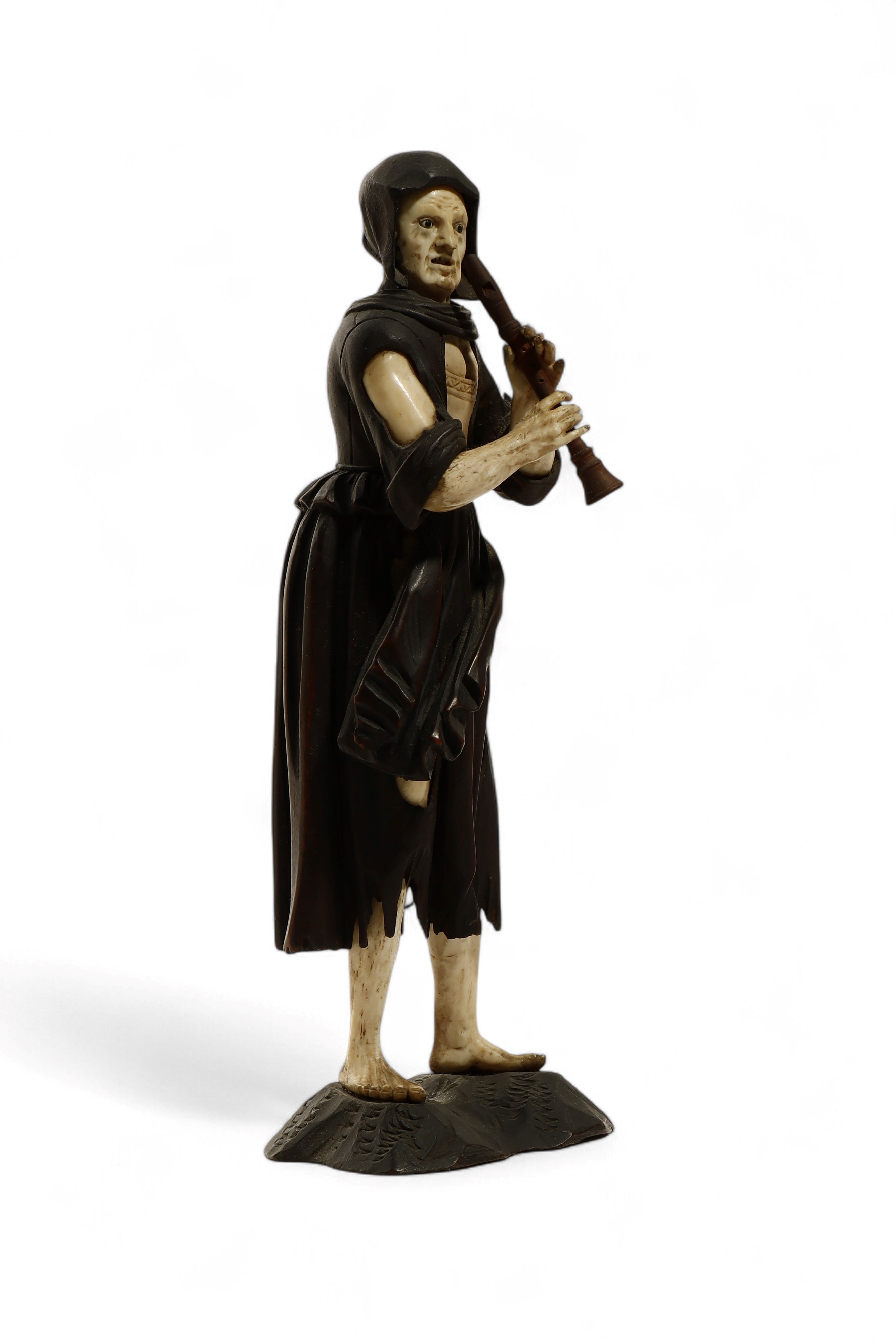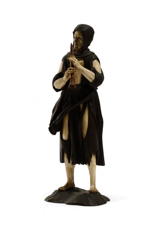 Antica scultura in legno di tiglio e avorio di elefante (Elephas maximus Linnaeus, 1758 o Loxodonta africana Blumenbach, 1797), scolpita a tutto tondo a raffigurare una figura di musicista mendicante che suona uno strumento a fiato popolare simile a un piffero o una ciaramella. Il volto, le mani e le gambe sono scolpiti in avorio, mentre l’abbigliamento logoro e la base sono in legno. La figura, scalza e resa con grande realismo ed espressività, presenta un forte contrasto cromatico tra i materiali, che accentua l’intensità drammatica dell’espressione. Nel contesto del XVIII secolo, rappresentazioni di mendicanti avevano anche un valore morale e simbolico, legato a temi di carità, compassione e riflessione sulla fragilità umana. L’opera è attribuibile allo scultore tirolese Simon Troger o alla sua cerchia, noto per la maestria nella lavorazione combinata di avorio e legno e per la resa estremamente realistica delle figure.