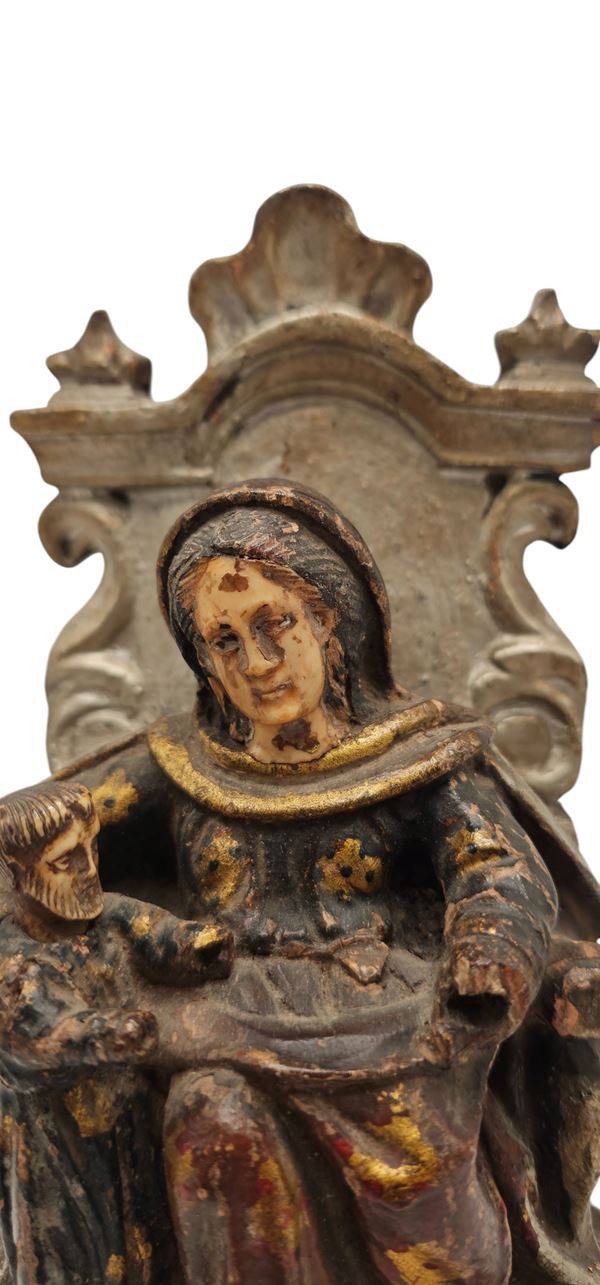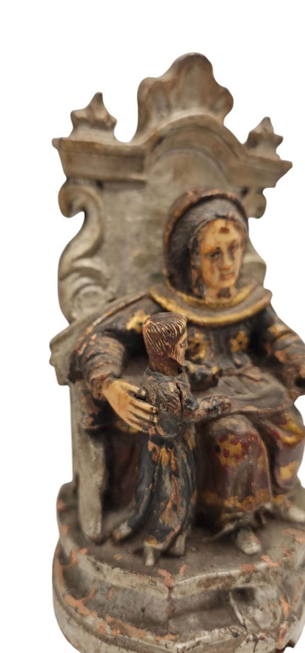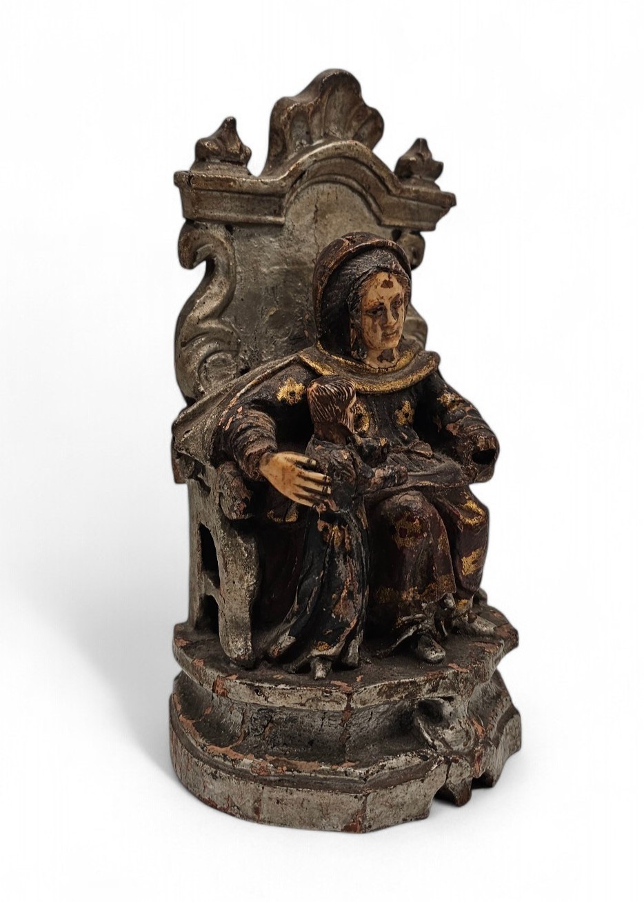 La composizione presenta al centro una figura femminile con nimbo, probabilmente Sant’Anna, seduta su un trono decorato, con il velo che incornicia il volto scolpito in avorio. Alla sua sinistra si nota una figura più piccola, probabilmente un bambino, anch’egli reso con notevole dettaglio.