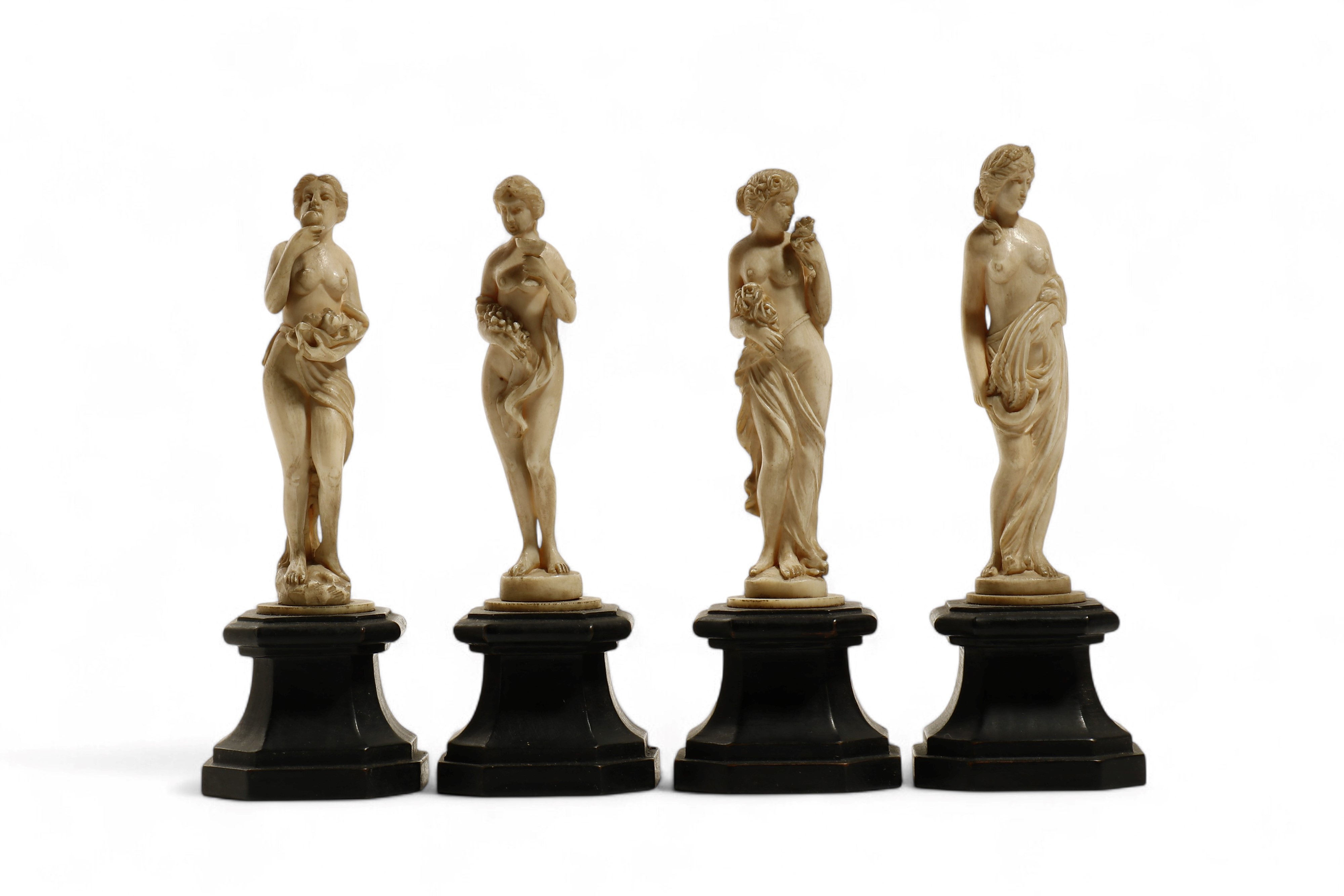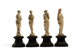 Antico gruppo di quattro sculture in avorio di elefante (Elephas maximus Linnaeus, 1758 or Loxodonta africana Blumenbach, 1797) finemente scolpite a tutto tondo a raffigurare le quattro stagioni.