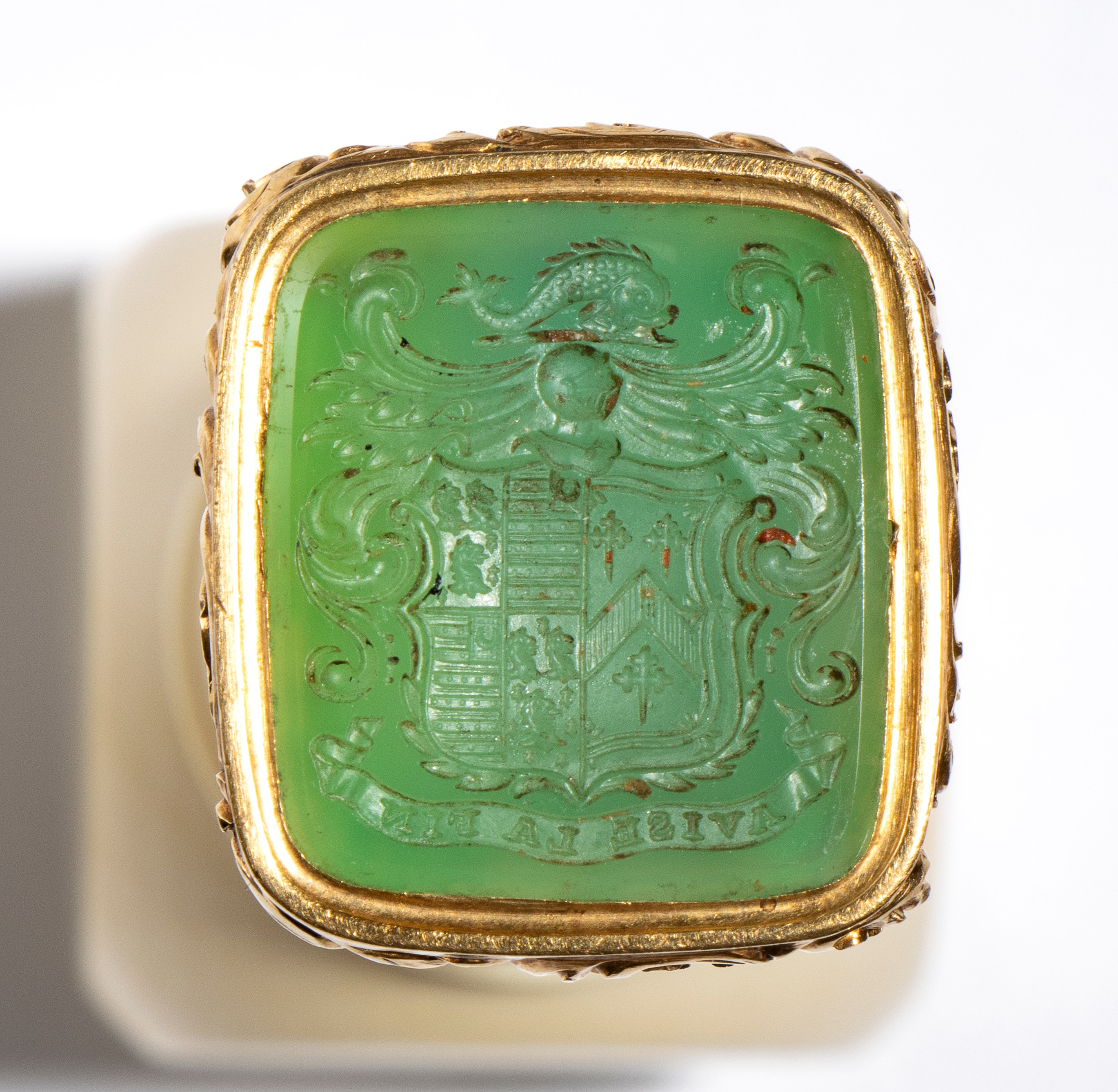 La parte superiore dell'impugnatura presenta una sagoma quasi cilindrica, leggermente schiacciata sui lati, mentre la parte inferiore è decorata da una serie di cerchi concentrici che ne allungano armoniosamente la silhouette. La base, realizzata in oro giallo, è finemente ornata da motivi a volute fogliate cesellati con maestria, tipici dell'eleganza decorativa francese dell'epoca. Il sigillo, inciso probabilmente su una giadeite, reca uno stemma araldico, suggerendo una committenza nobiliare o alto borghese.