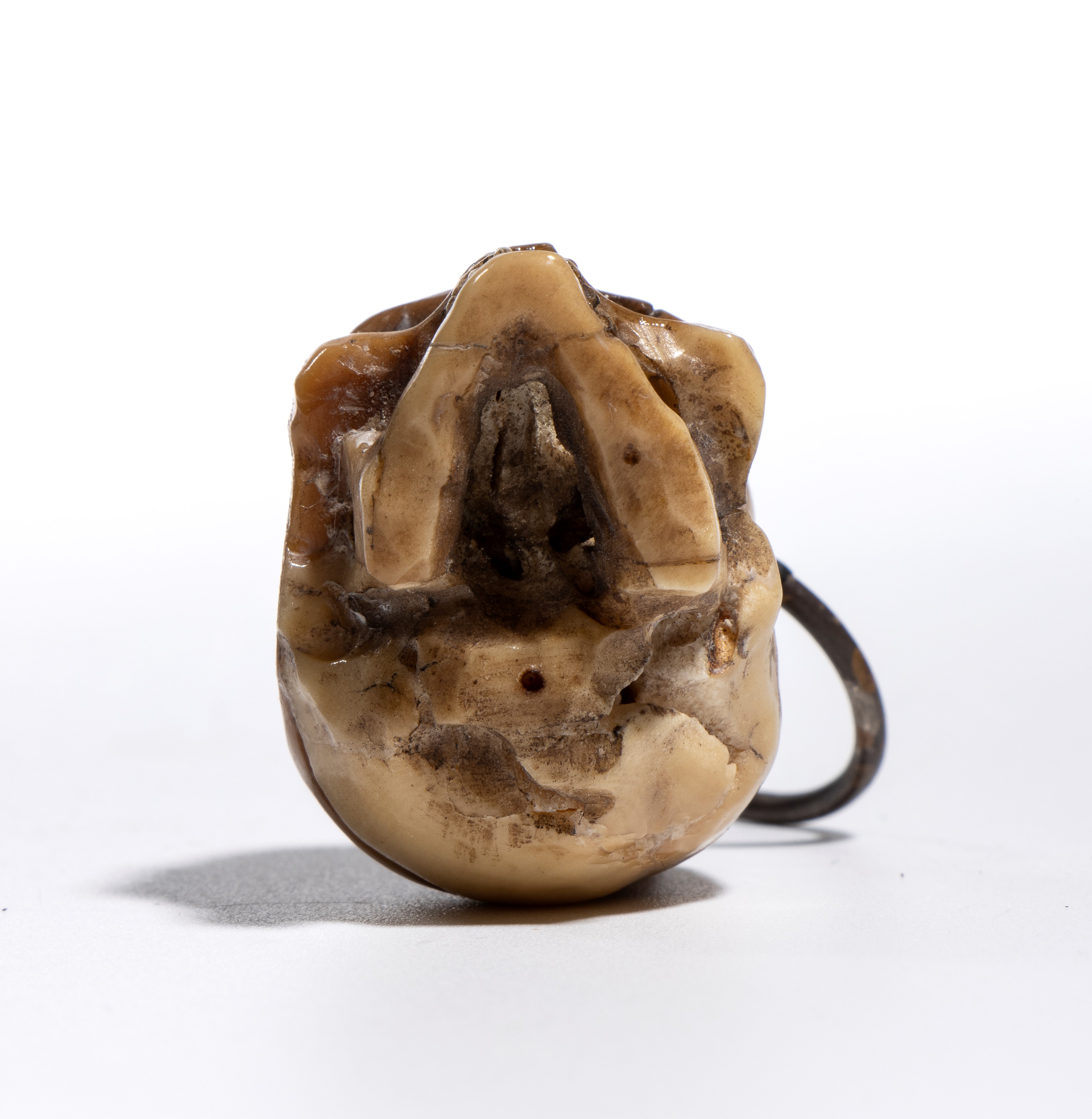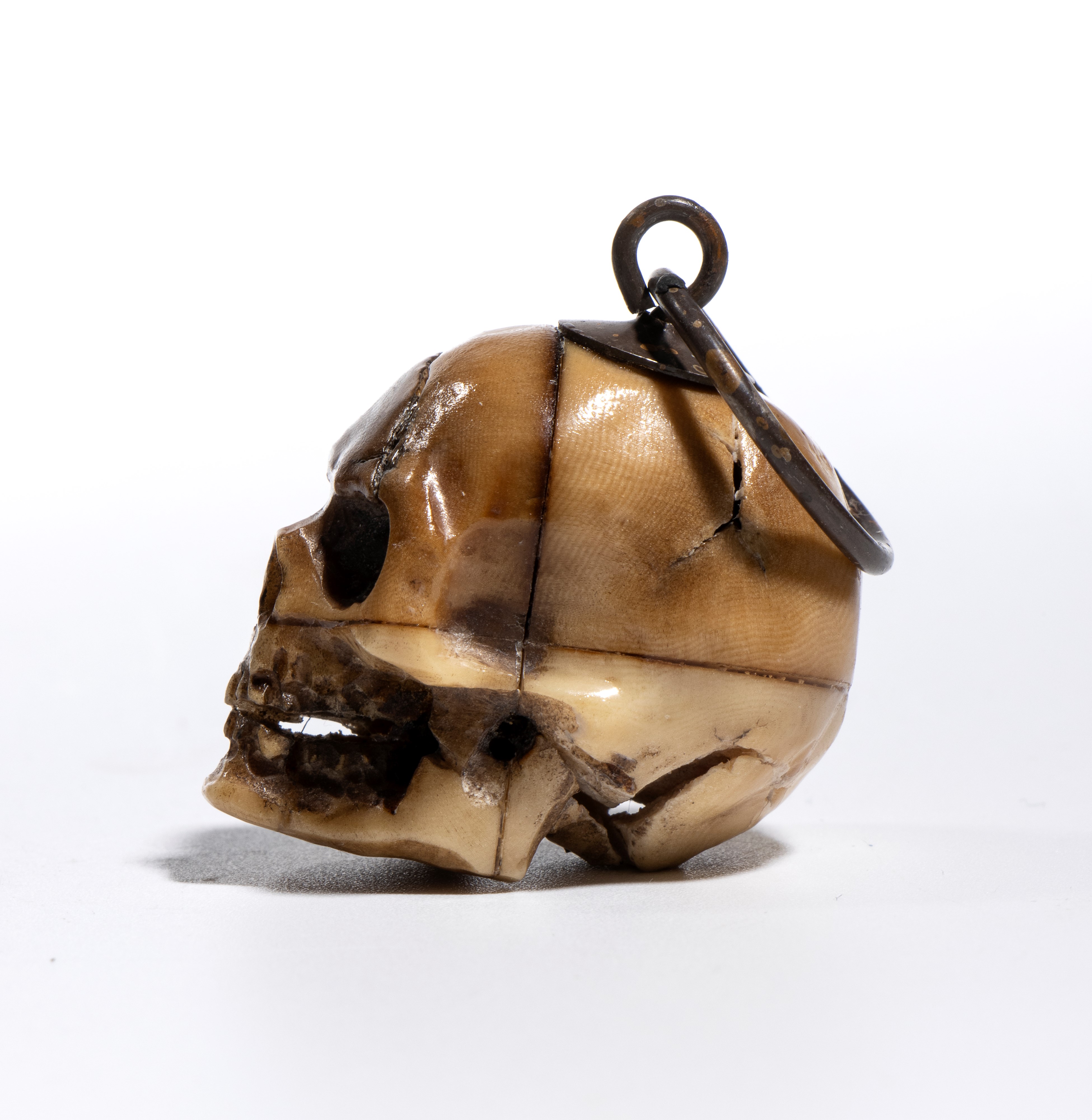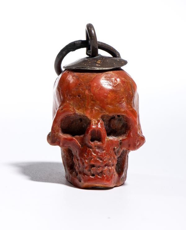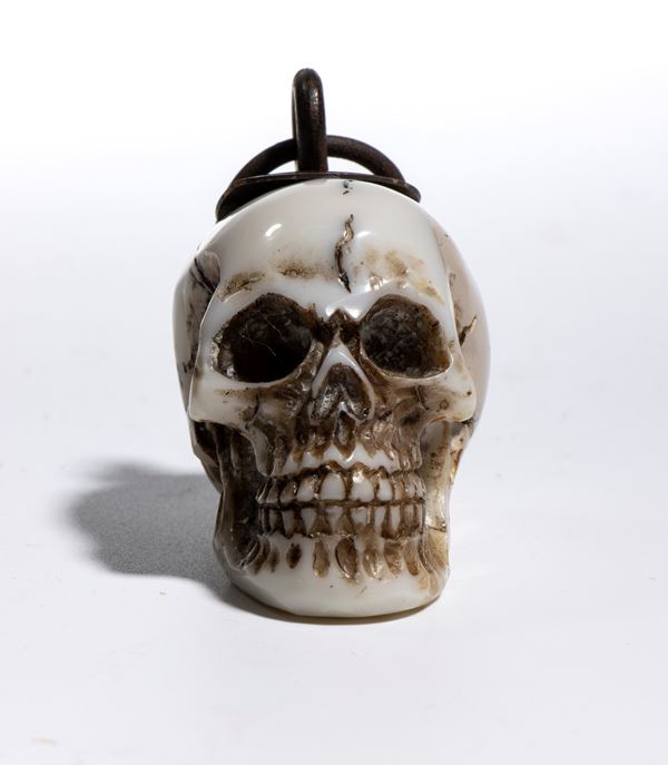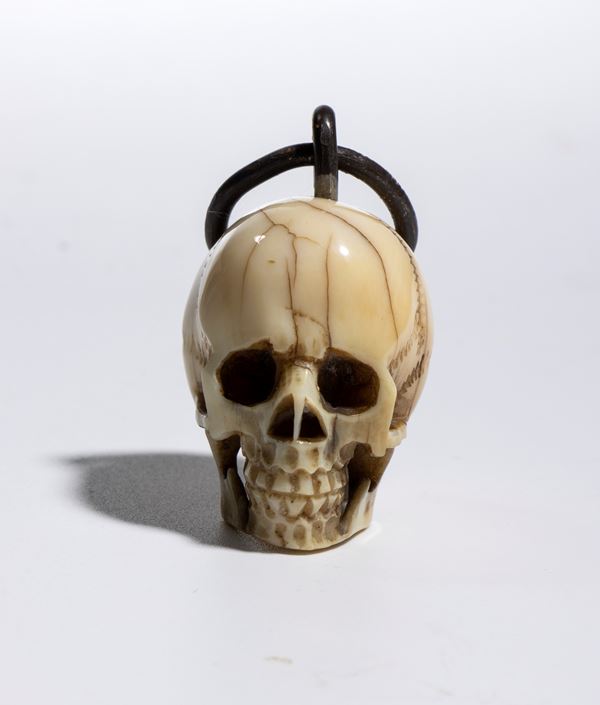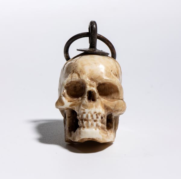 La scultura è accurata e presenta un buon livello di dettaglio. Sulla sommità del teschio è applicato un gancio da cui parte un anello dello stesso materiale, pensato per permettere l’uso come pendente o amuleto. È anche possibile interpretare questo pendente come un memento mori, cioè un oggetto simbolico che invita alla consapevolezza della mortalità umana. I memento mori erano diffusi già nel Medioevo e nel Rinascimento e venivano utilizzati per ricordare la caducità della vita, spronando a vivere con saggezza, virtù o spiritualità. Il simbolo del teschio era tra i più comuni: rappresentava la transitorietà dell’esistenza e il valore del tempo. Anche oggi, in contesti artistici o personali, un teschio indossato come gioiello può mantenere questo significato meditativo, oltre a quello estetico.