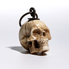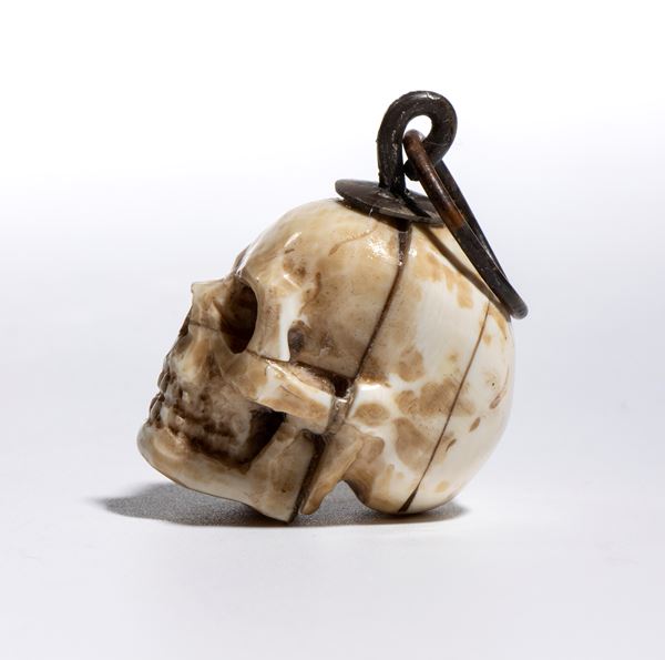 Sulla sommità del teschio è applicato un gancio da cui parte un anello dello stesso materiale, pensato per permettere l’uso come pendente o amuleto. L’insieme conserva un carattere ornamentale, più estetico che rituale.