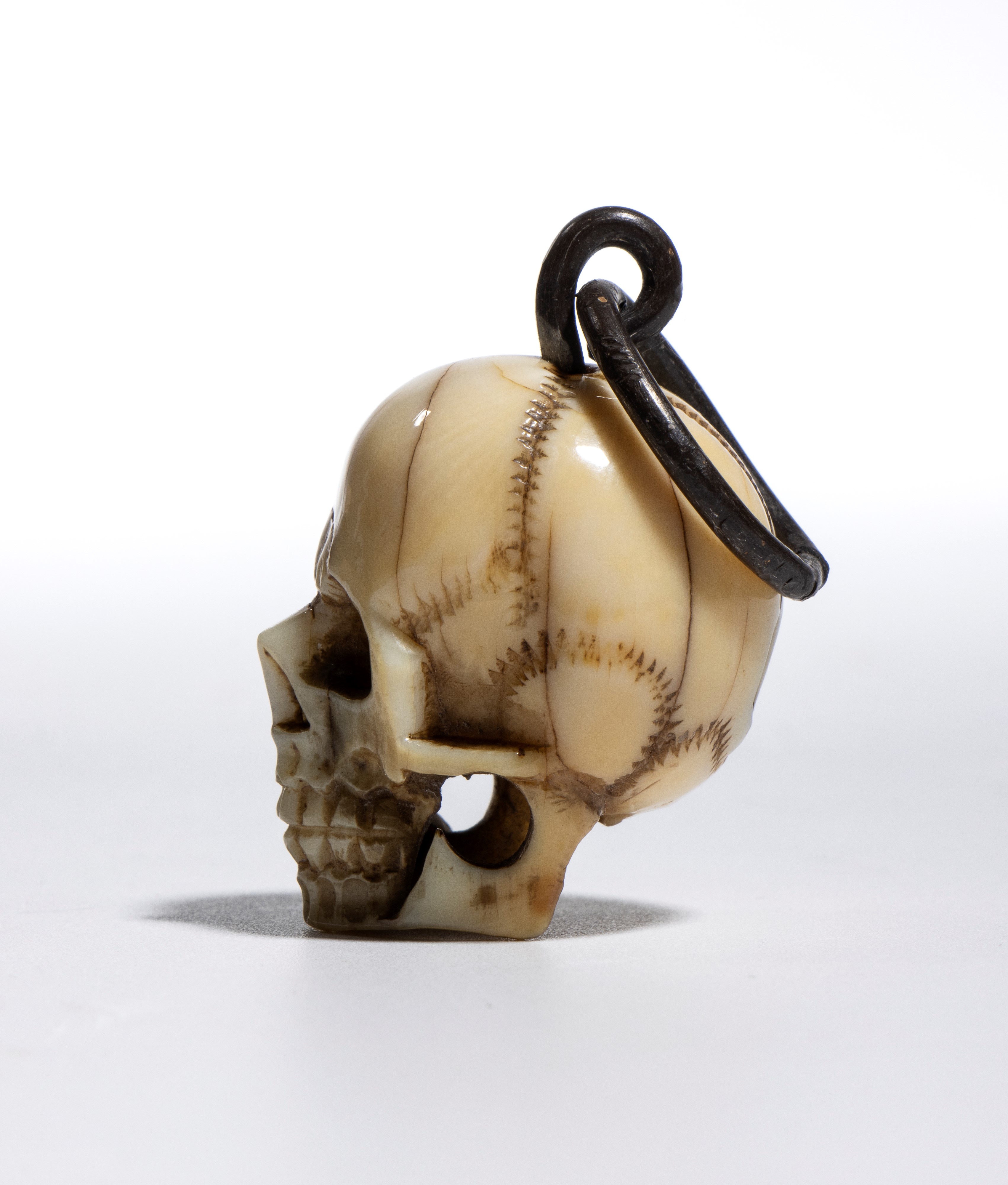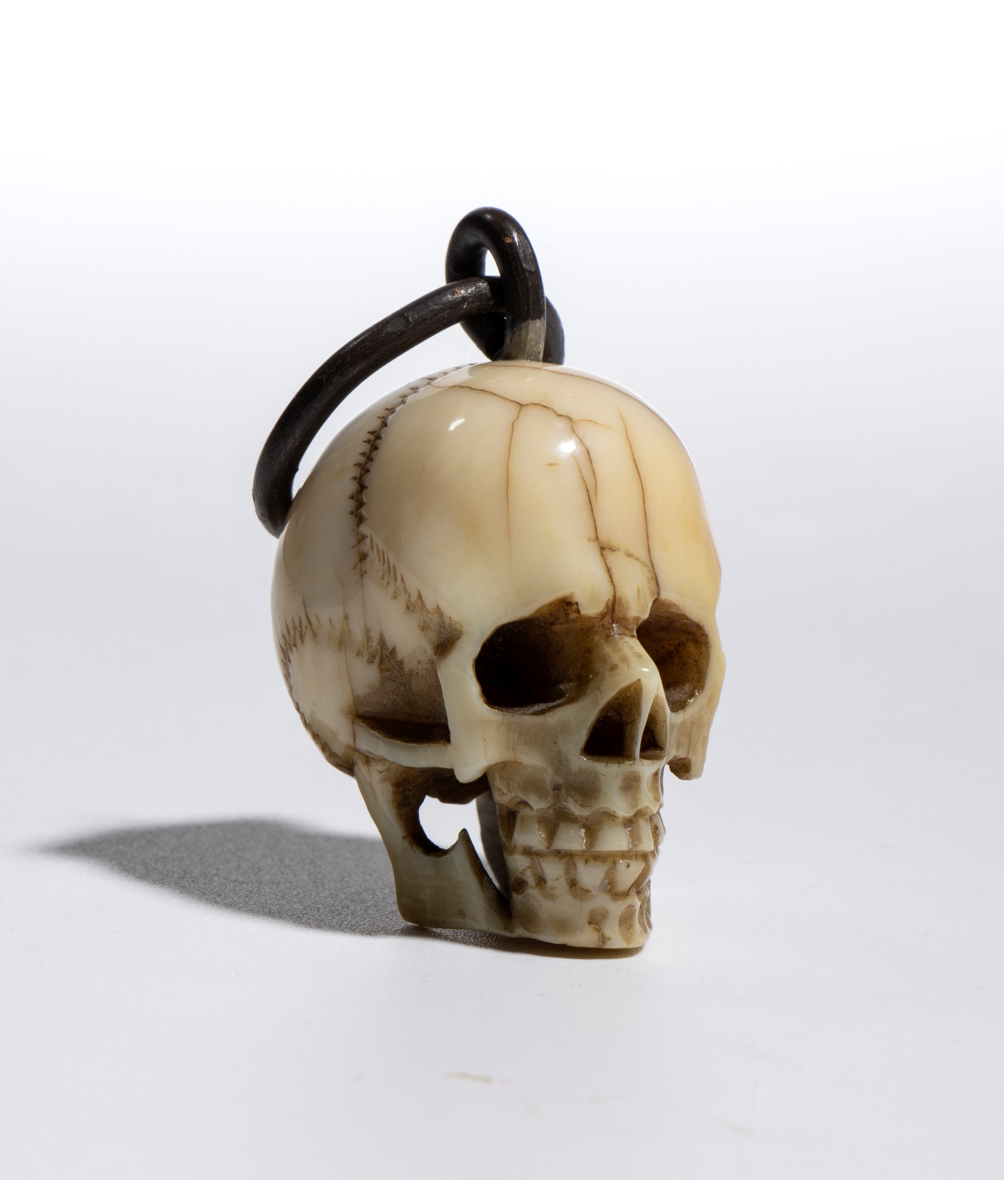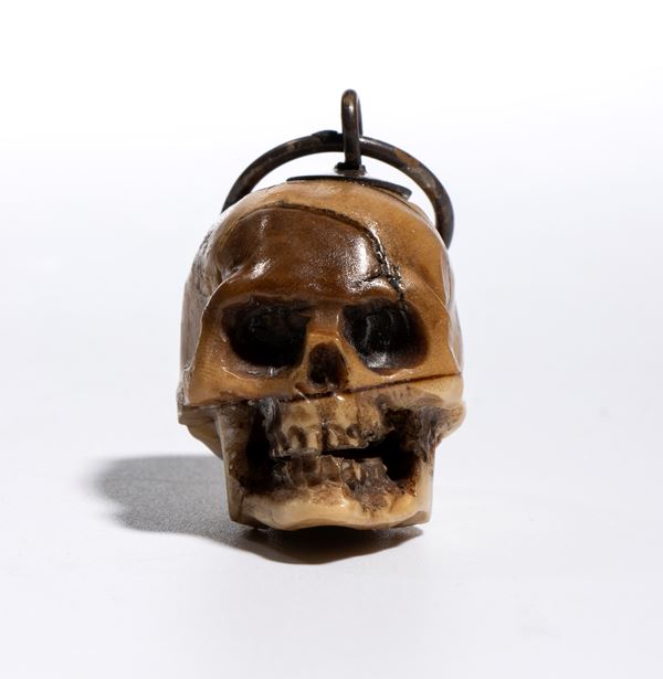 Sulla sommità del teschio è applicato un gancio da cui parte un anello dello stesso materiale, pensato per permettere l’uso come pendente o amuleto. L’insieme conserva un carattere ornamentale, più estetico che rituale.